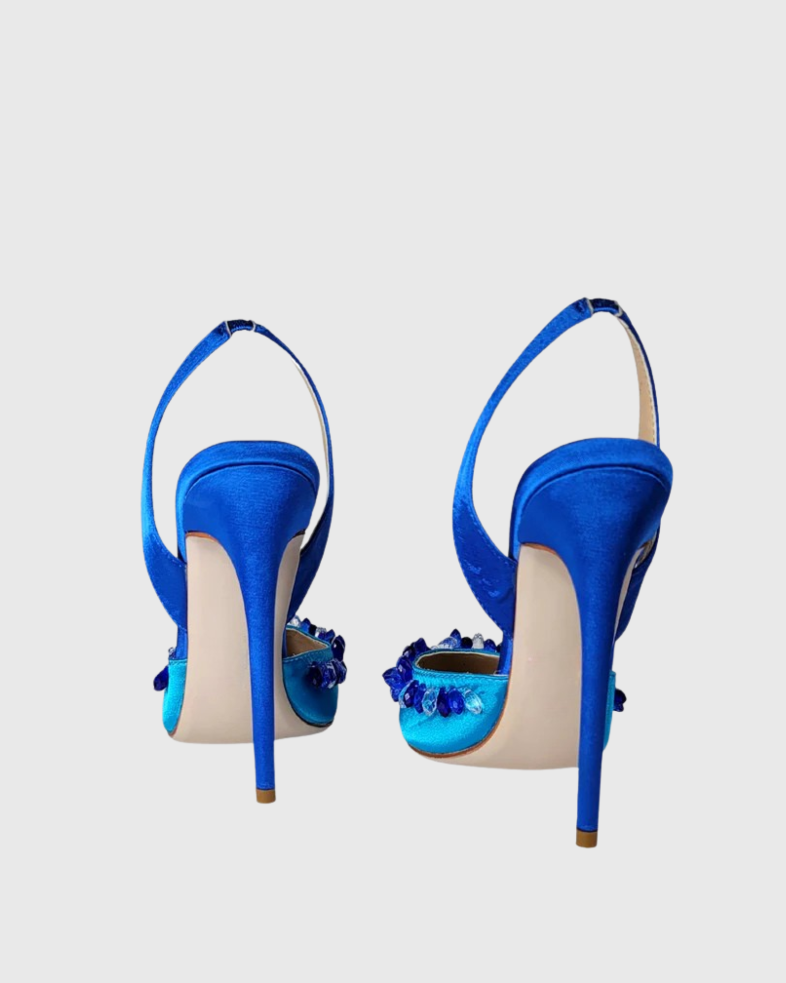 Step into elegance with Irene Rhinestone Slingback Pumps In Blue. These stunning shoes feature sparkling rhinestone details and a comfortable slingback design. Perfect for any special occasion, they will add a touch of glamour to any outfit. Say "yes" to luxury and style with Irene.