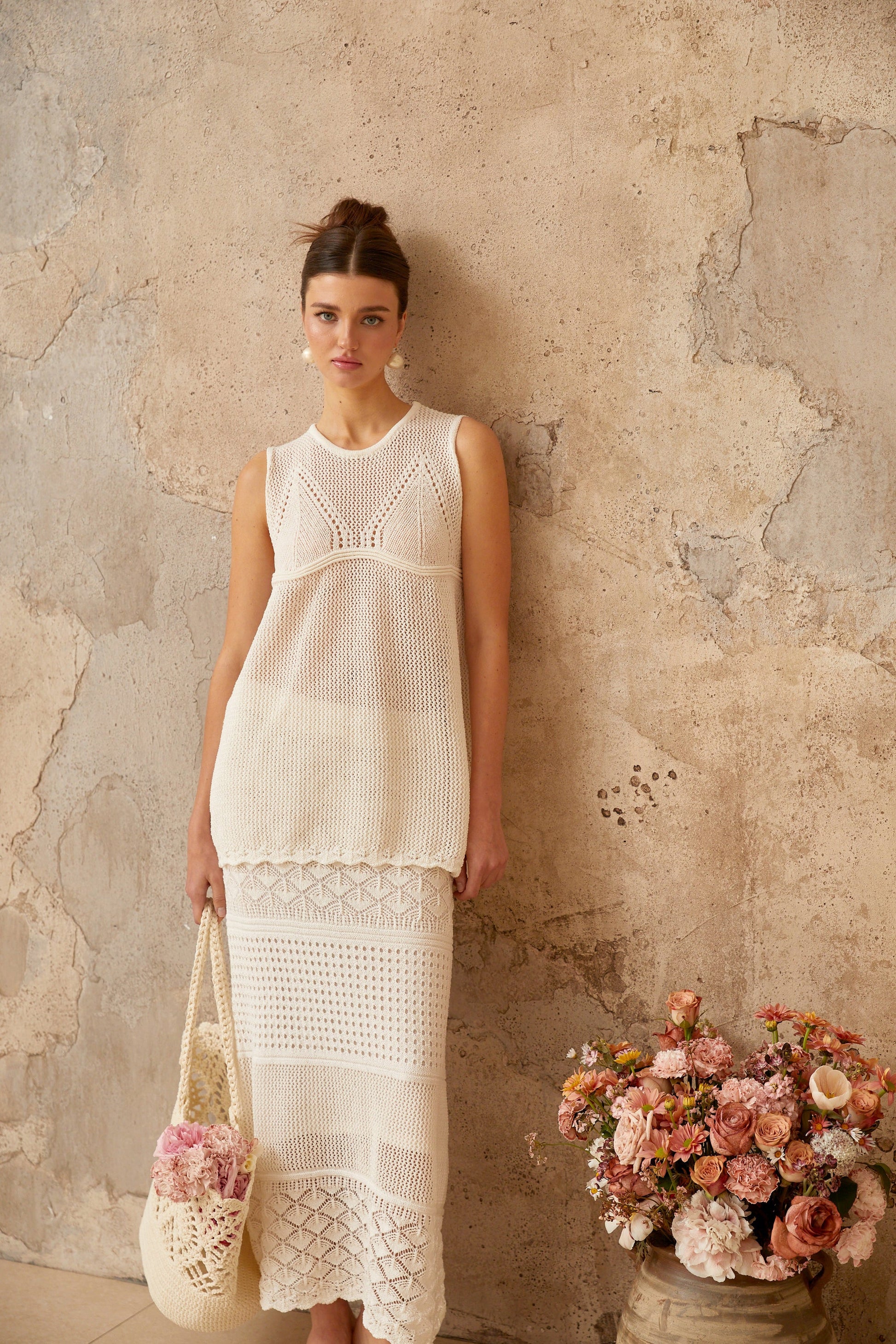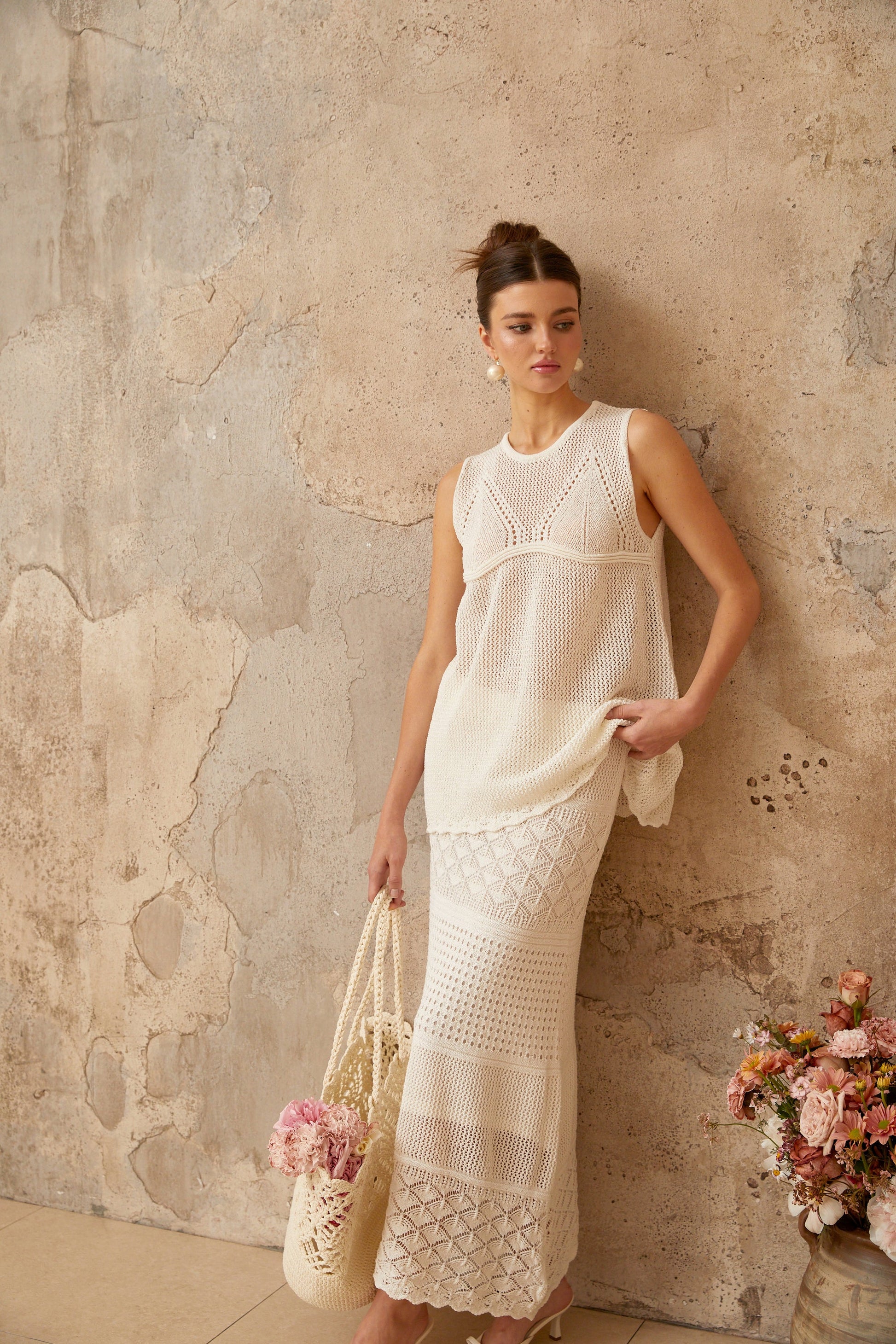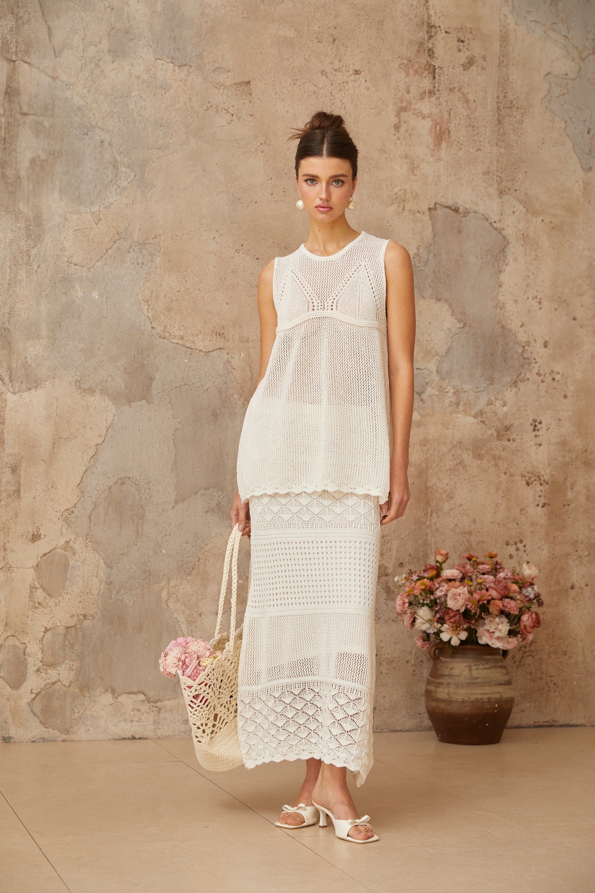 Irène White Cutout Crochet Knit Two-Piece Top and Skirt