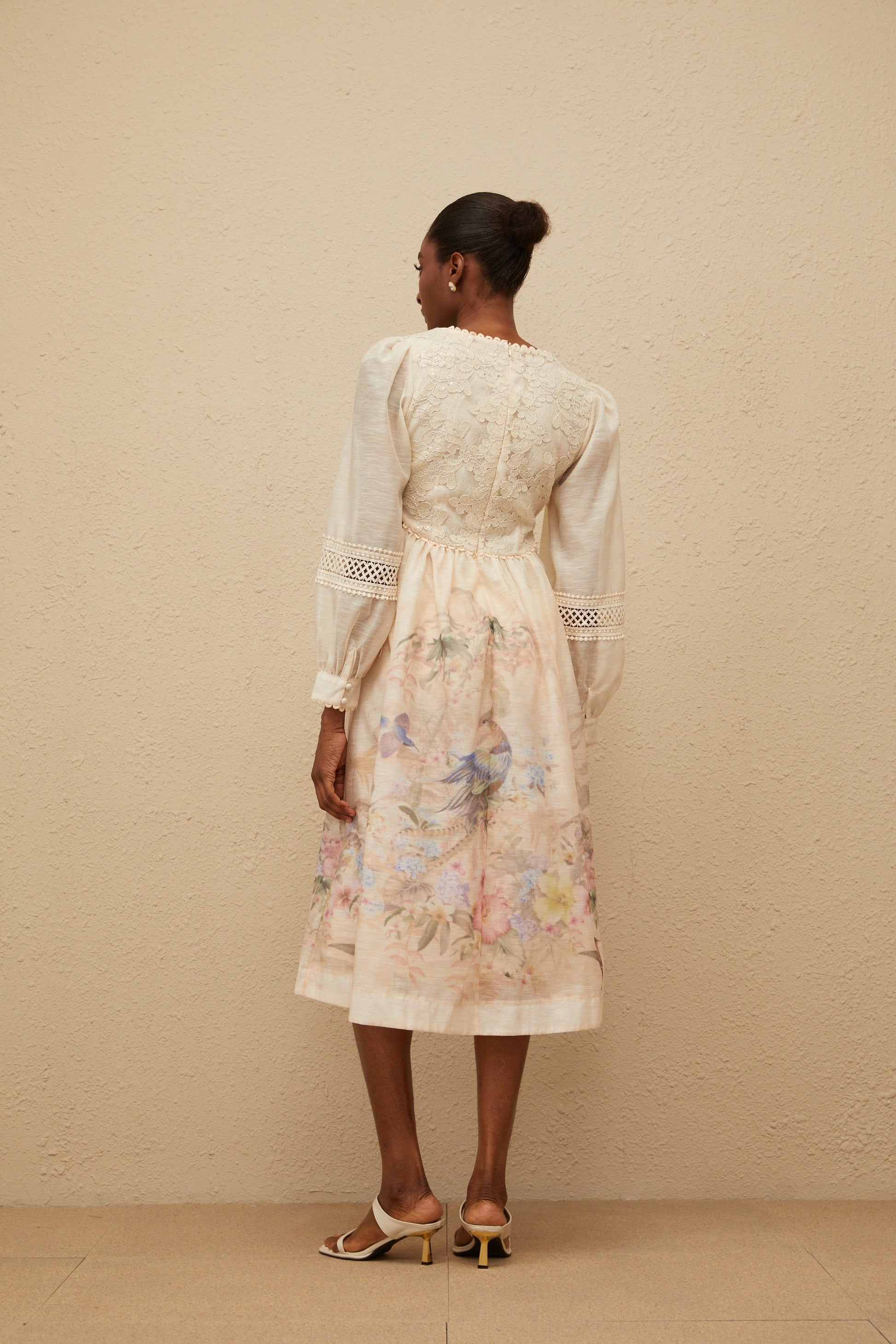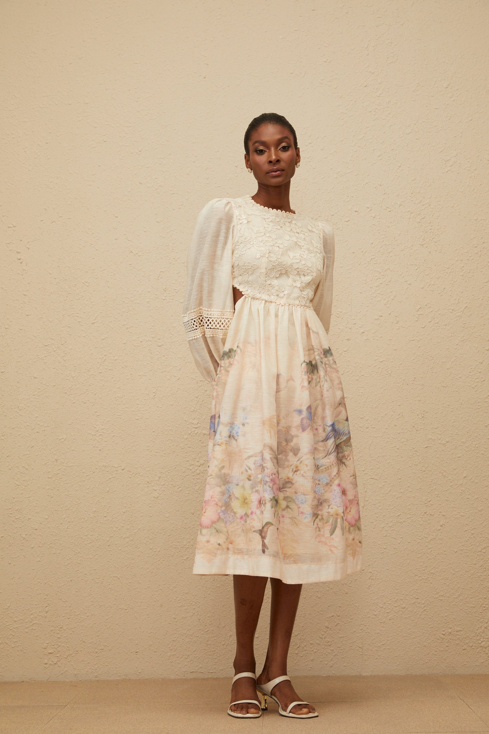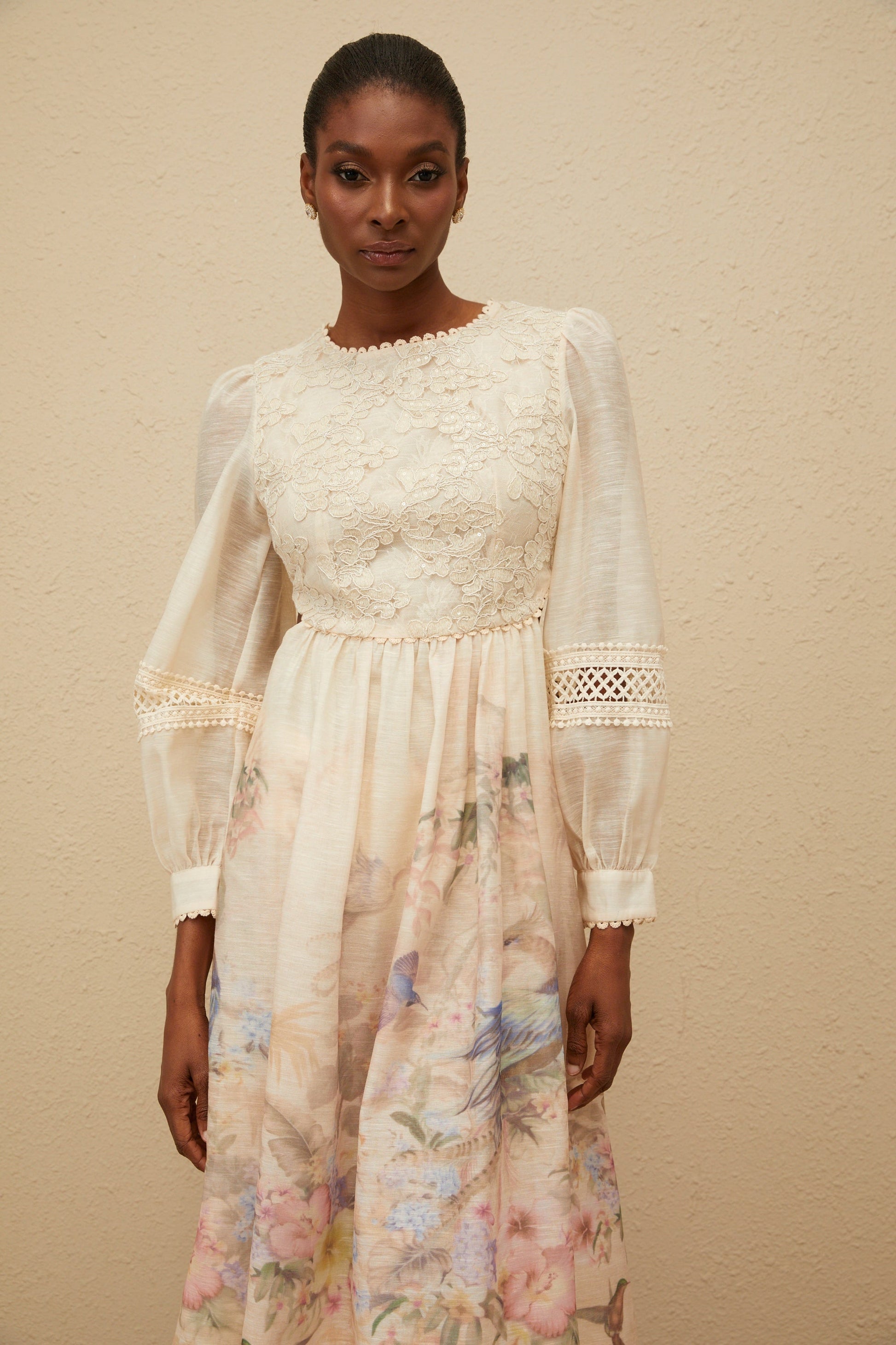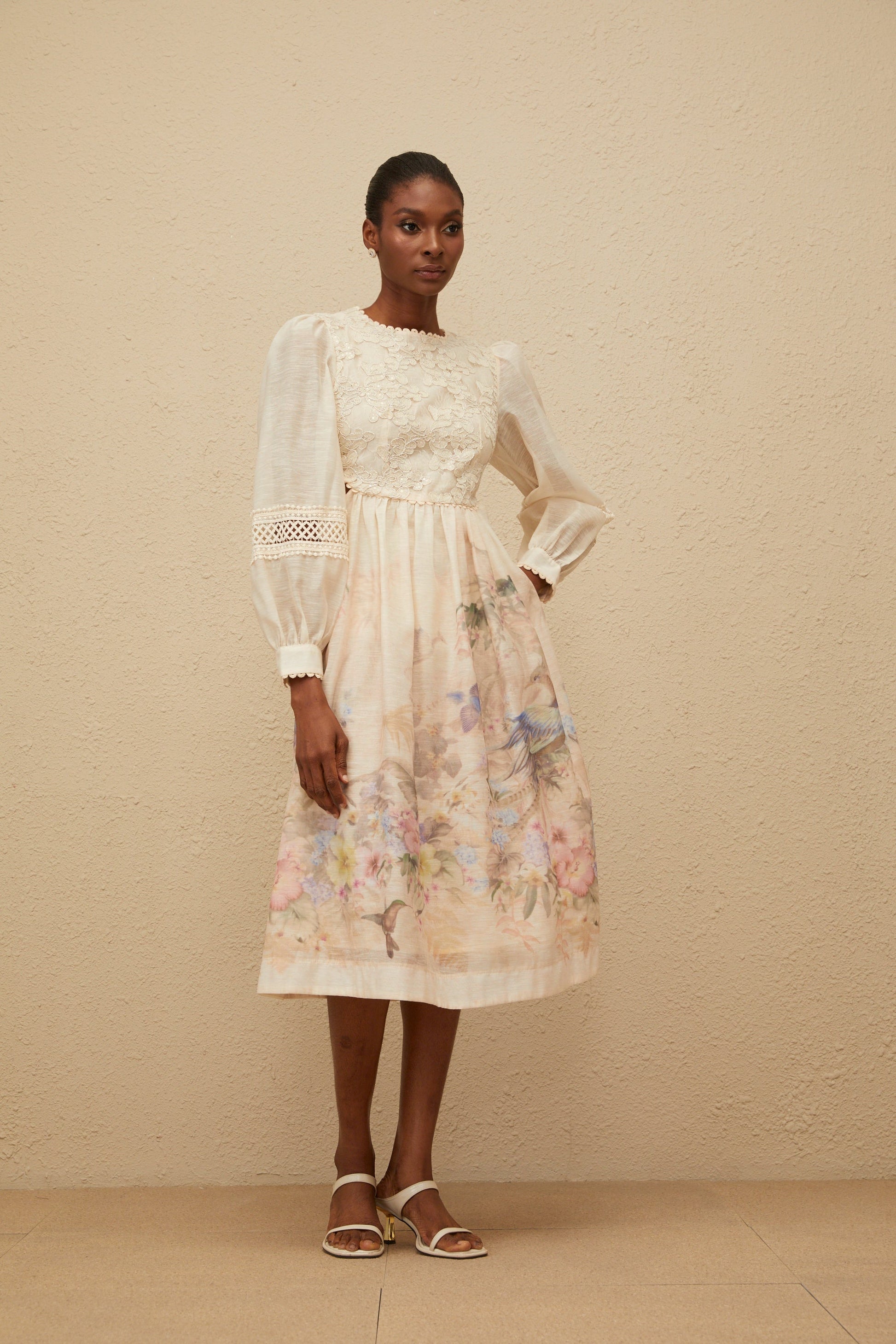 Isabella Beige Floral Embroidered Midi Dress