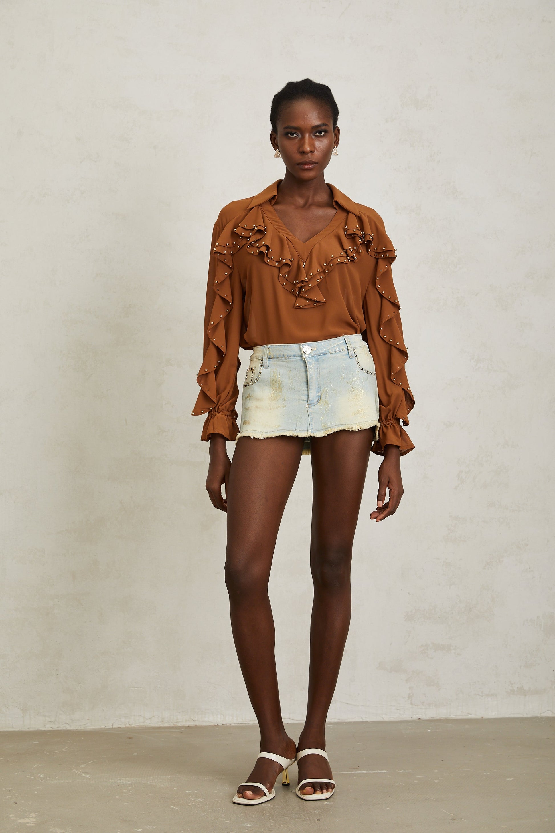 Isaline Caramel Beaded Ruffled Chiffon Blouse
