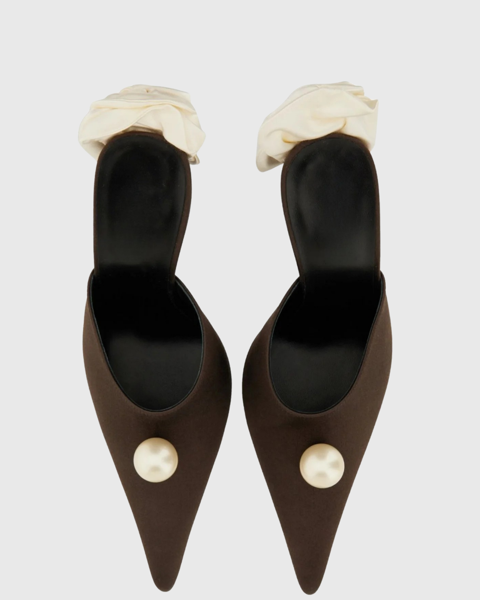 These stunning Isotta Flower Embellished Pearl Satin Mules In Brown are a must-have addition to any shoe collection. The intricate flower embellishments and lustrous pearl accents make these mules a perfect blend of elegance and fashion. Step into luxury with these brown satin mules and elevate any outfit with their luxurious touch.