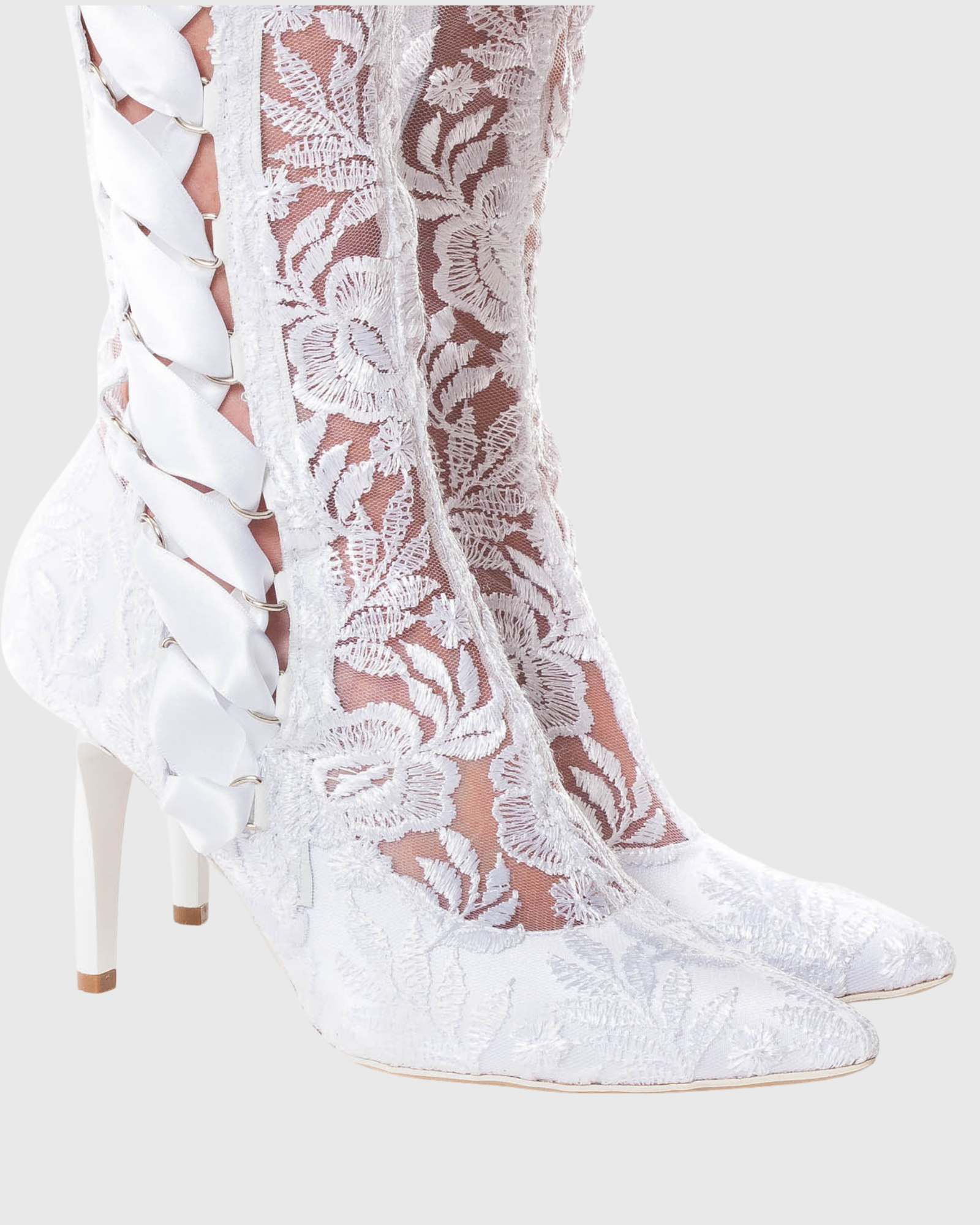 Step out with confidence wearing the James Lace Over The Knee Boots in White. Their sleek, towering design adds a bold statement while the lace-up detail ensures a secure, custom fit. Crafted to elongate your silhouette, these boots pair effortlessly with dresses or skinny jeans, making them a versatile must-have for your wardrobe. Elevate every outfit with striking style and comfortable wear.