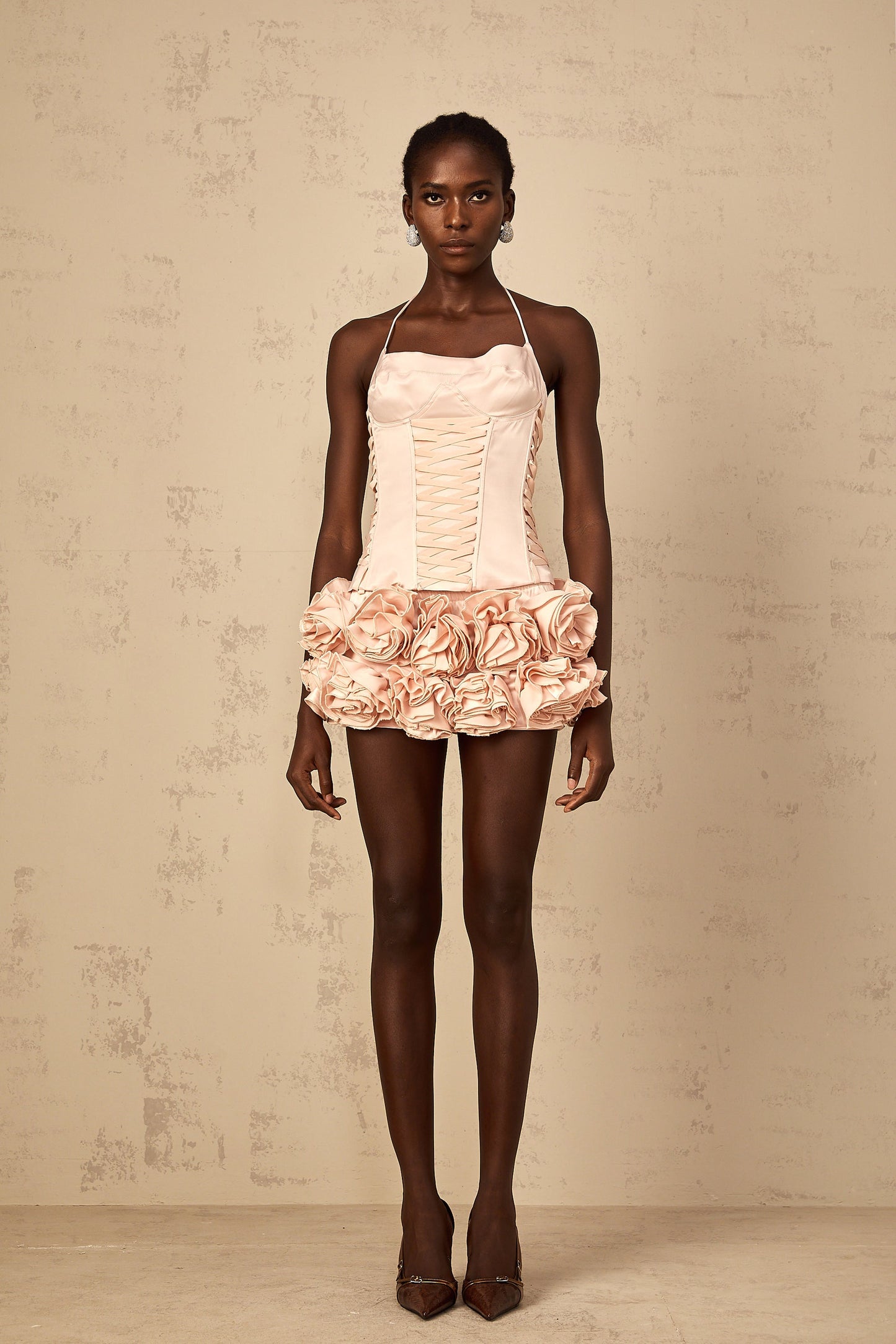 Jeanne pink faux-flower lace-up top & skirt matching set