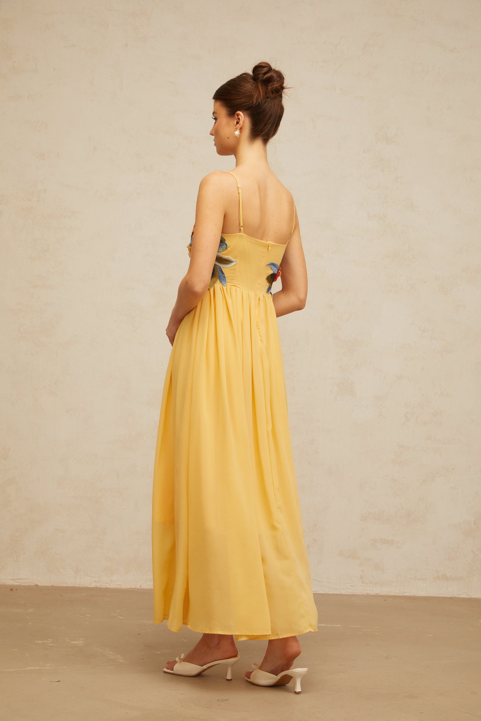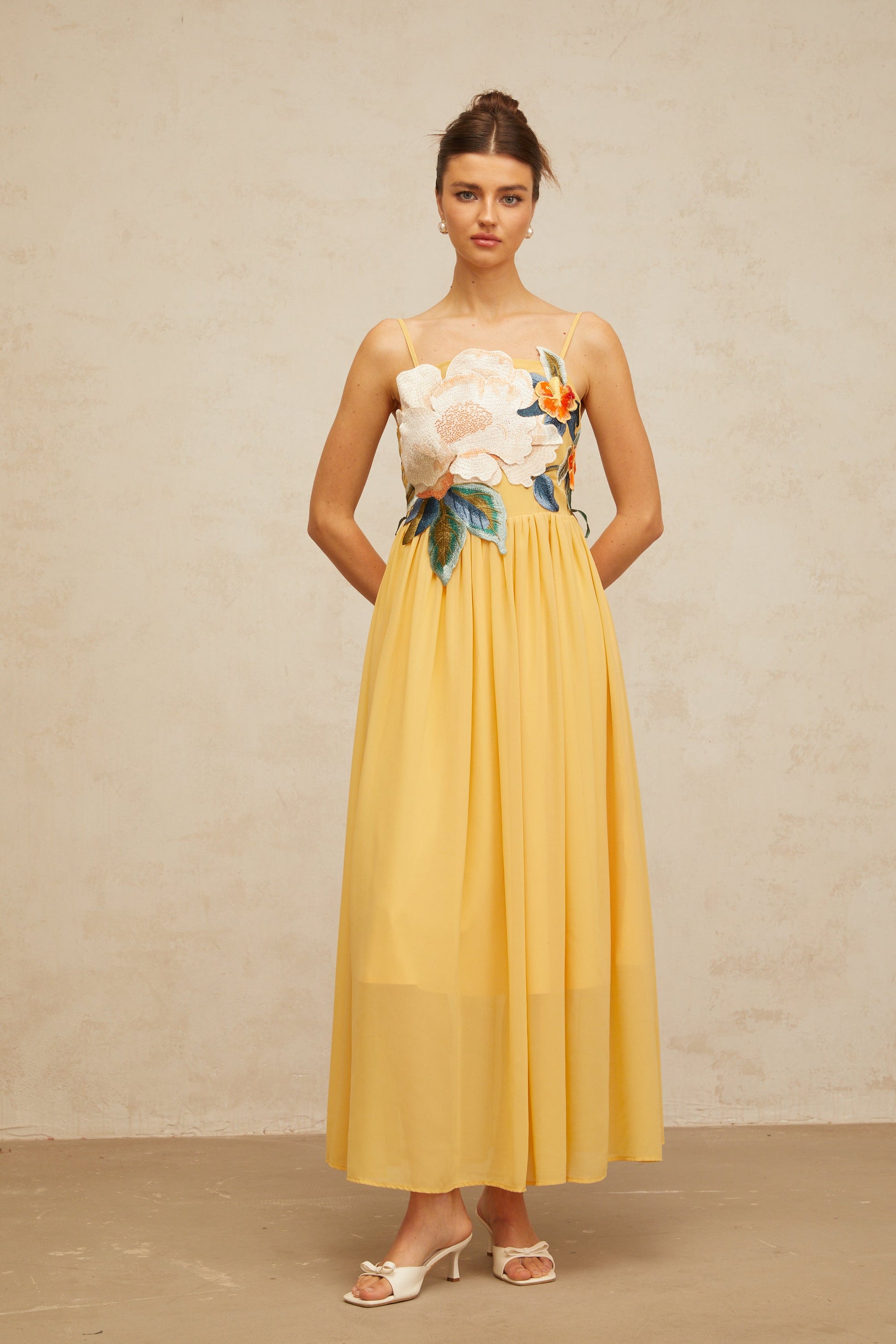 Josette floral-embroidered shirred maxi dress in Yellow