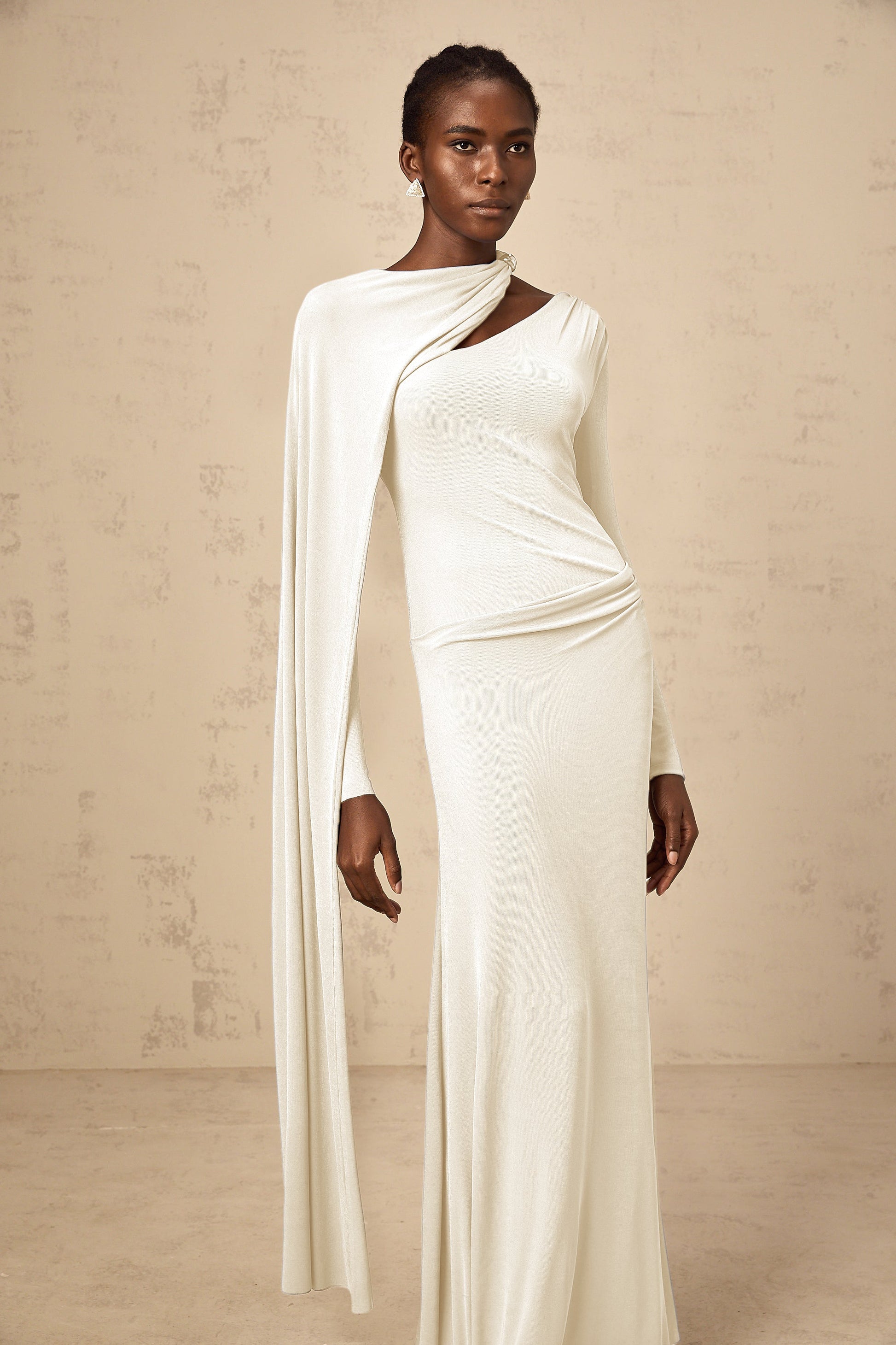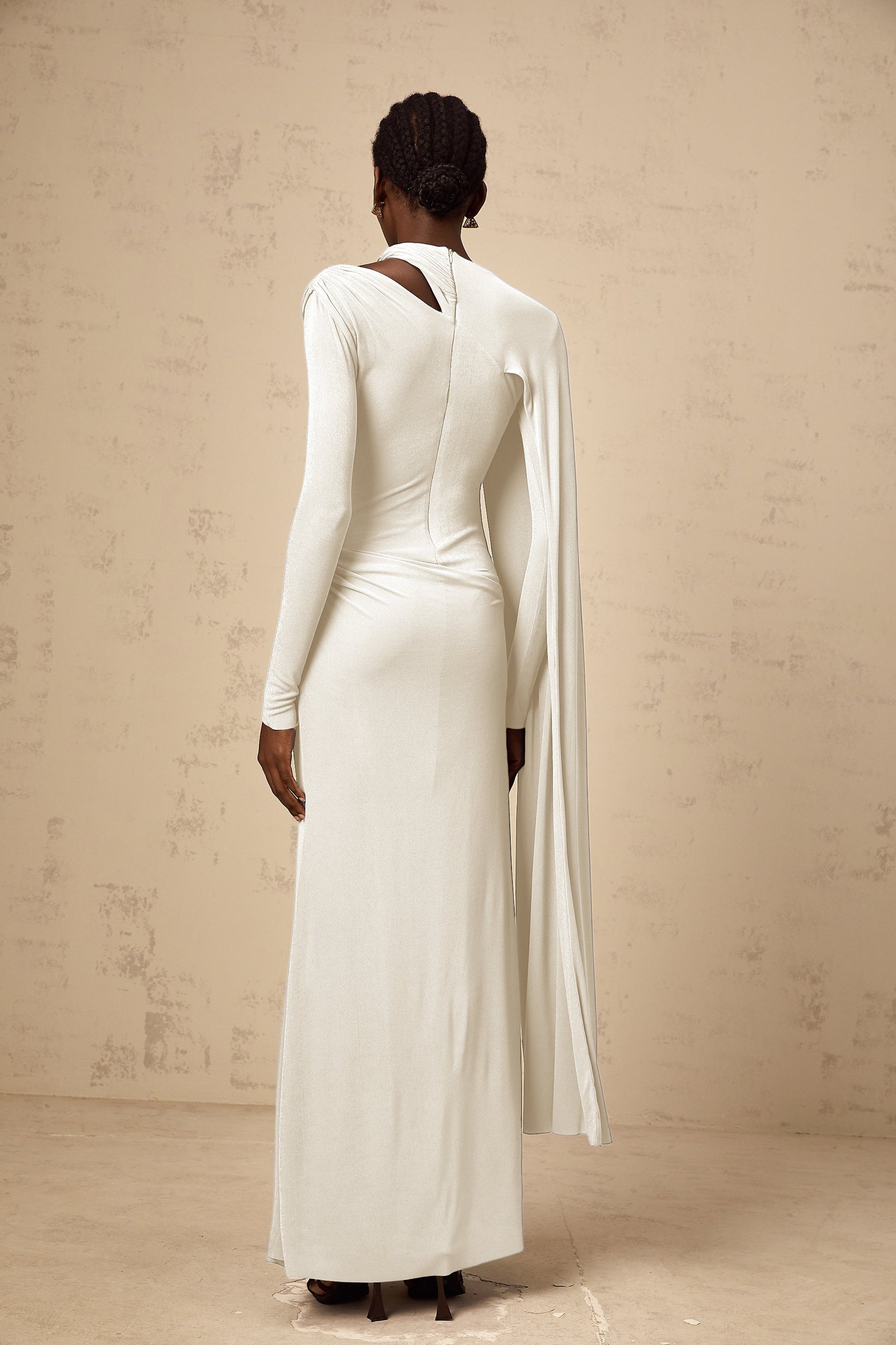 Josette White Diagonal Shawl Fitted Maxi Dress