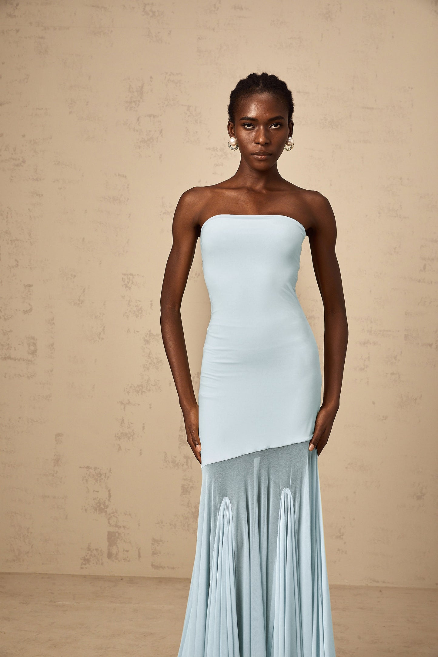 Josiane Blue Off-shoulder Sheer Tulle Maxi Dress