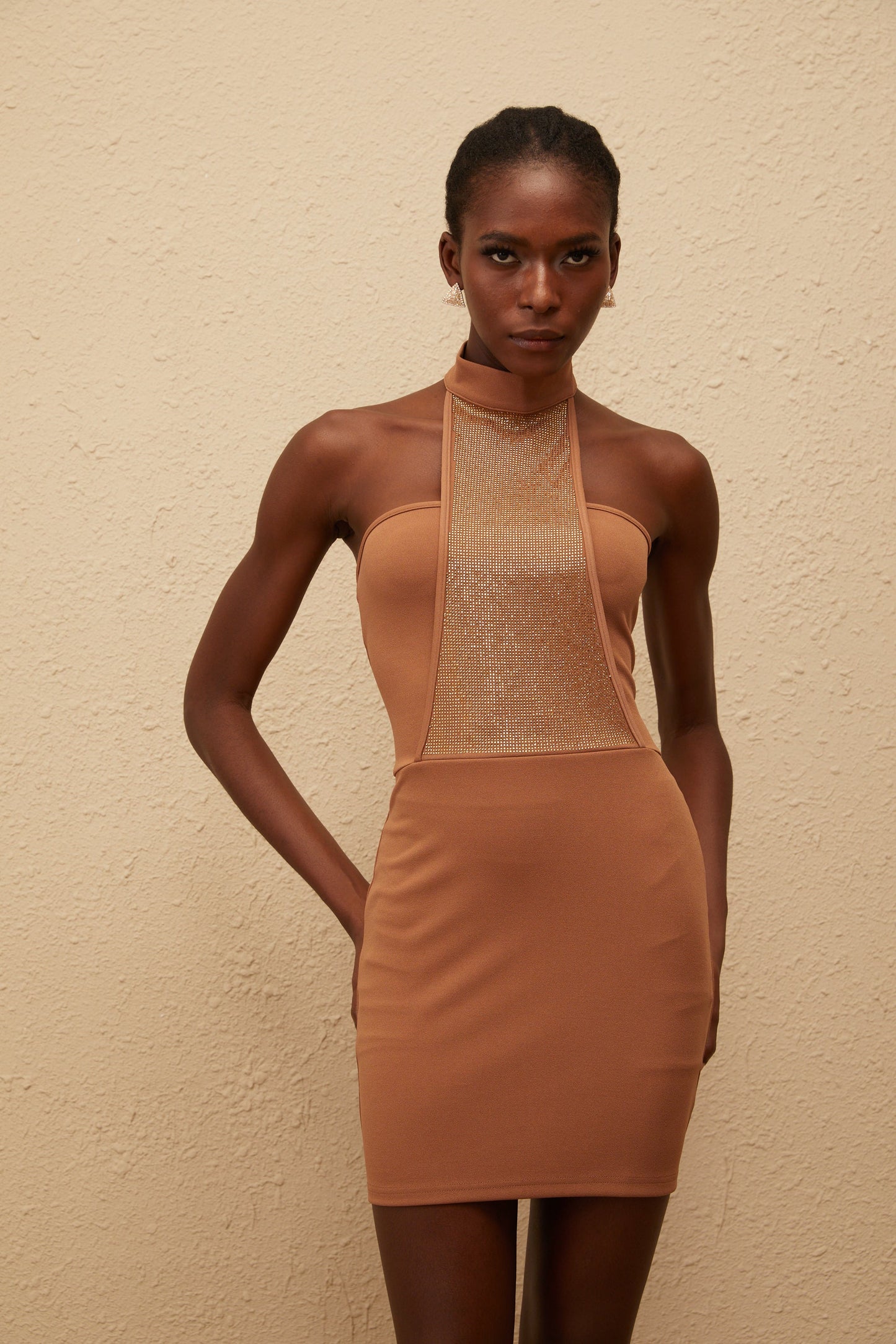Kalliope Brown Rhinestone Bodycon Mini Dress