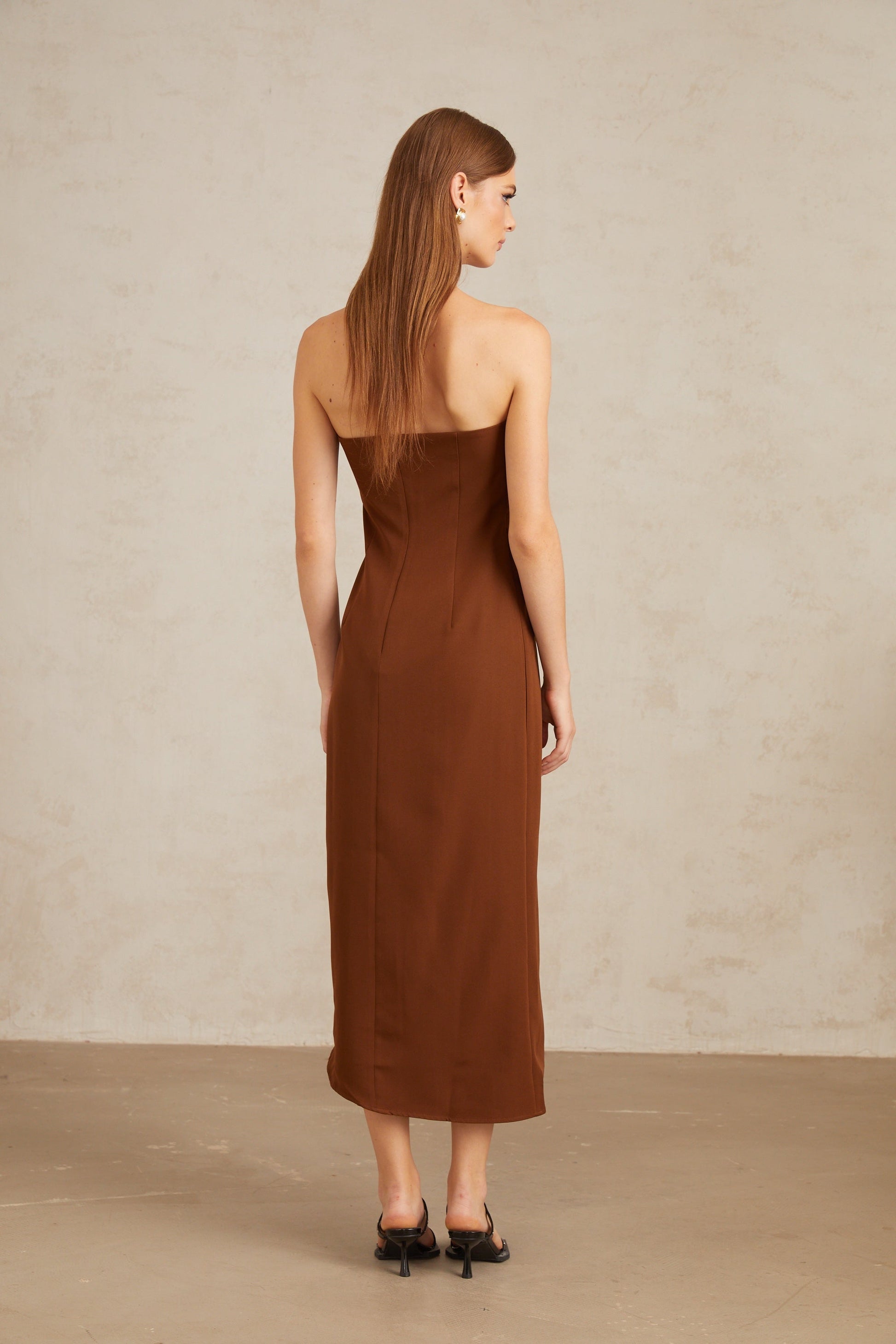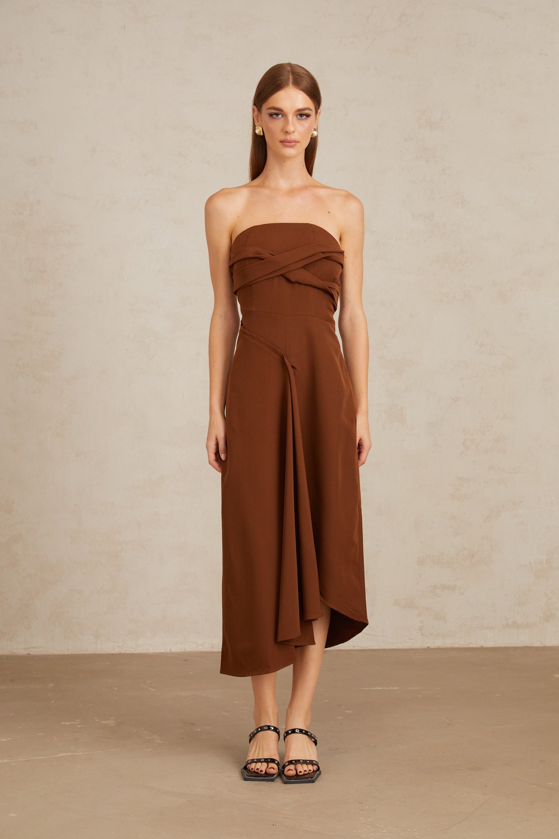 Kyliegh Brown Asymmetrical Off-Shoulder Midi Dress