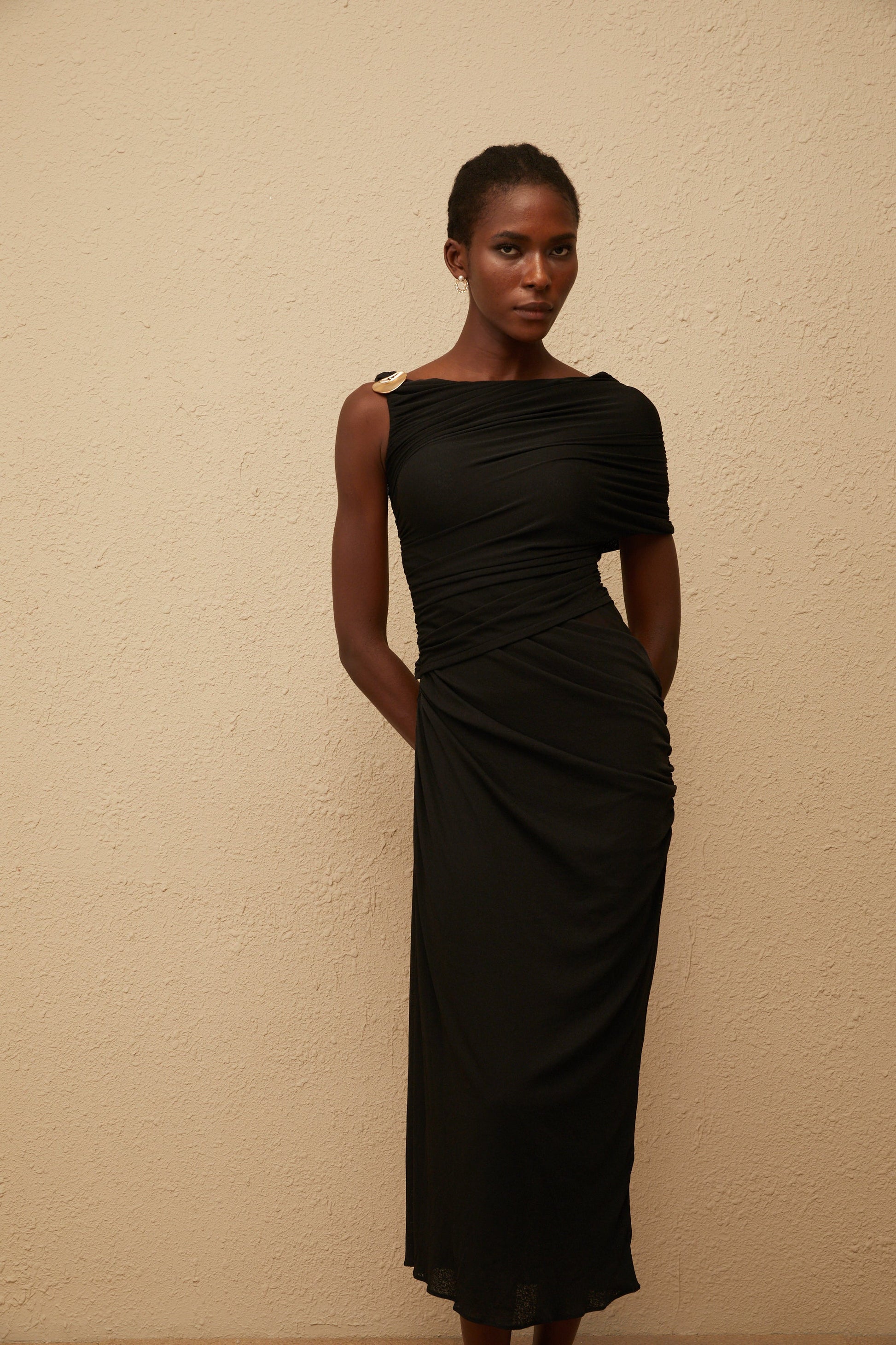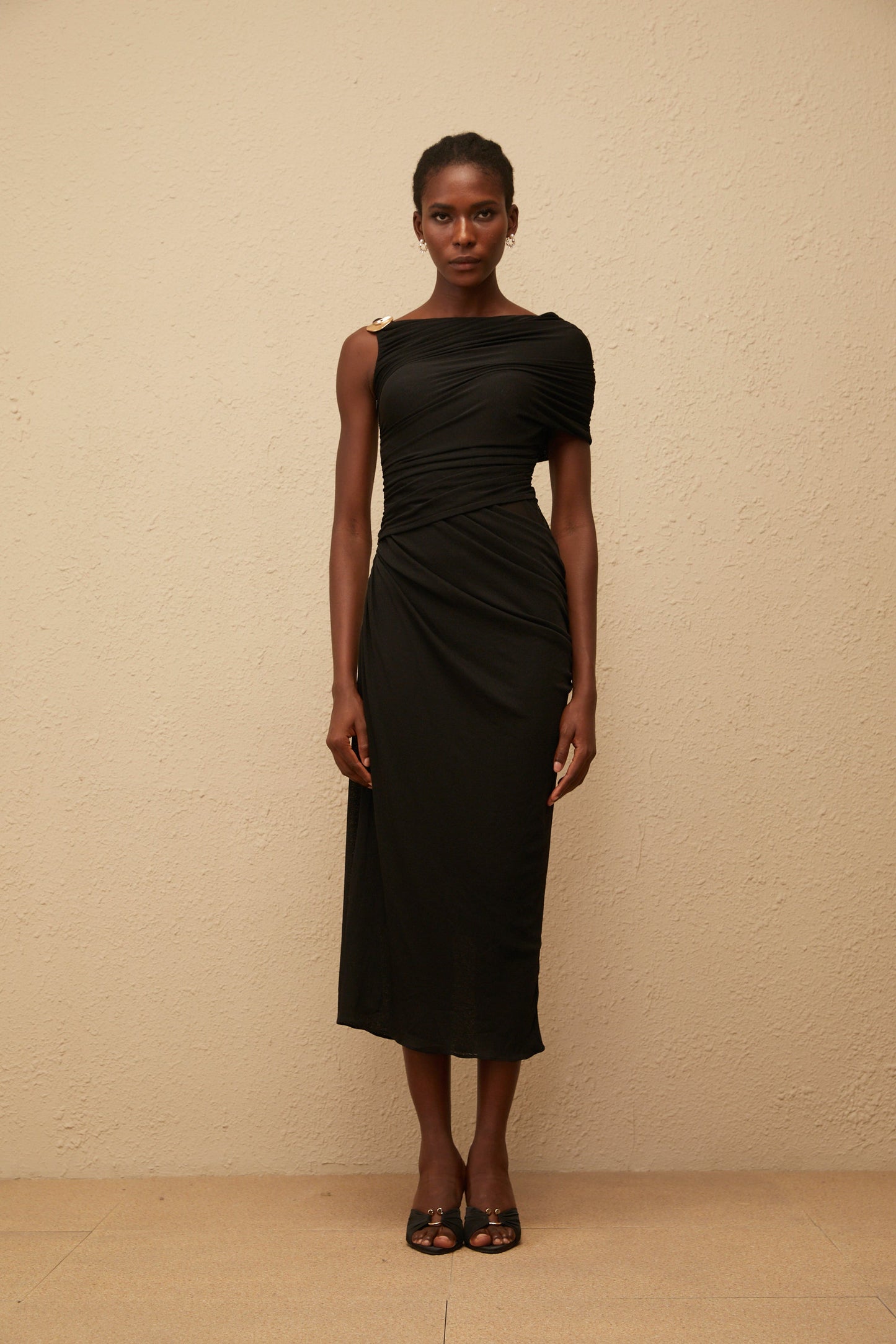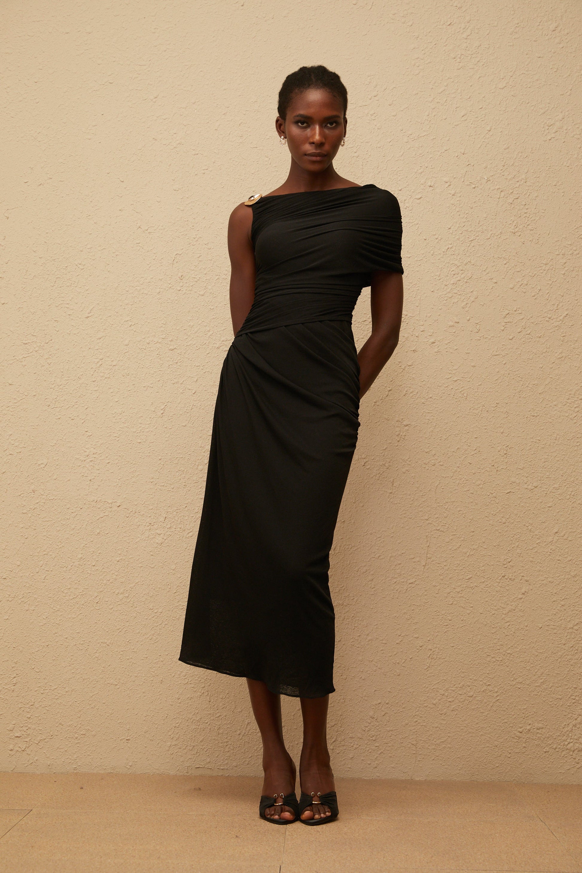 Latika Black One Shoulder Gathered Midi Dress