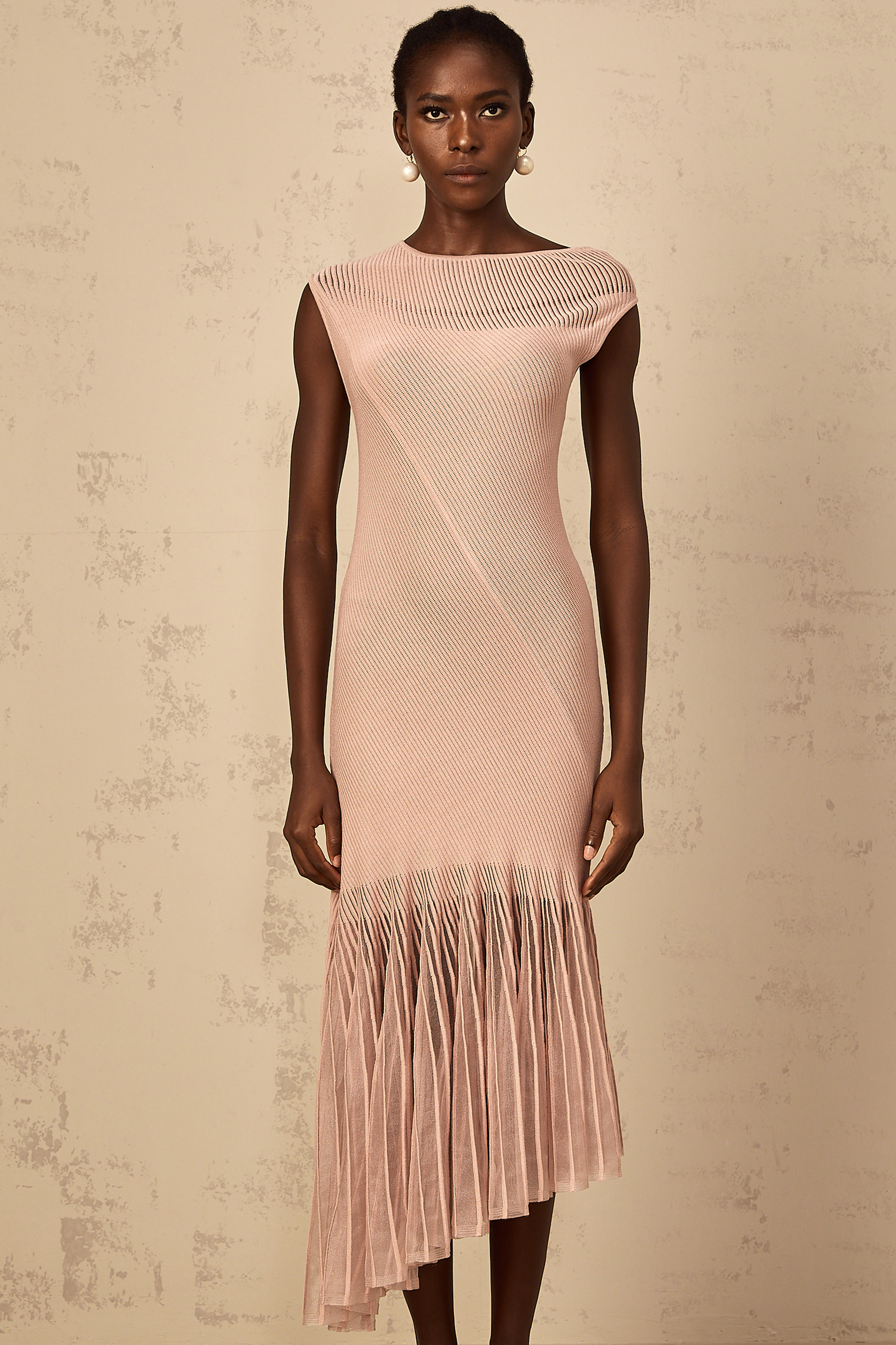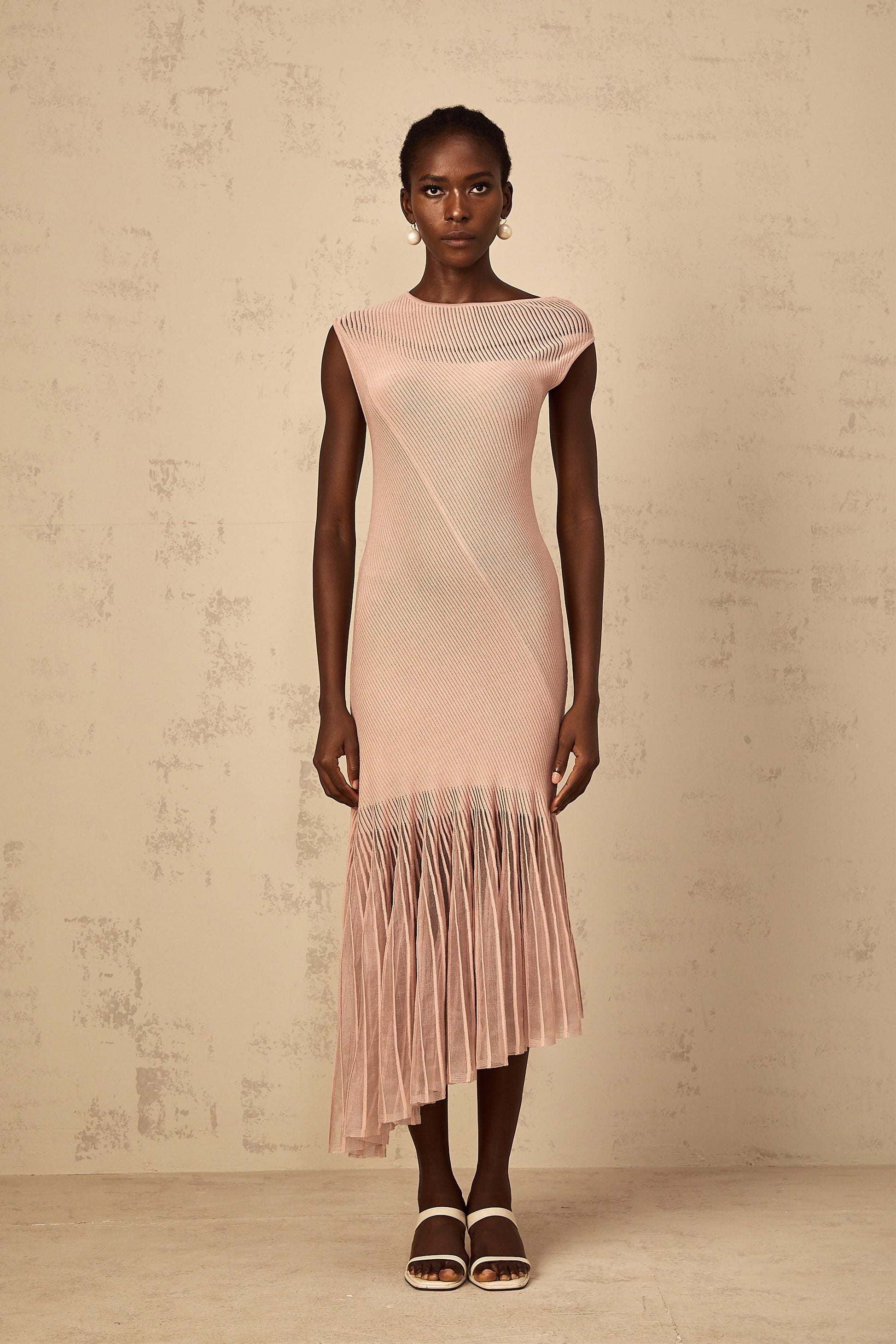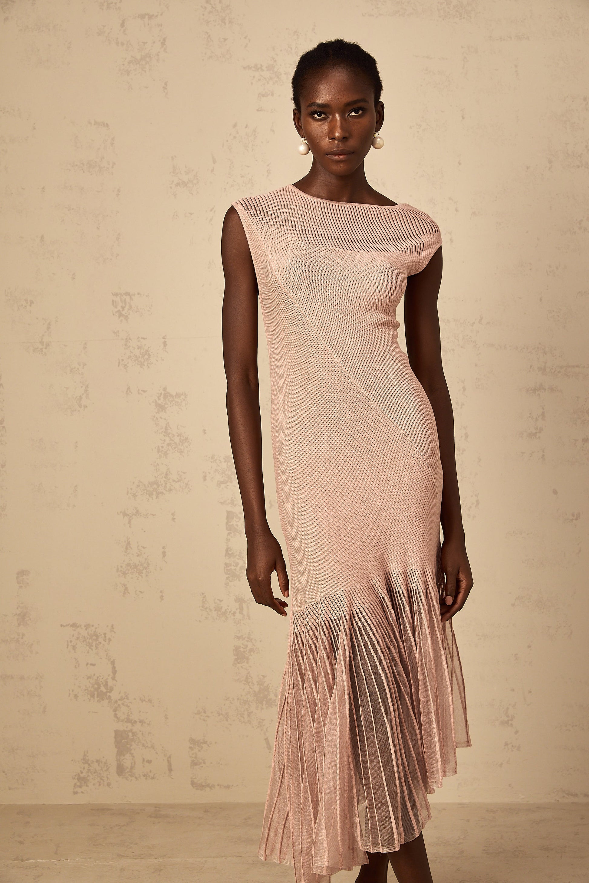 Laure Dusty Pink Tulle Panel Ribbed Knit Midi Dress