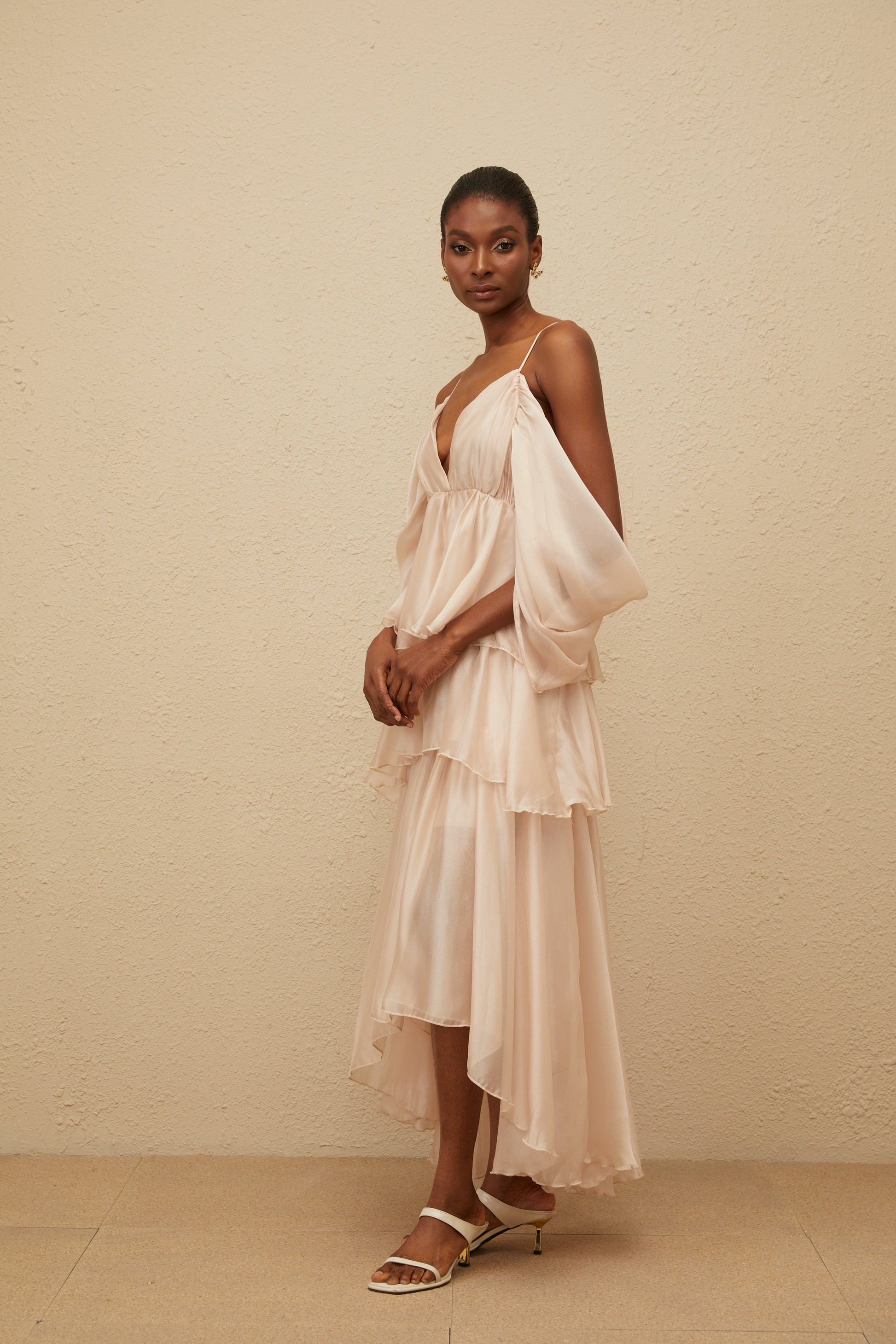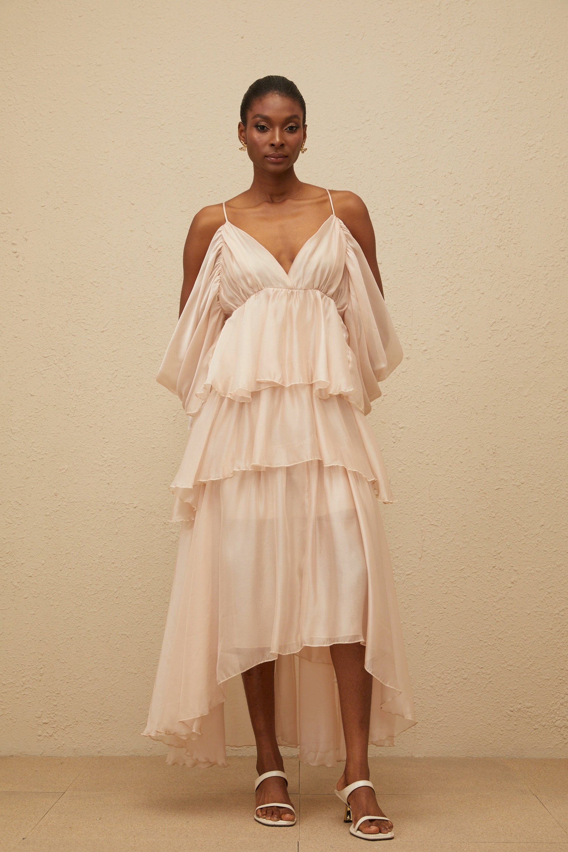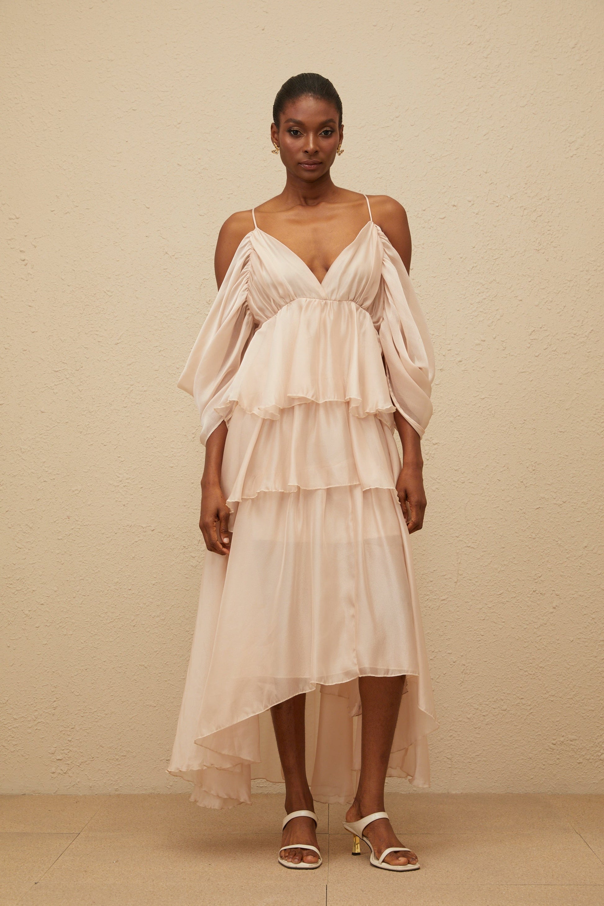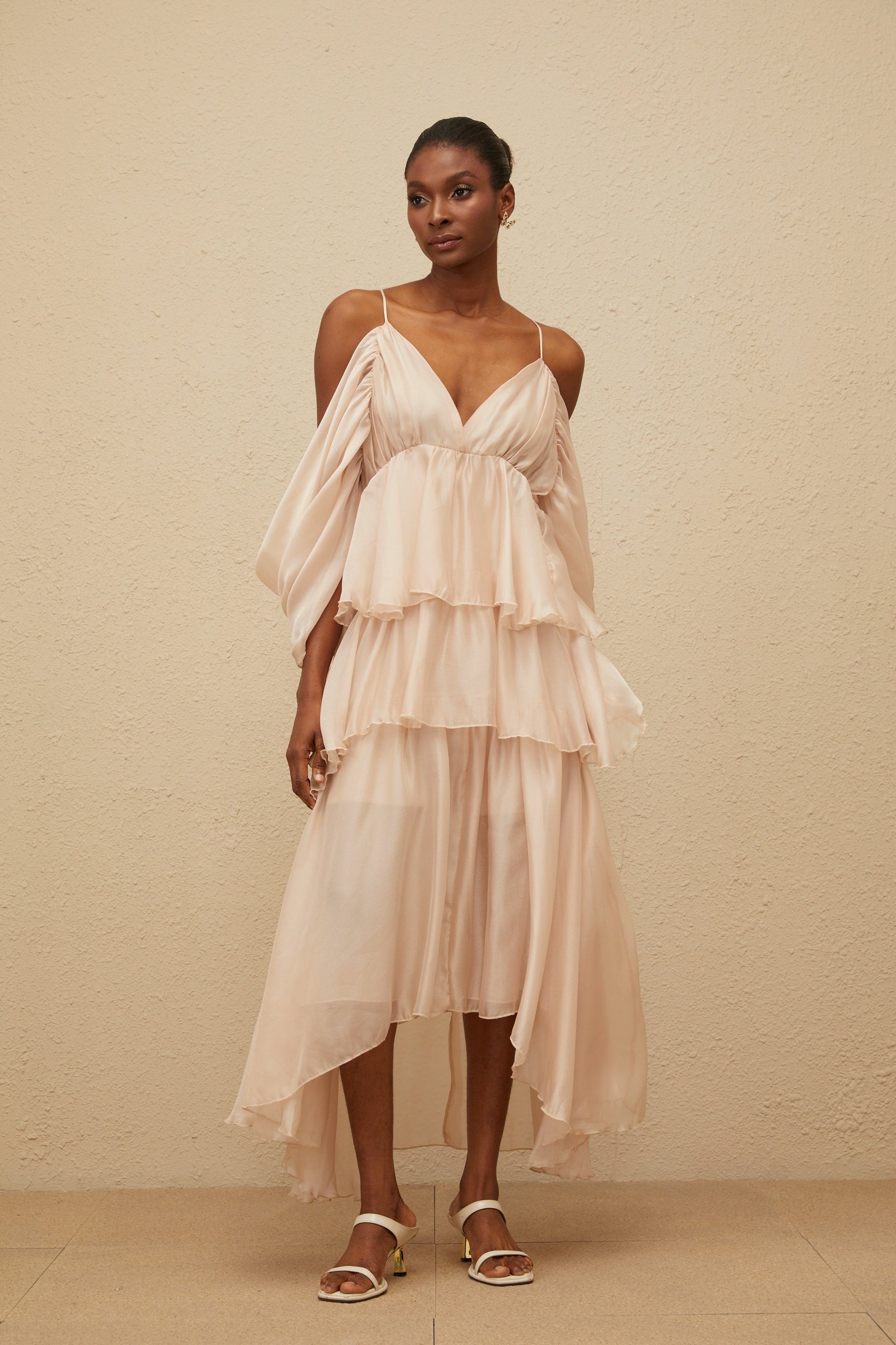Laurine Asymmetrical Ruffled Tiered Midi Dress