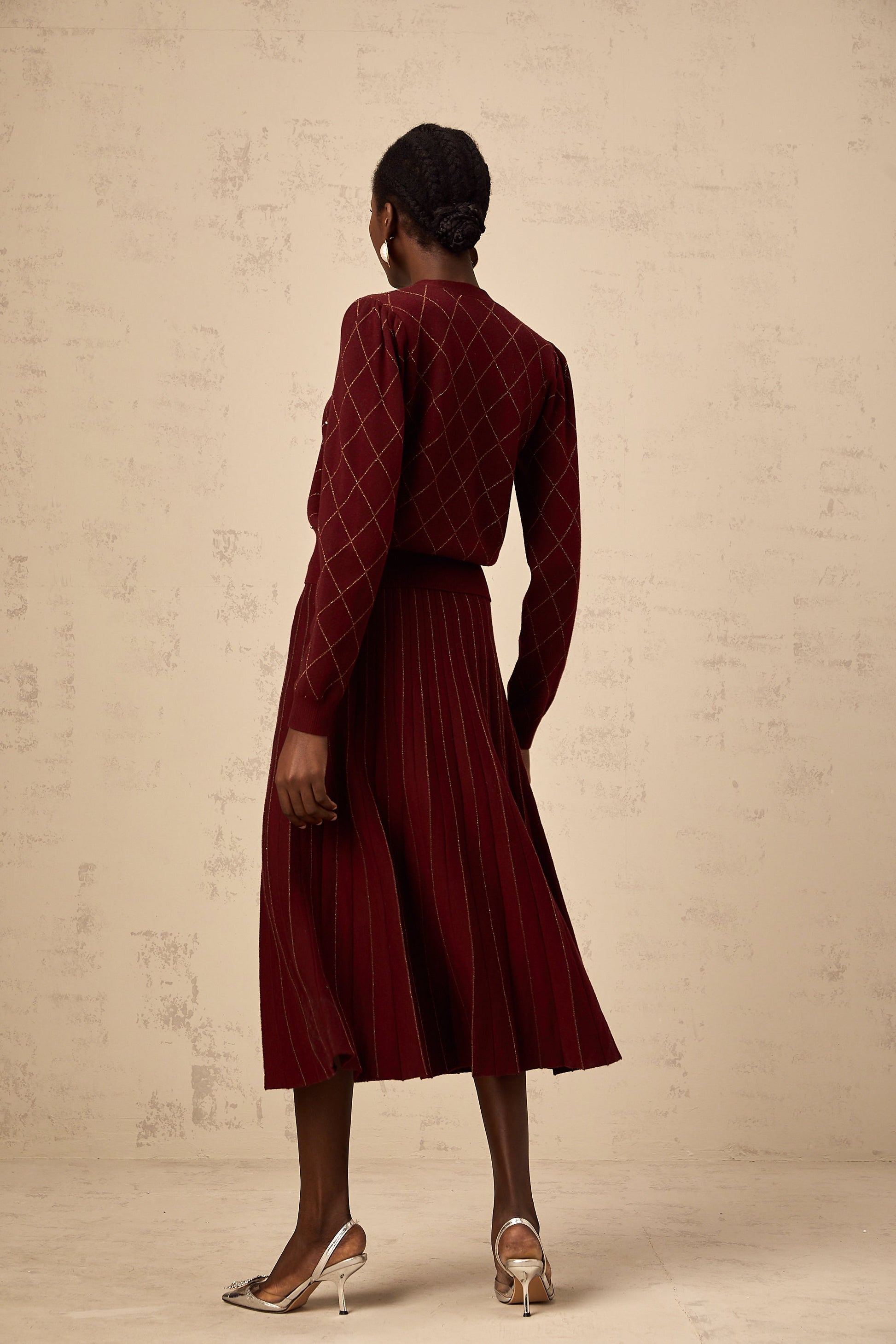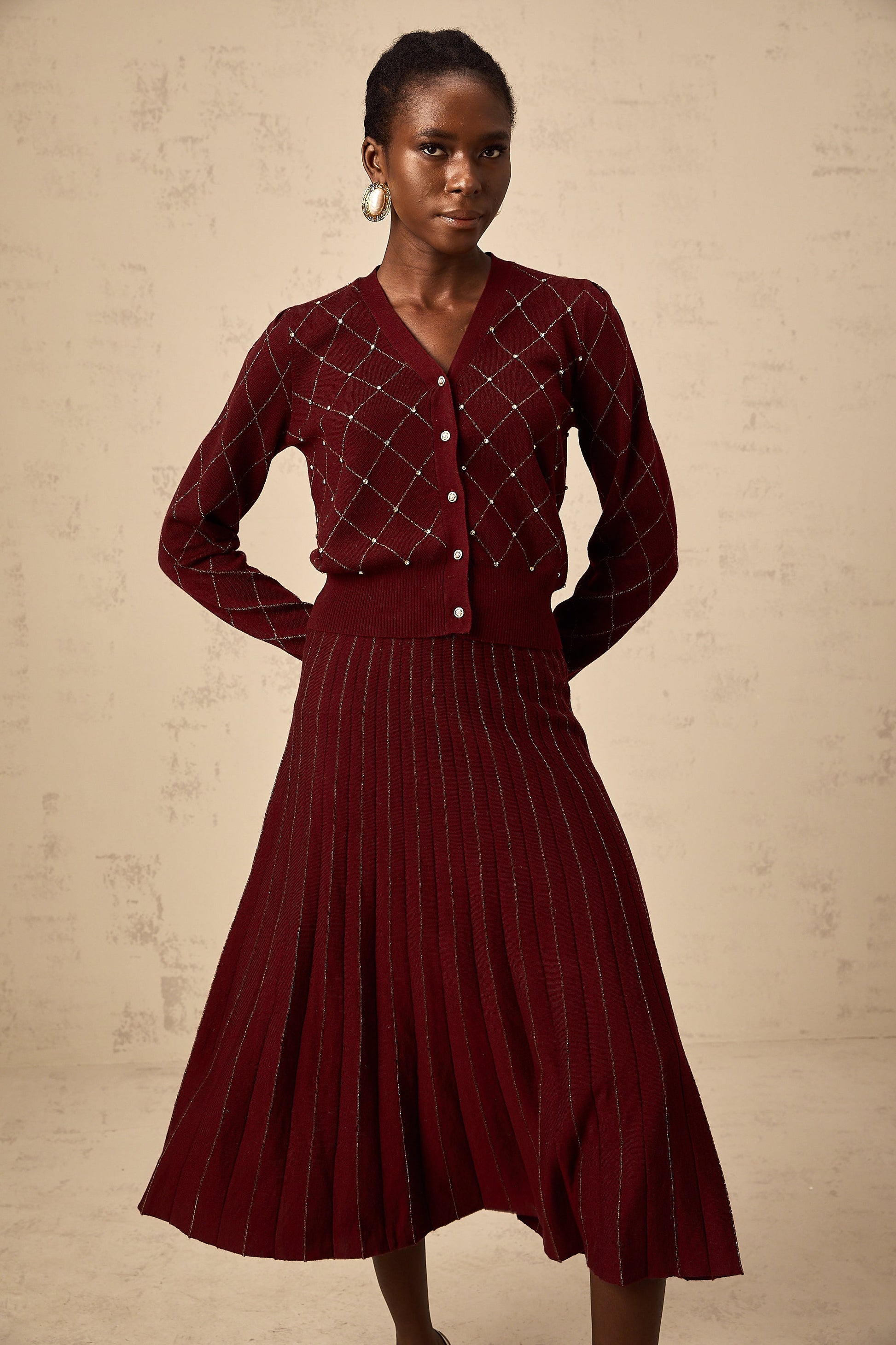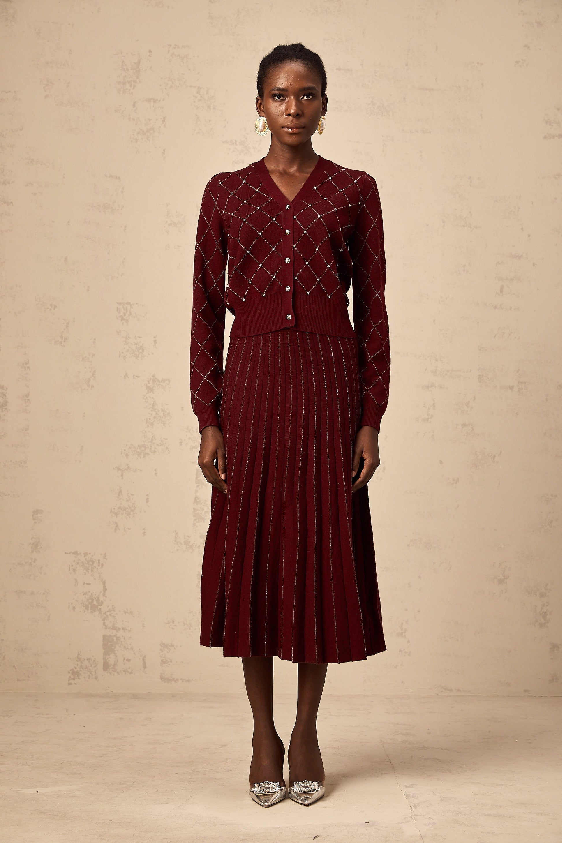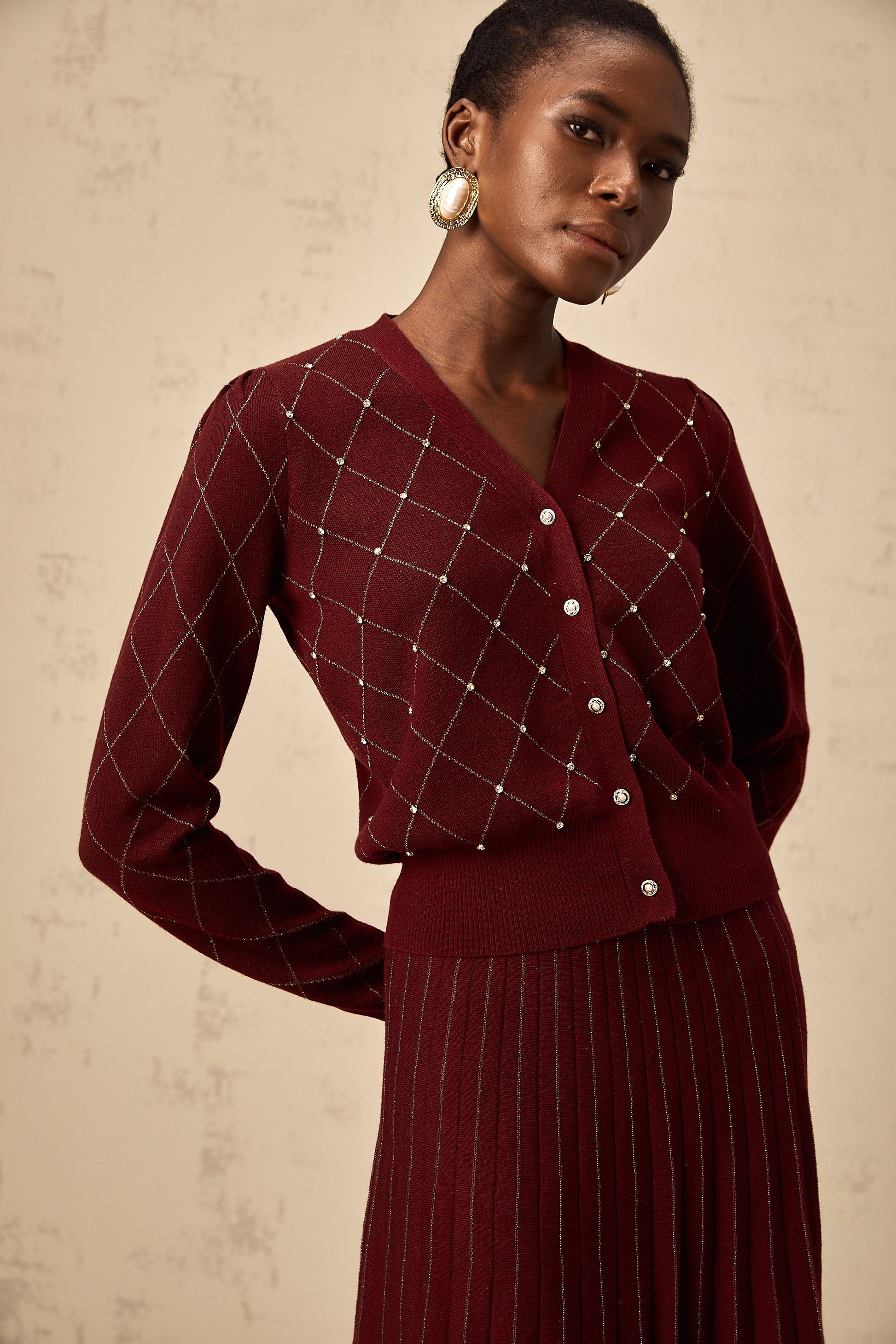 Laurine red embellished argyle intarsia knit cardigan & skirt matching set