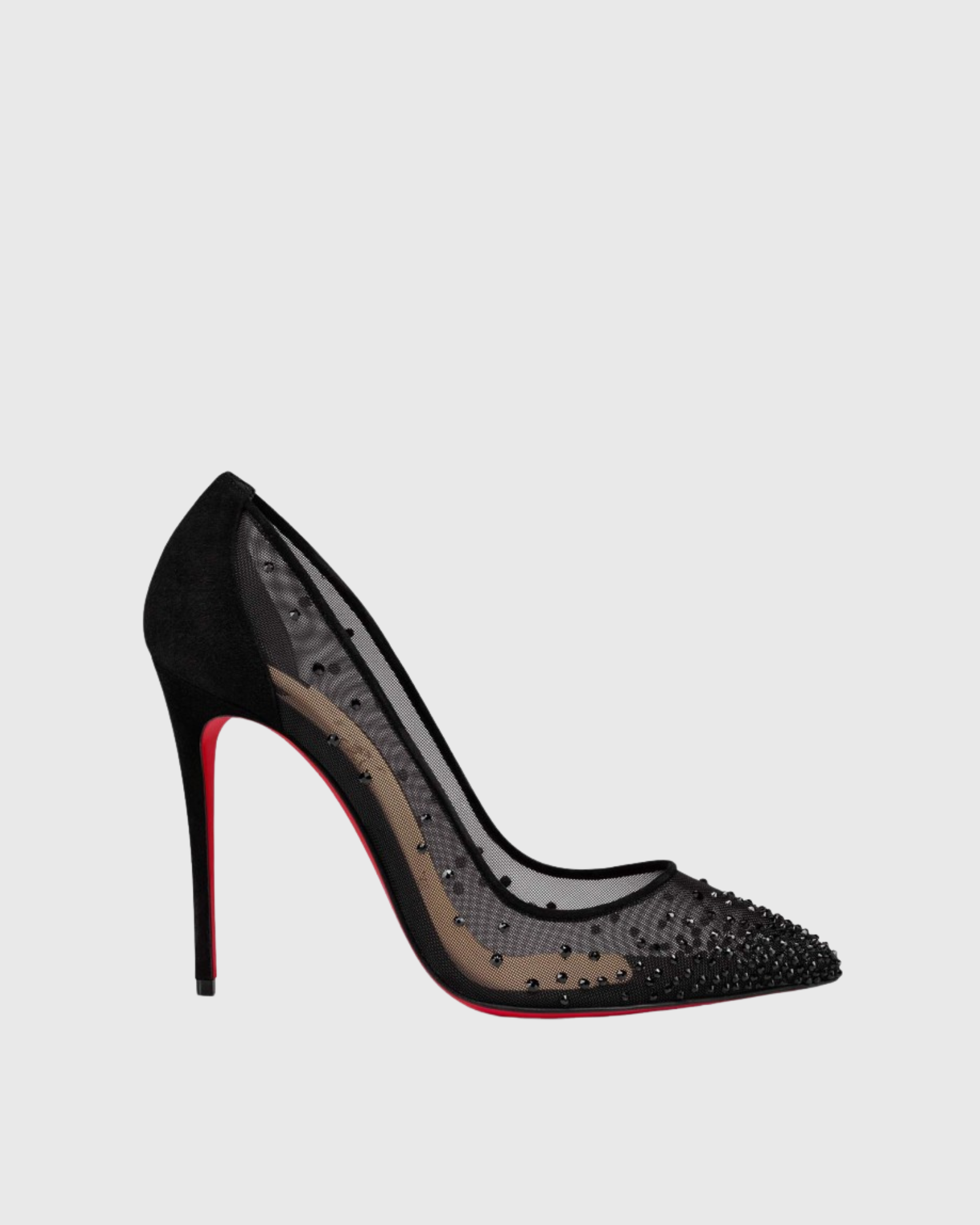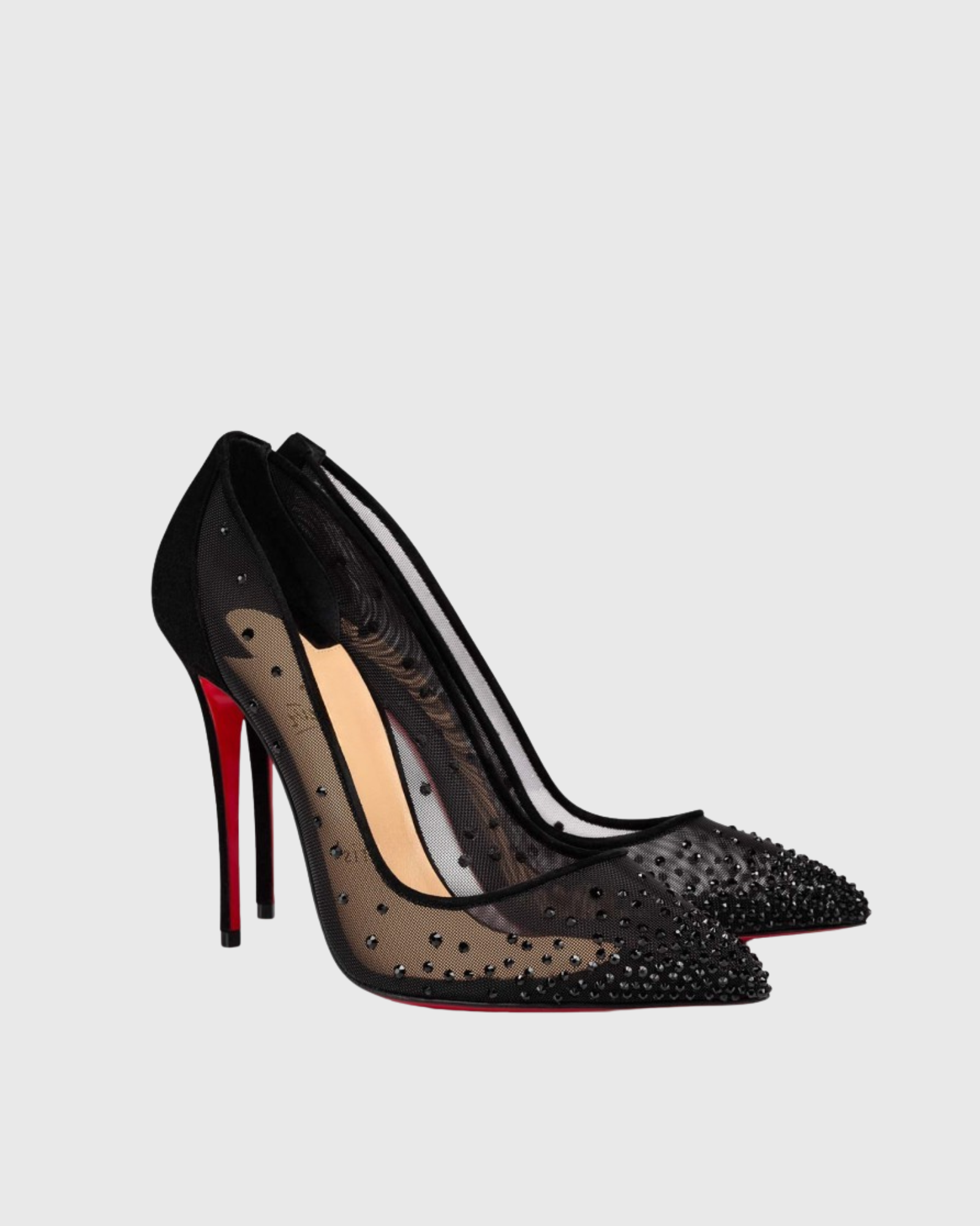 Elevate your style with the Leone Rhinestone Mesh Pumps in Black. These elegant heels combine delicate mesh with sparkling rhinestones for a striking, sophisticated look. Perfect for special occasions or adding a touch of glamour to your everyday outfit, they offer both comfort and eye-catching appeal. Step confidently and shine wherever you go.