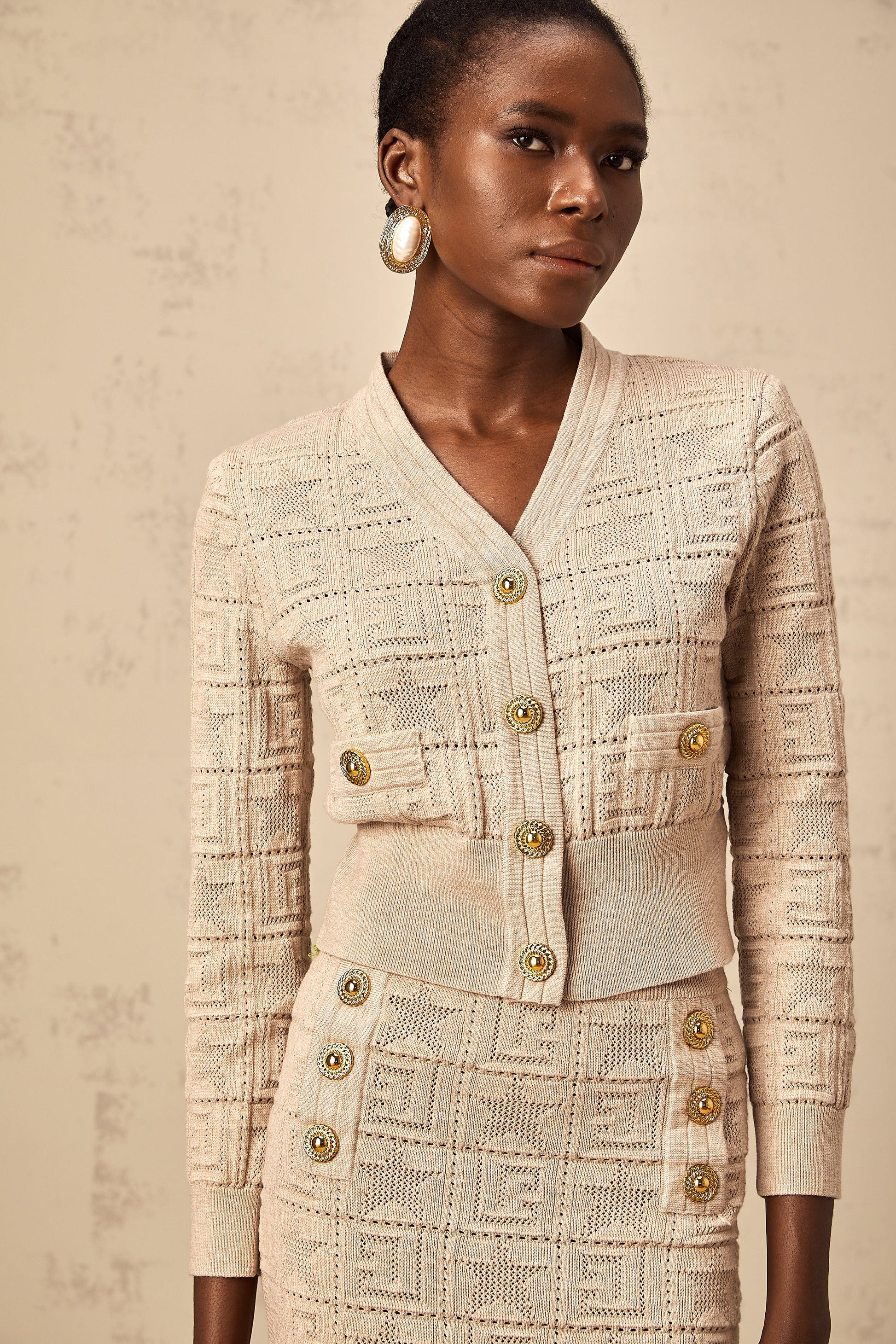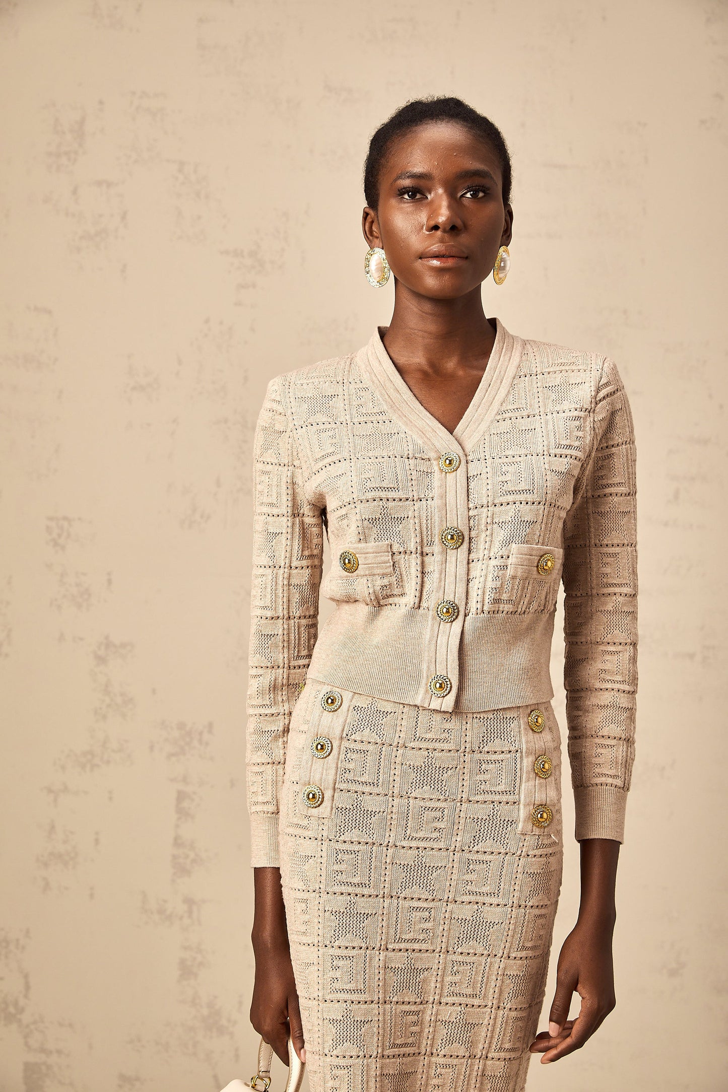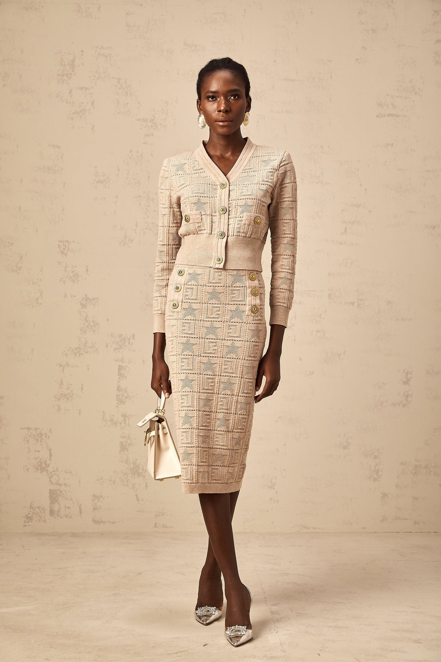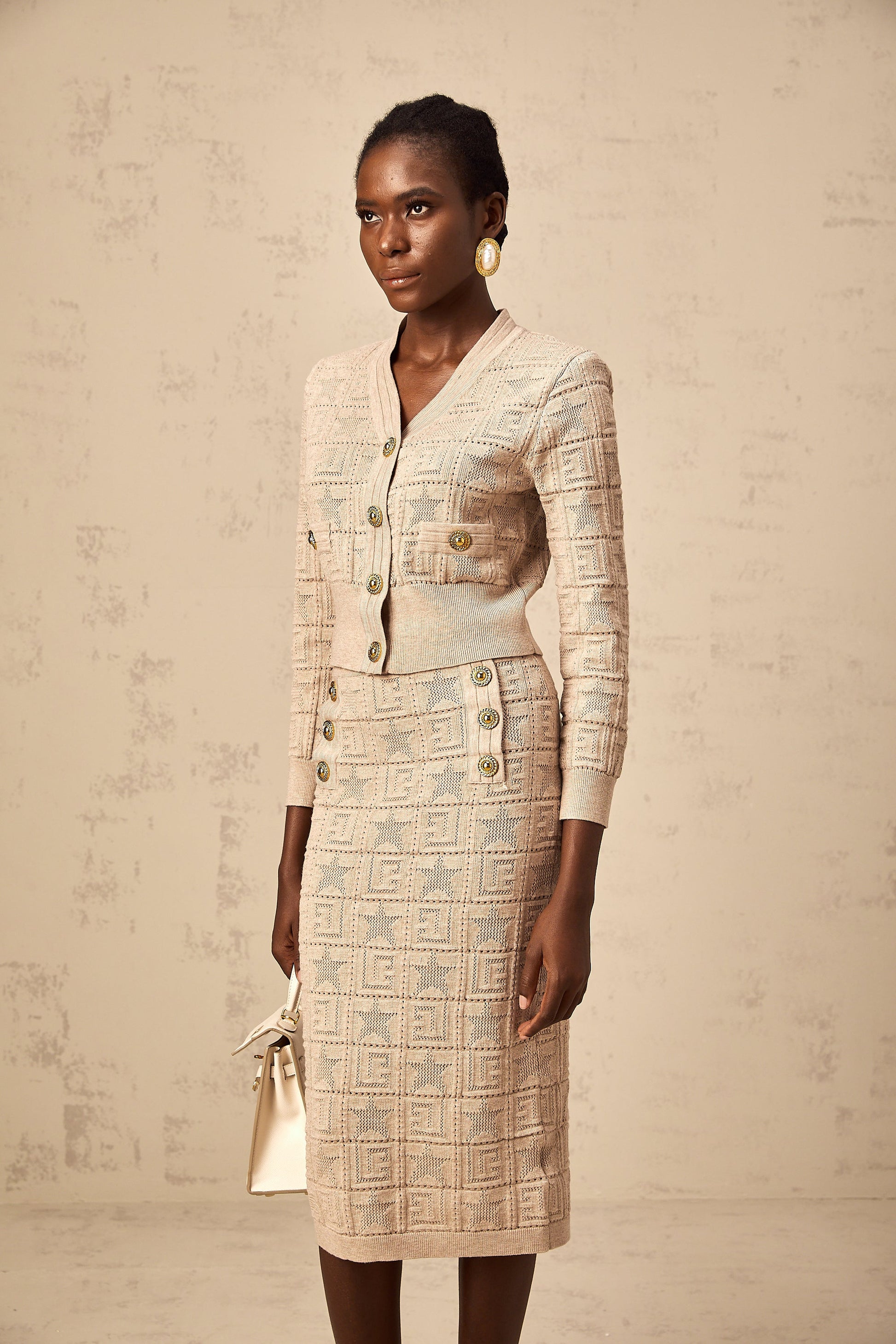 Leonie khaki star-motif crochet knit cardigan & skirt matching set