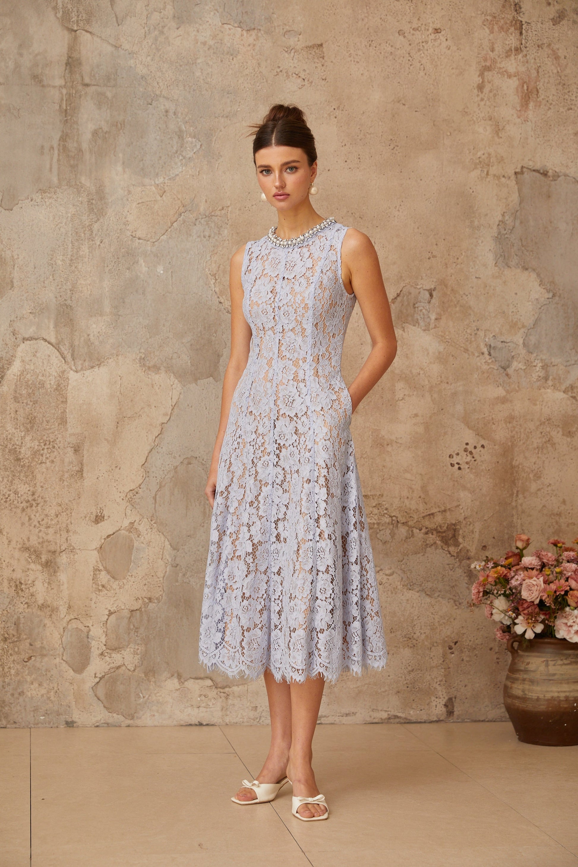 Lison blue embellished floral-lace midi dress