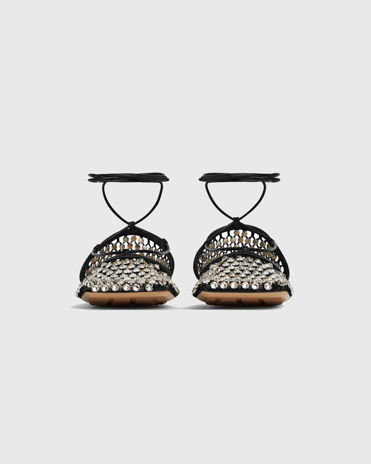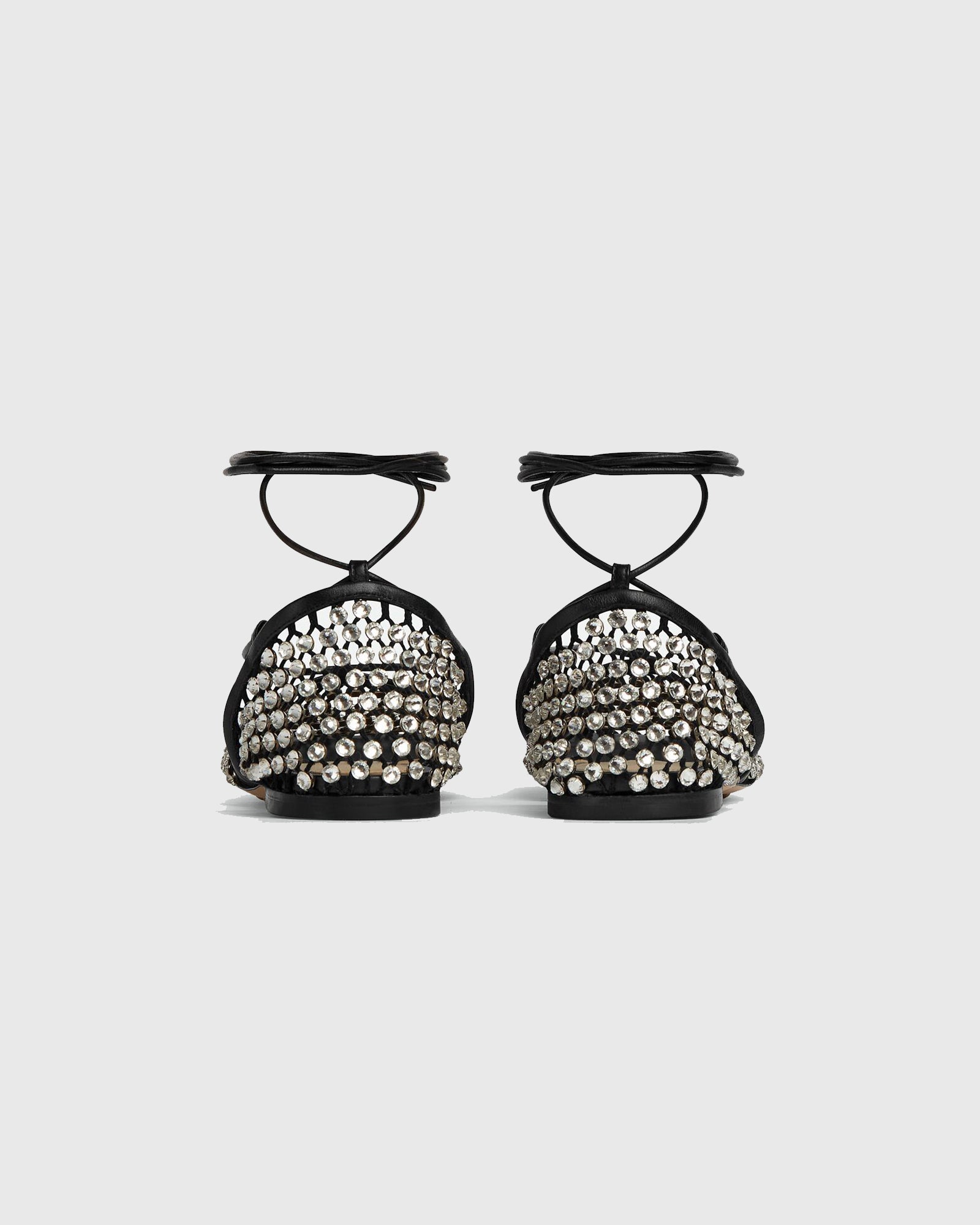 Luca Rhinestone Embellished Fishnet Lace Up Flats In Black