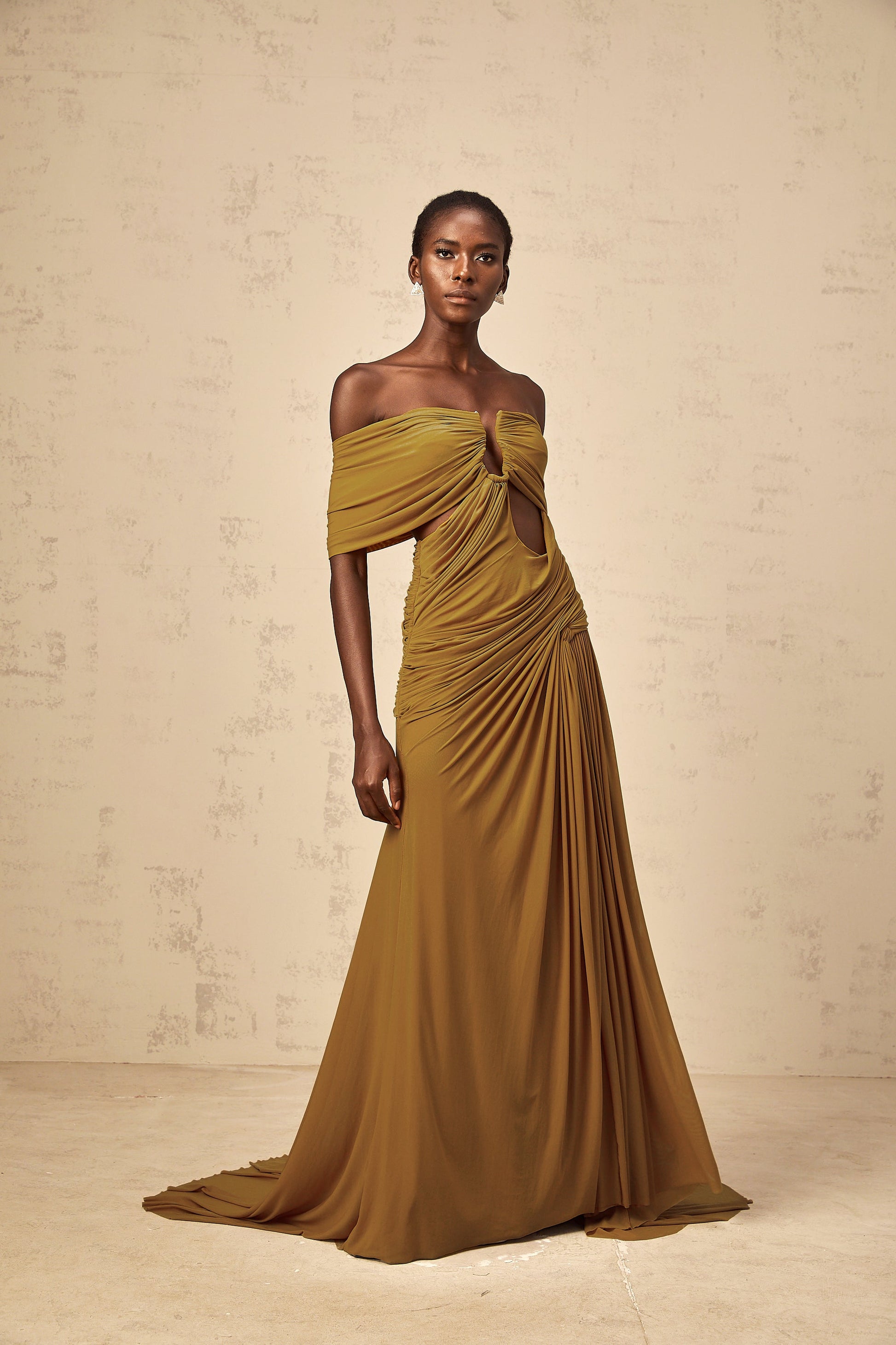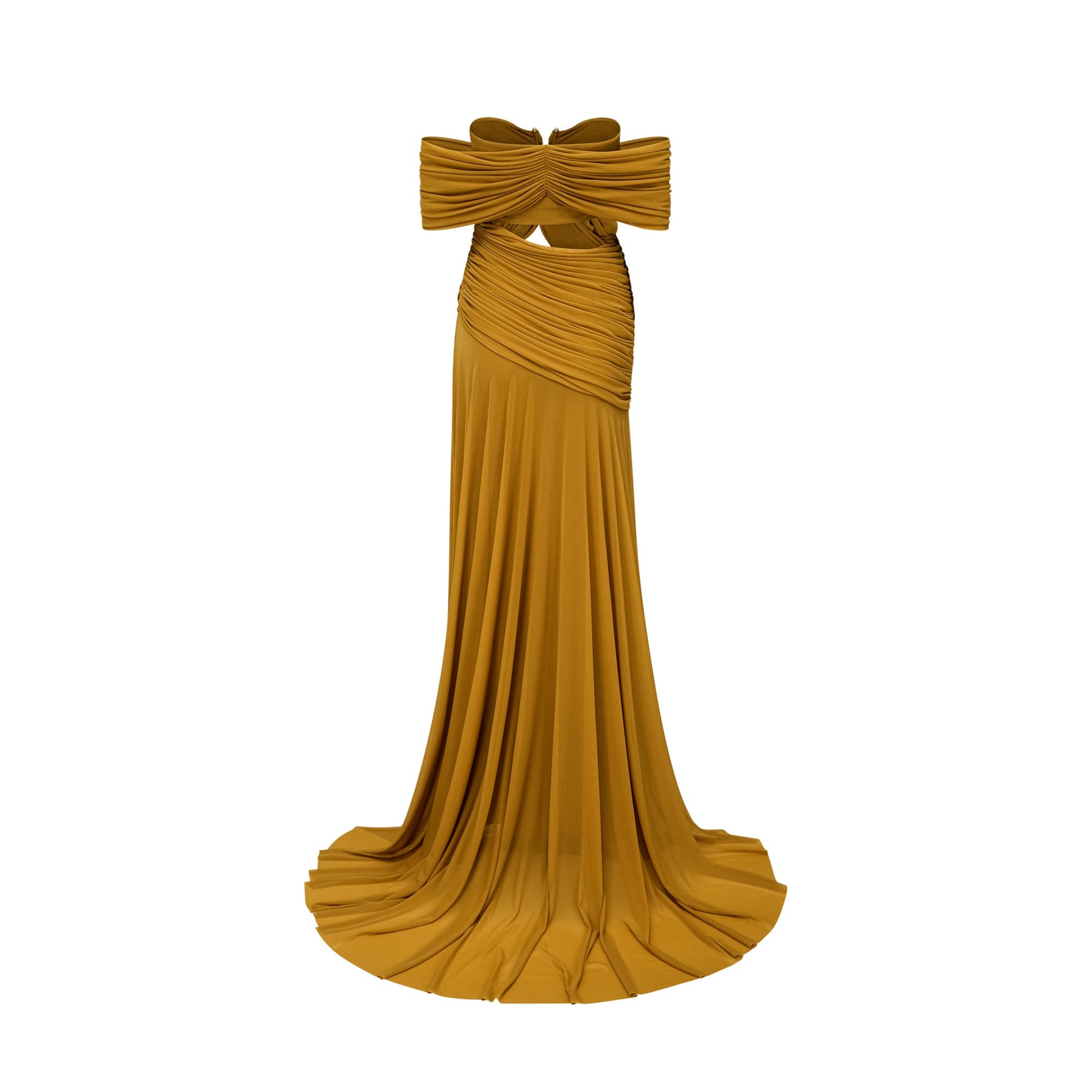 Ludivine ocher off-shoulder cut-out ruched maxi dress
