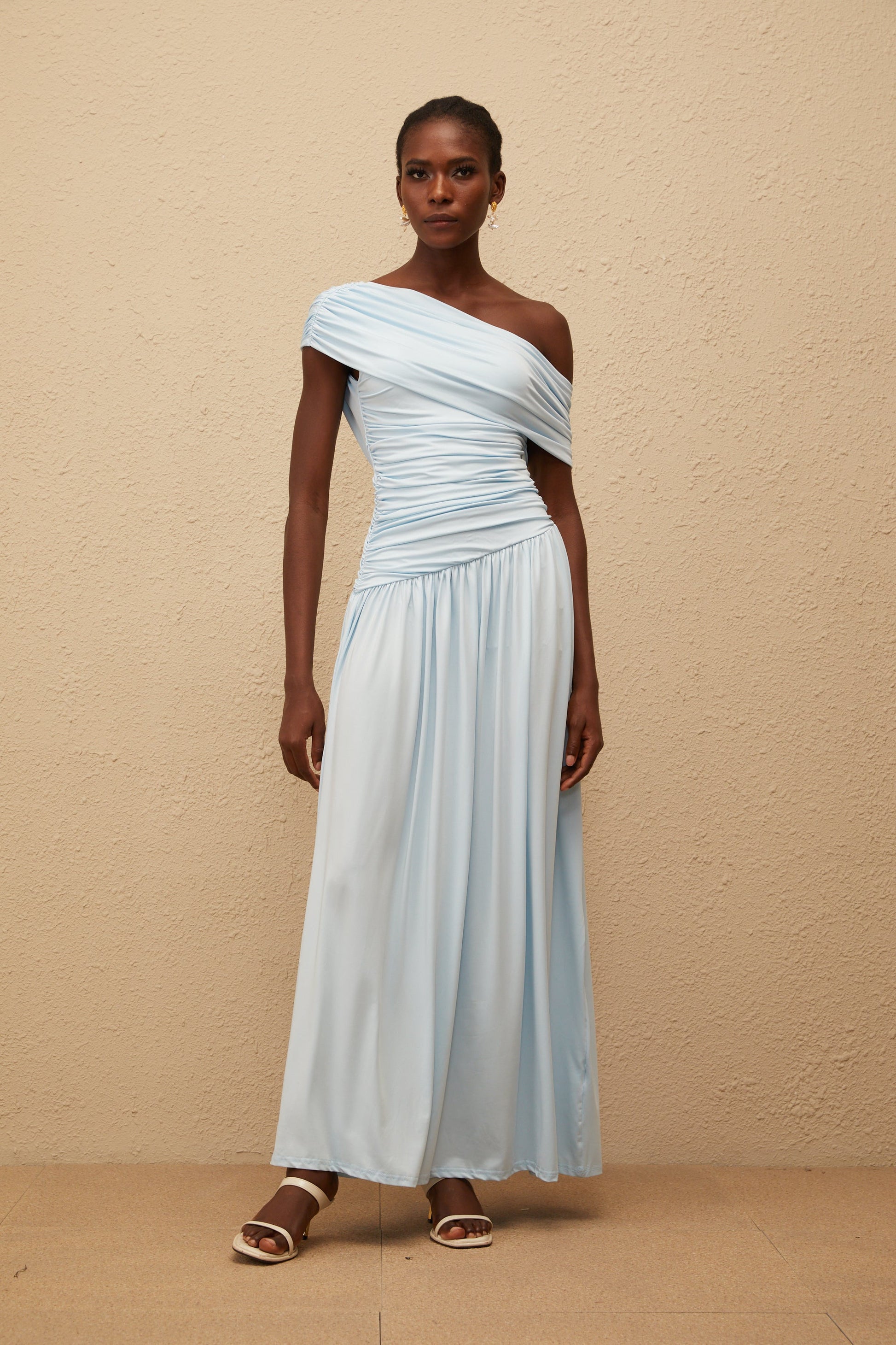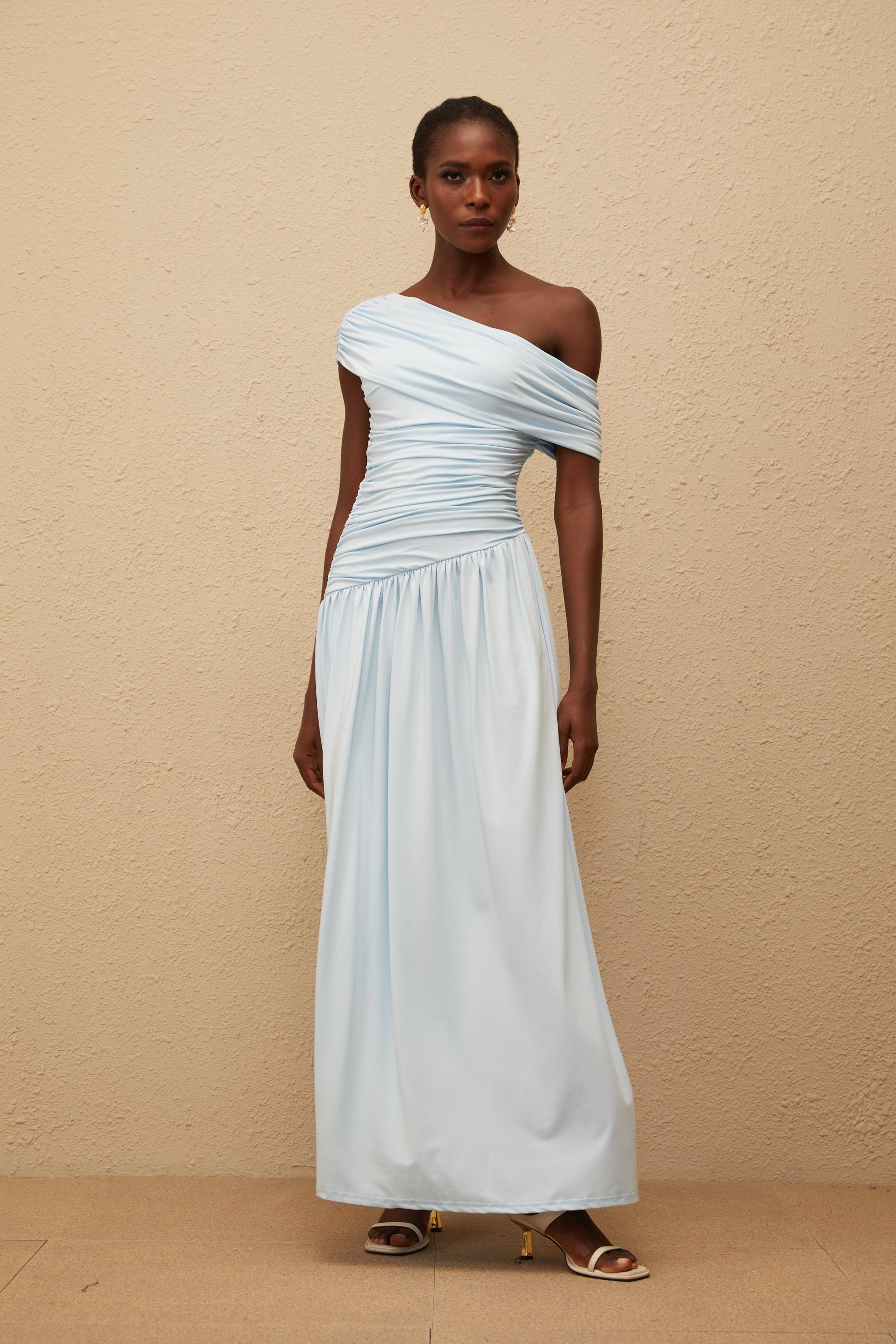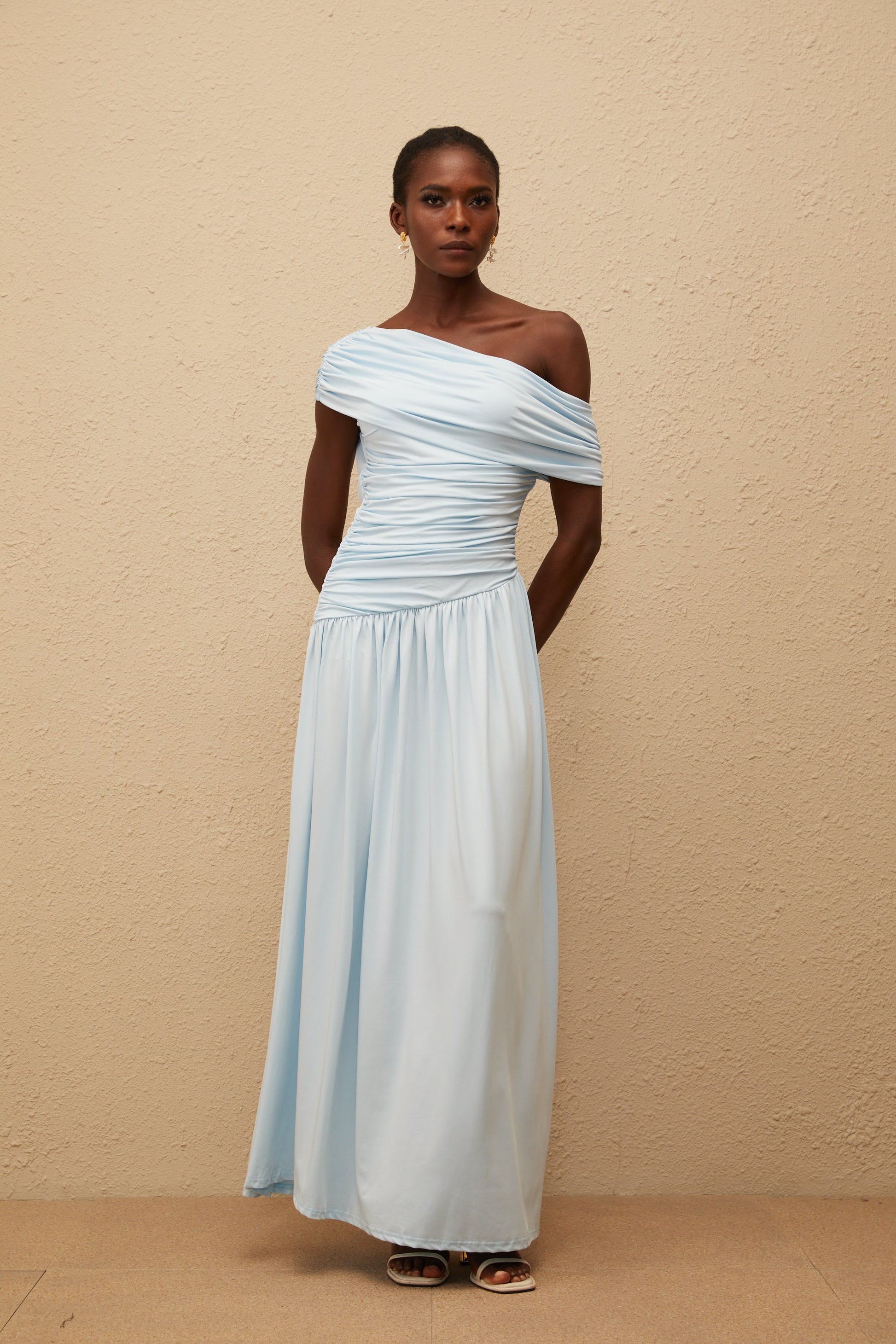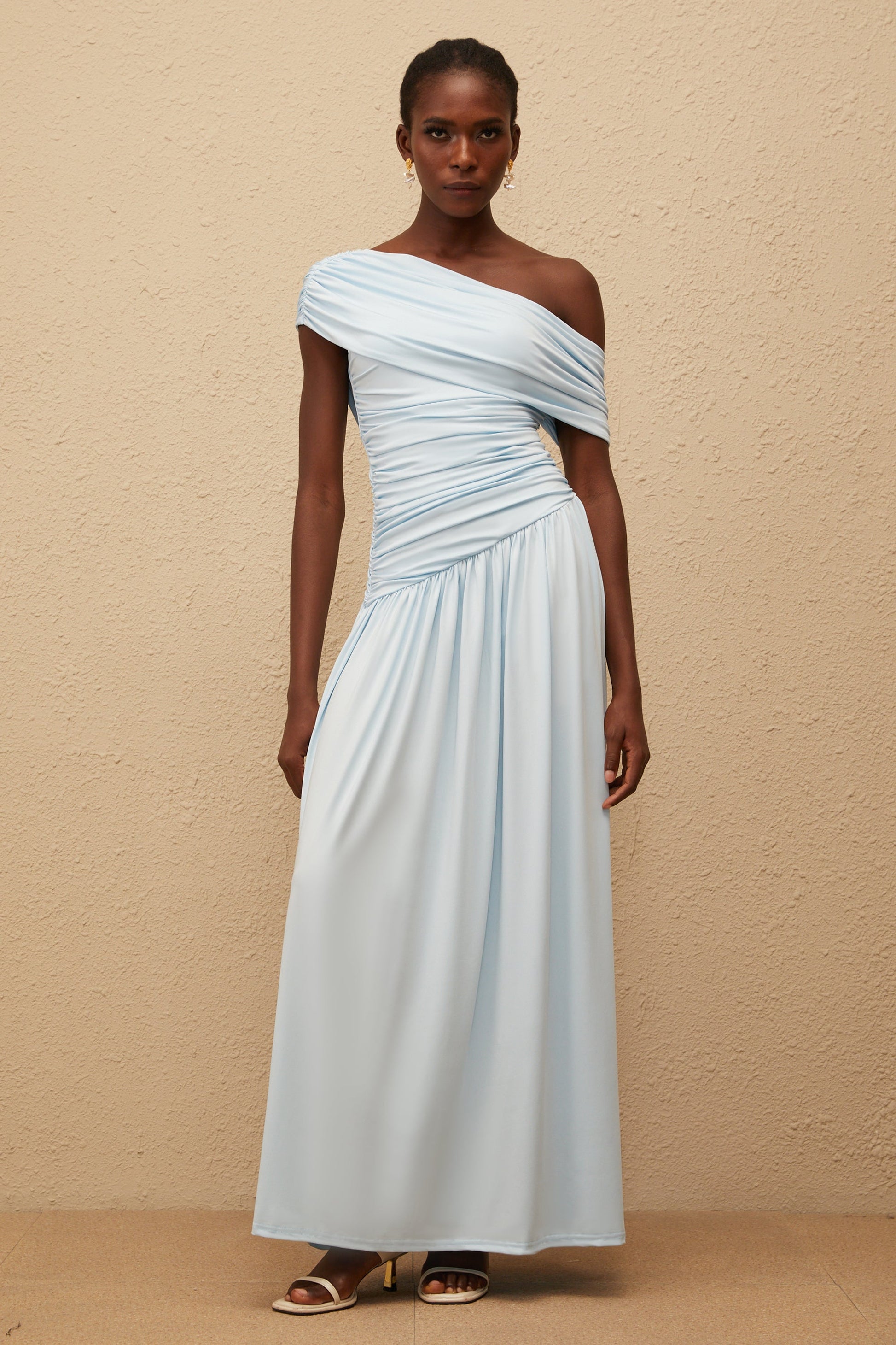 Lueur Blue One Shoulder Ruched Maxi Dress