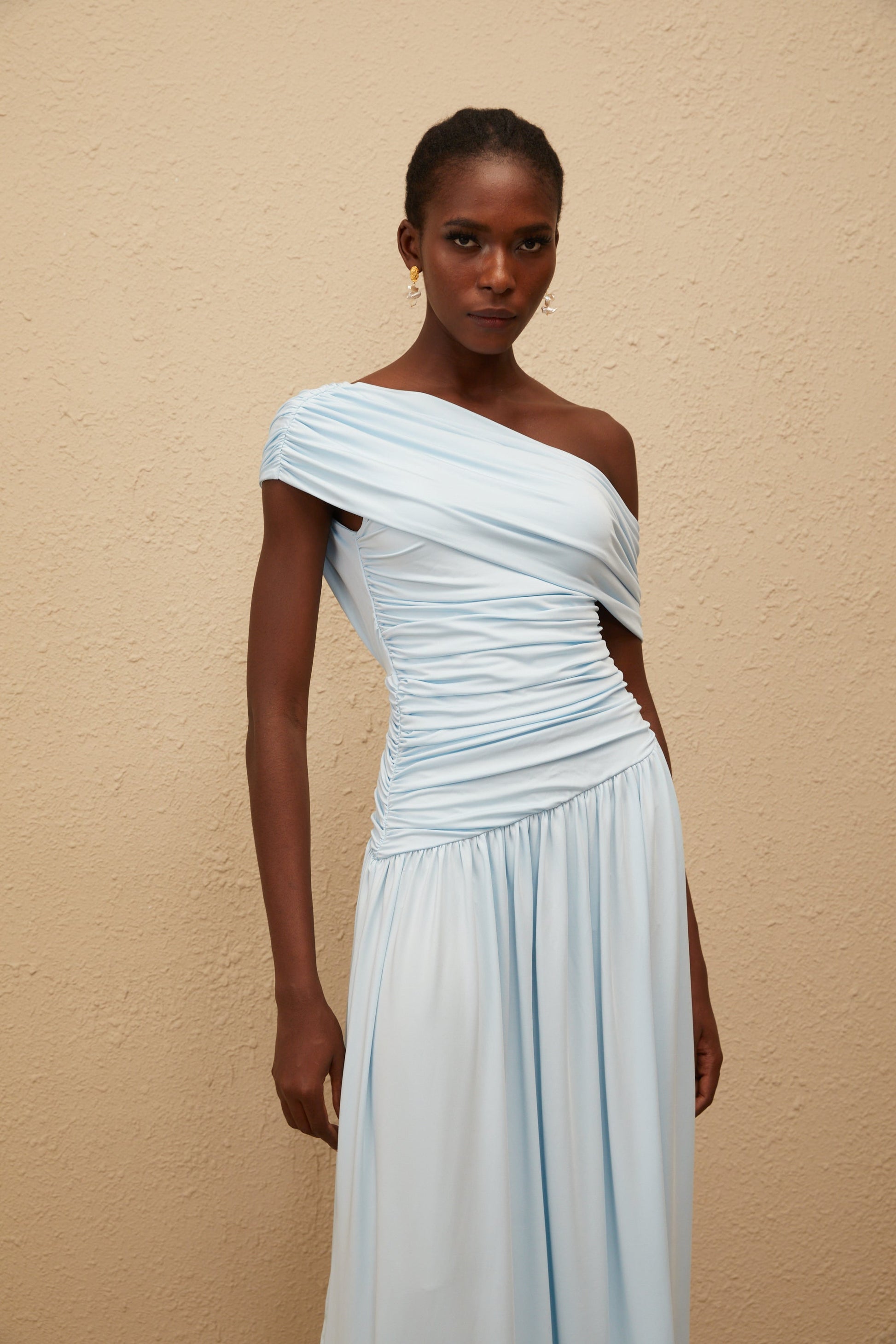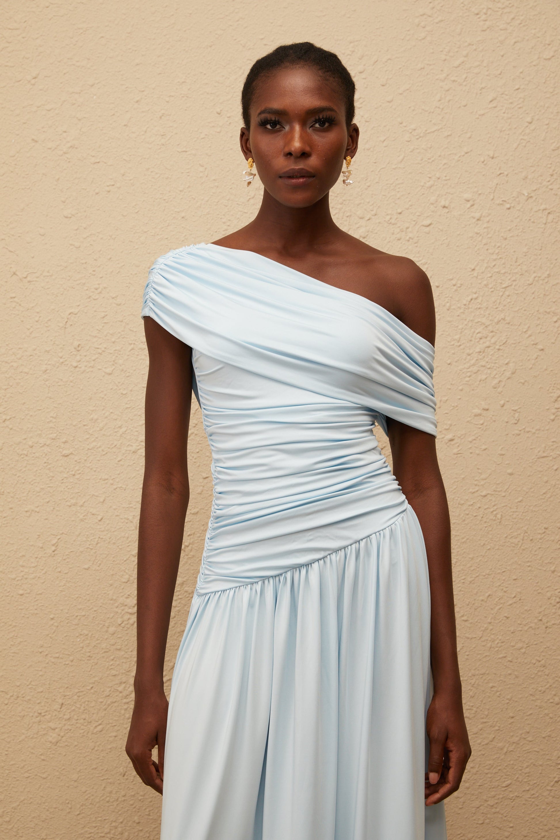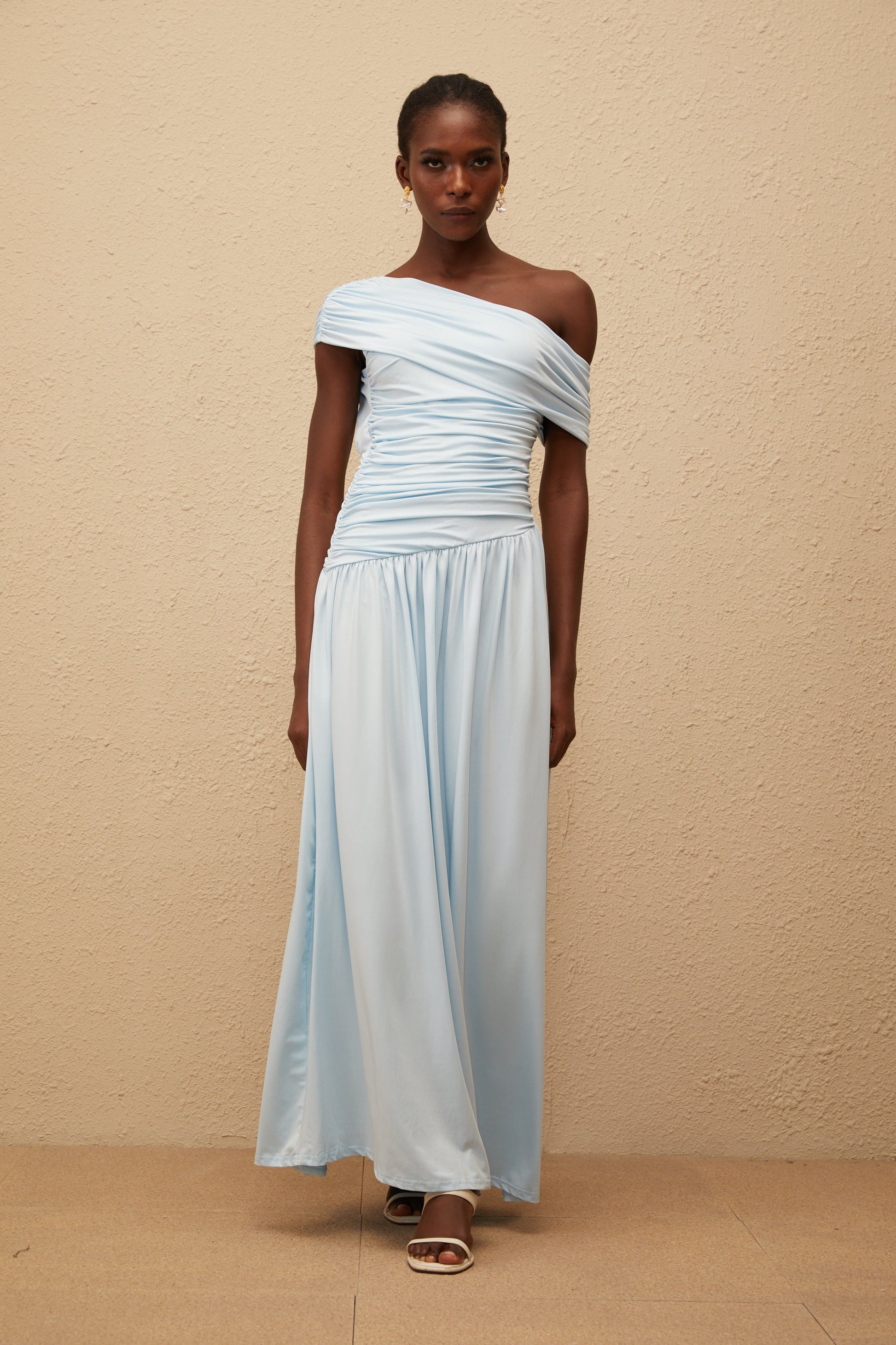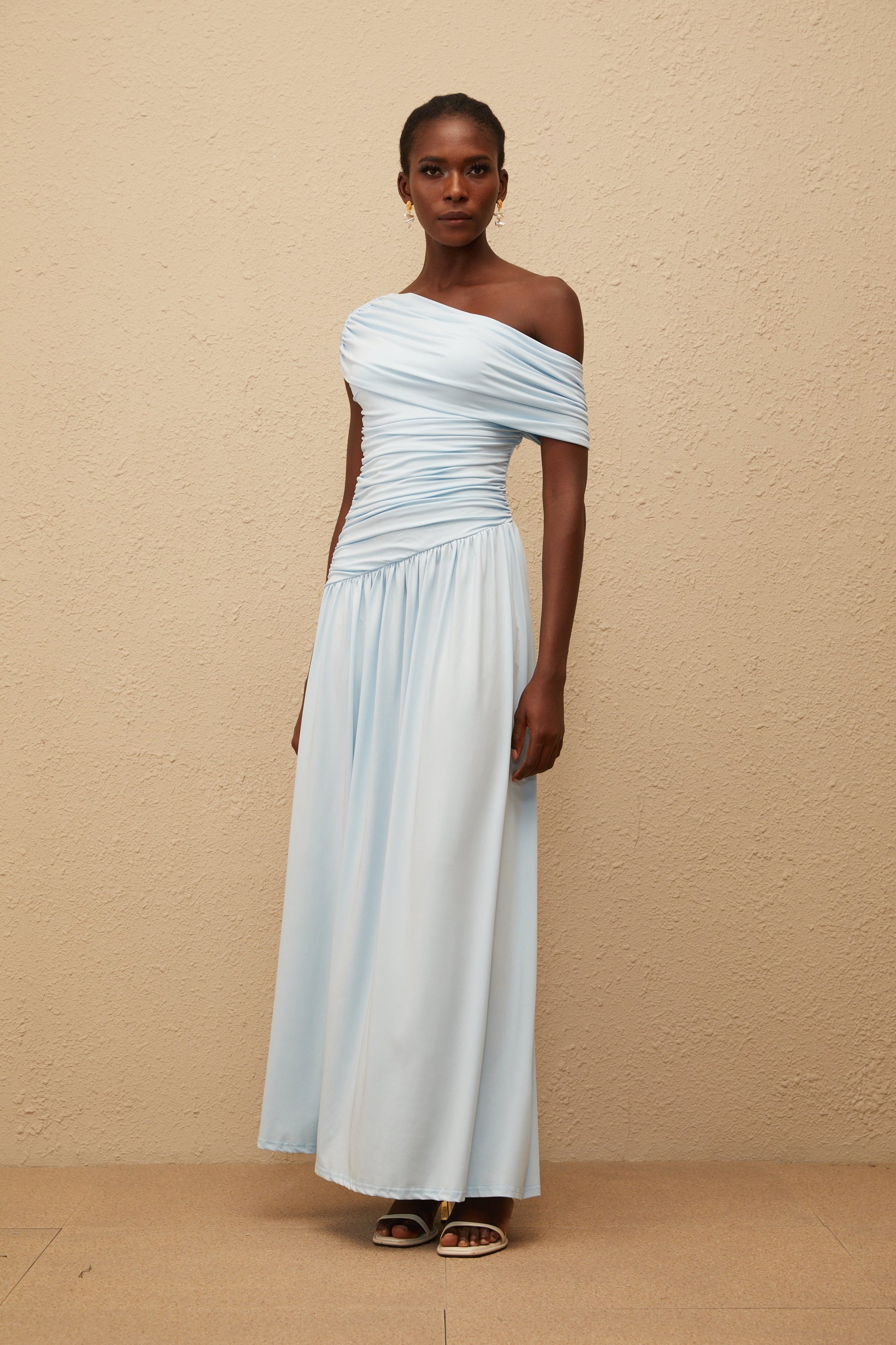 Lueur Blue One Shoulder Ruched Maxi Dress