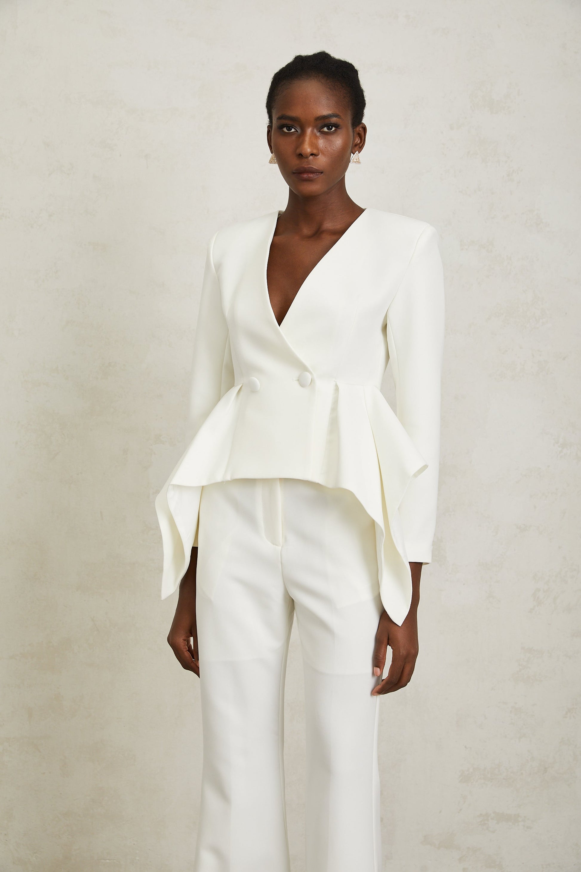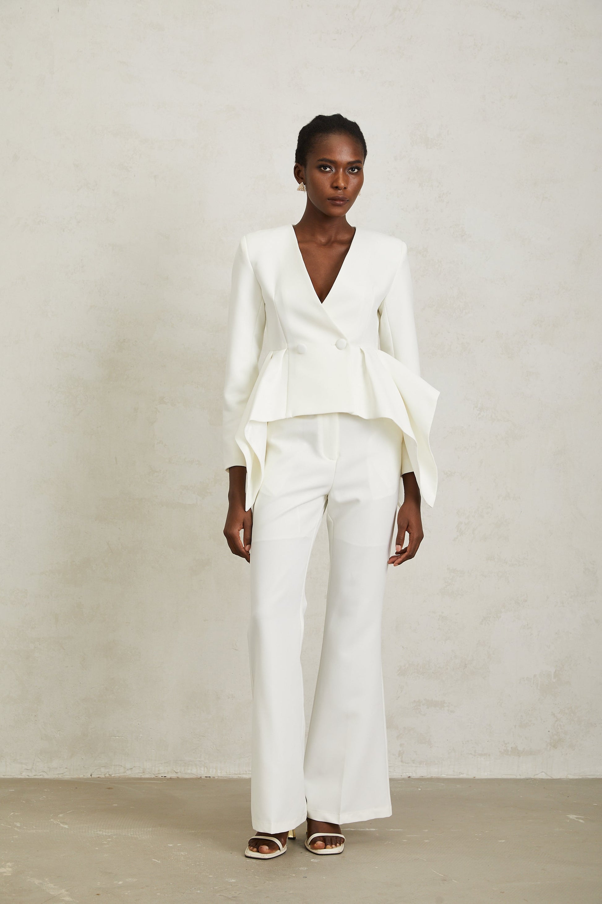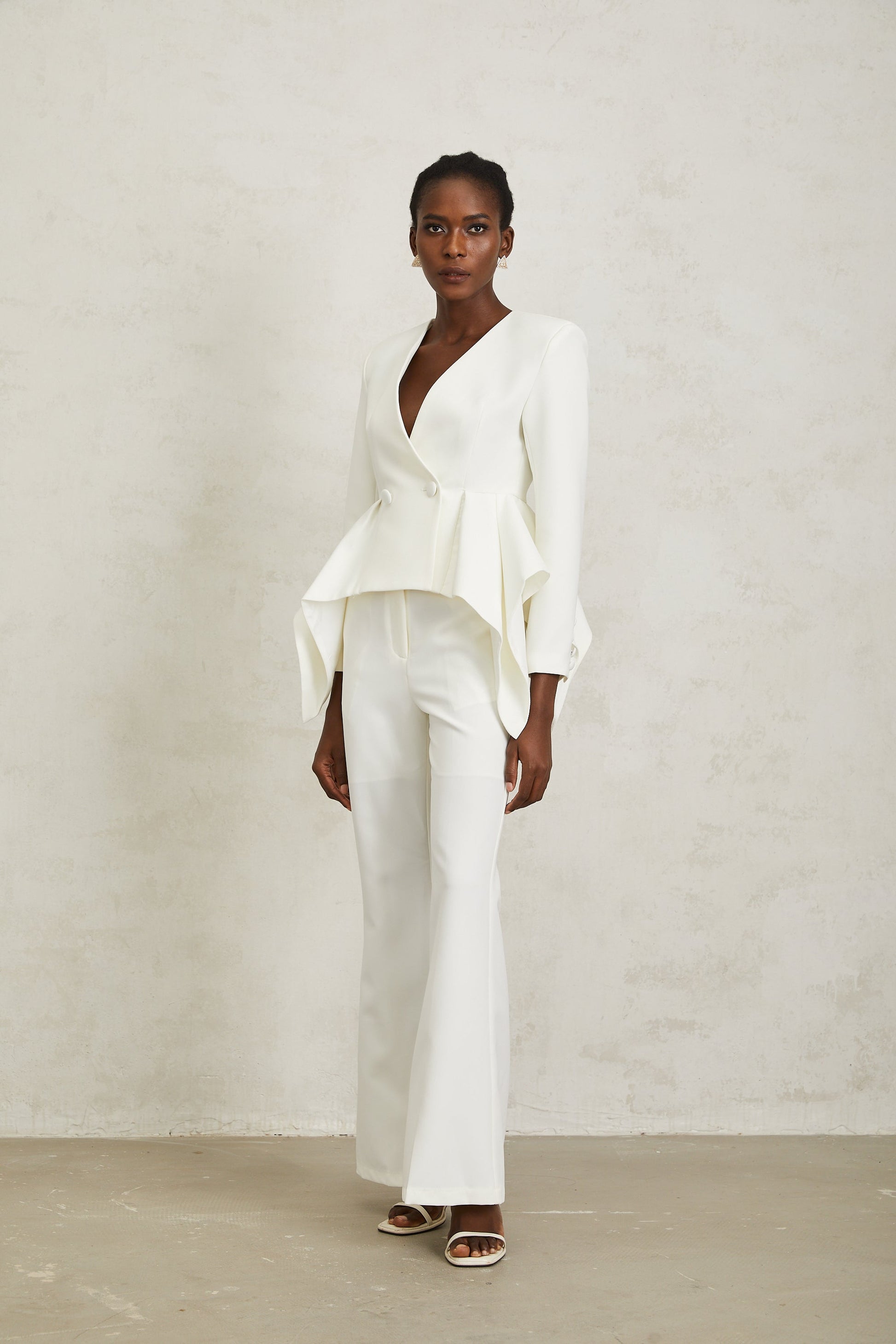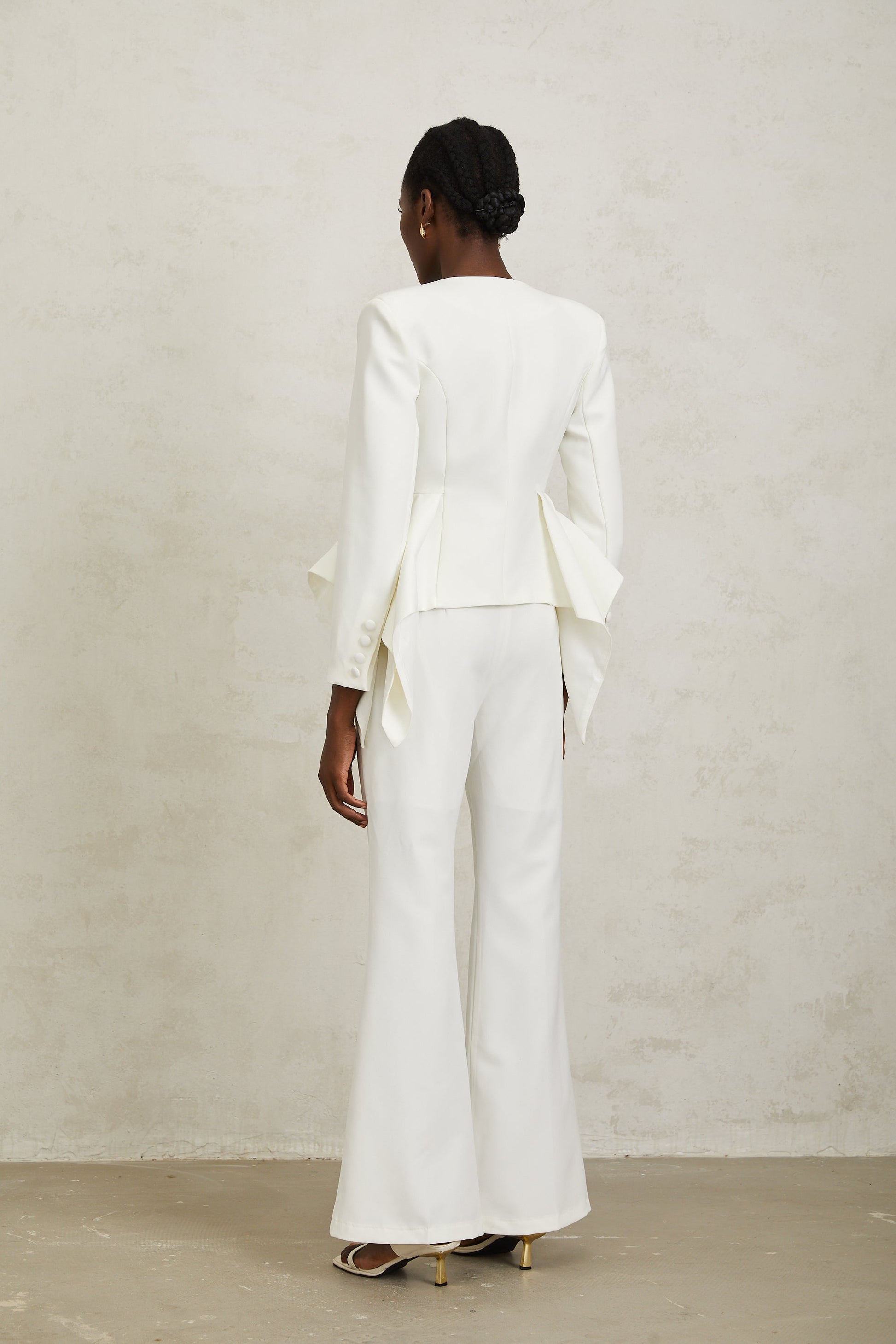 Luisa White Peplum Ruffled Waist Jacket & Trousers Set