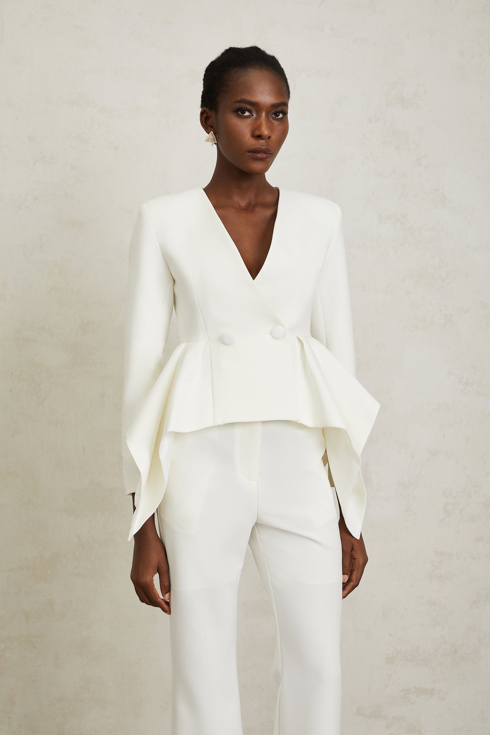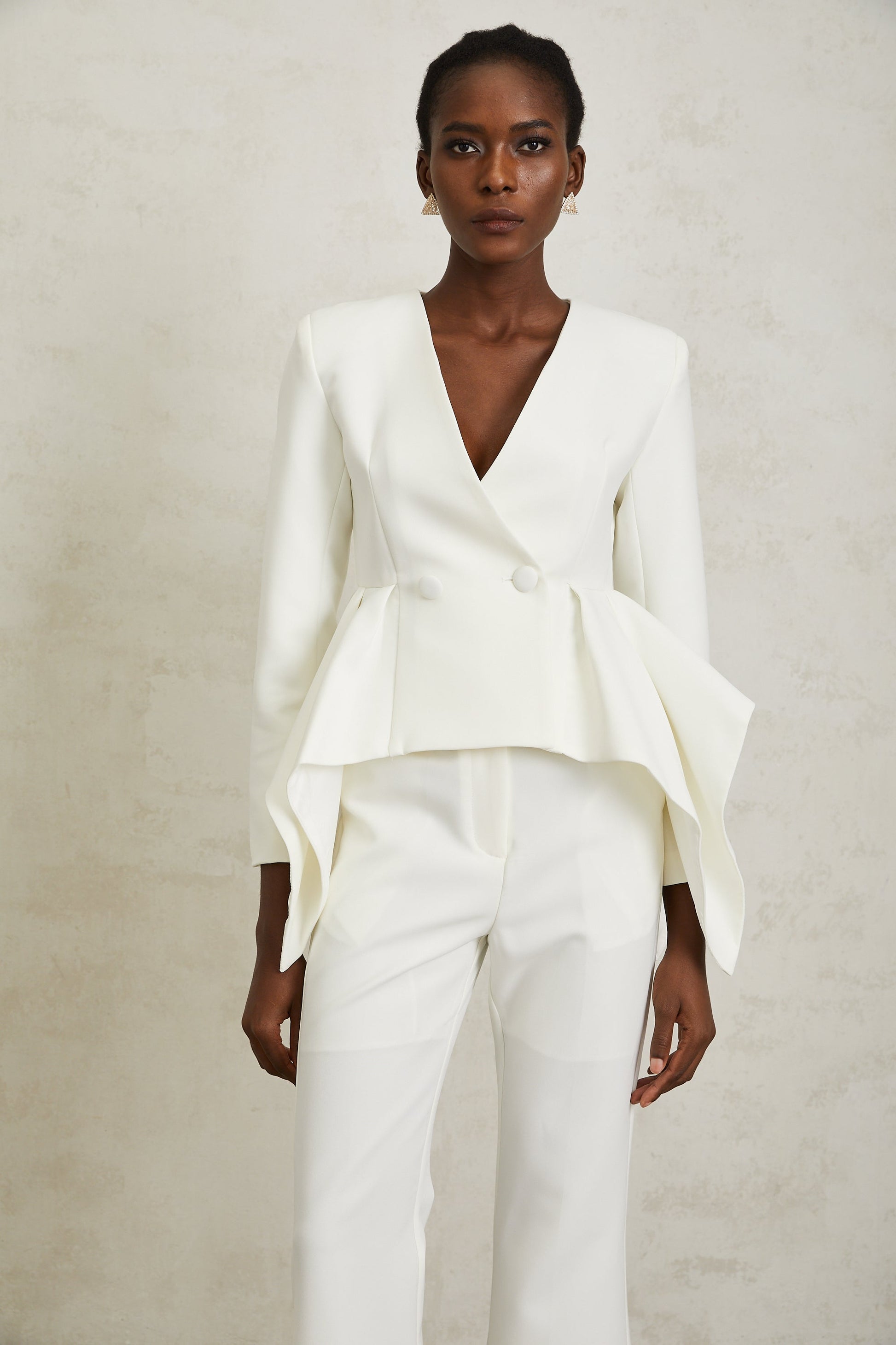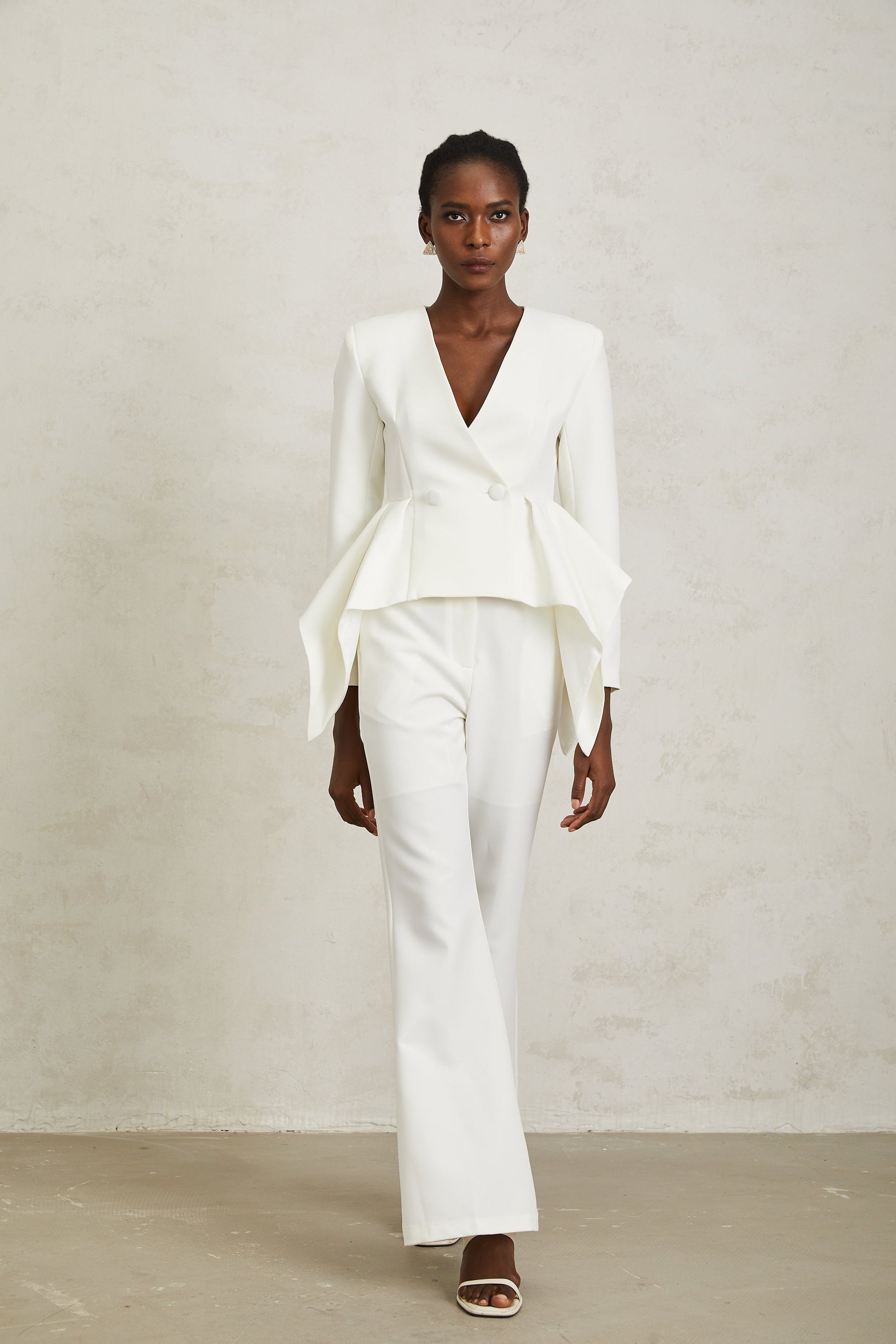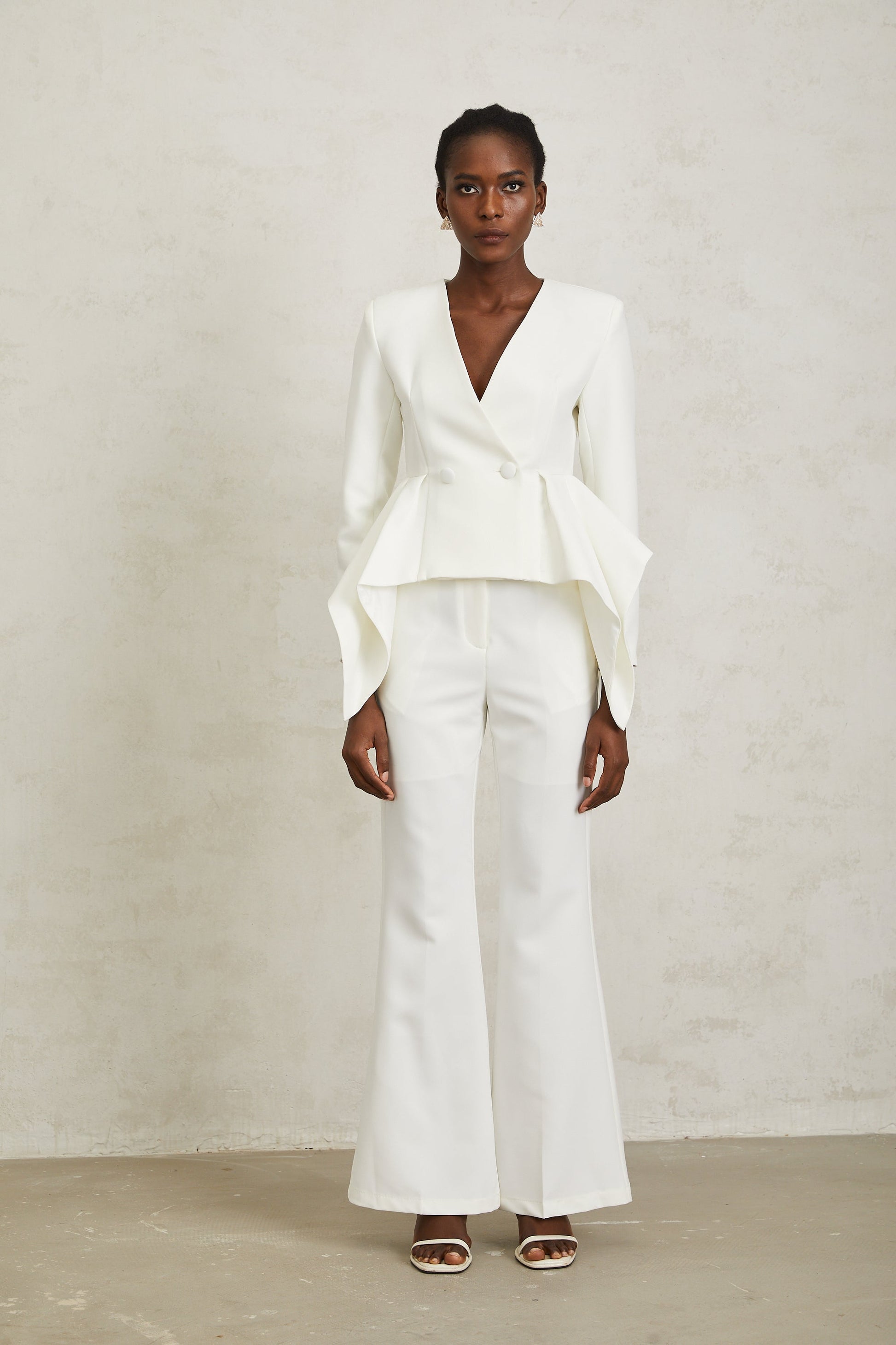 Luisa White Peplum Ruffled Waist Jacket & Trousers Set