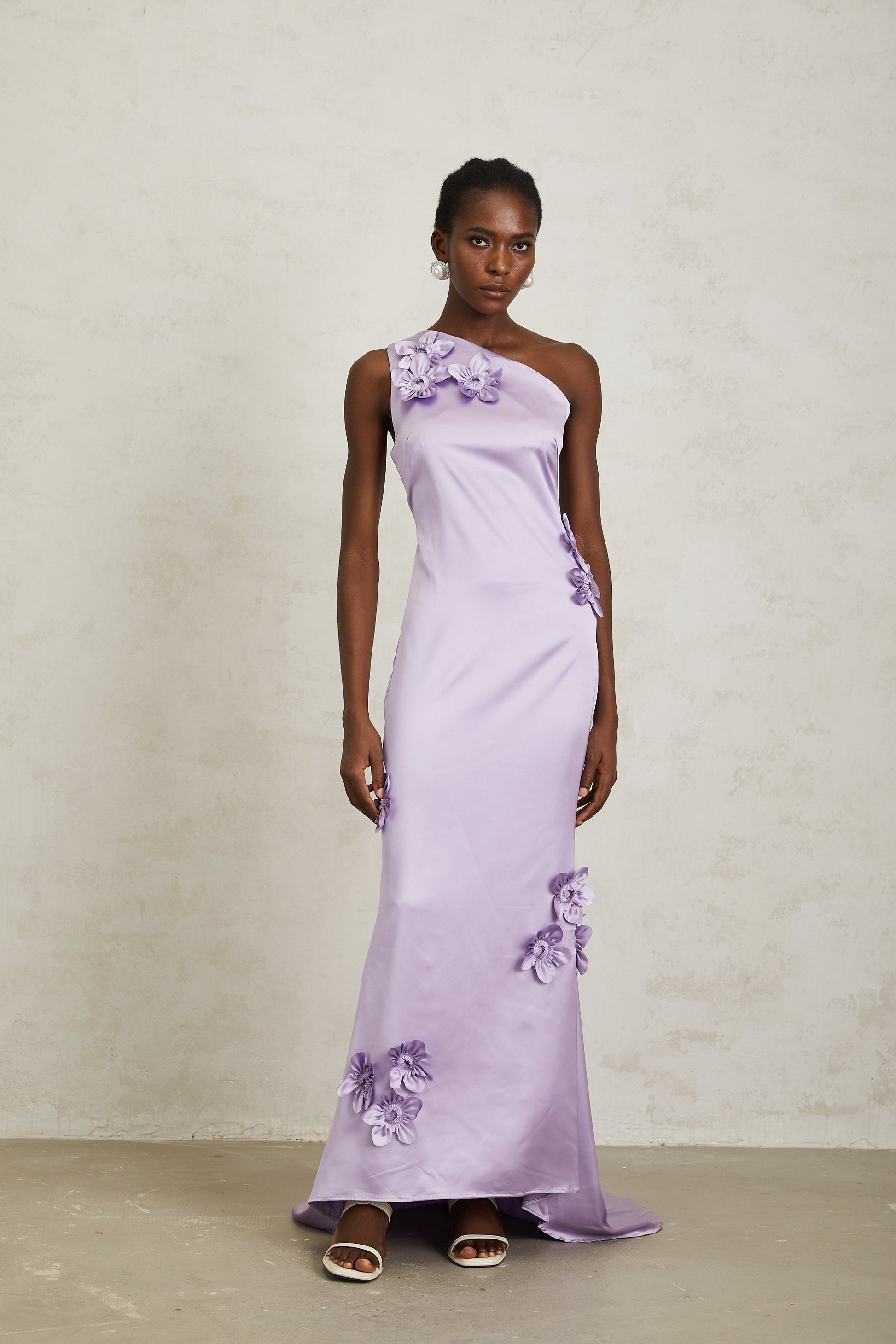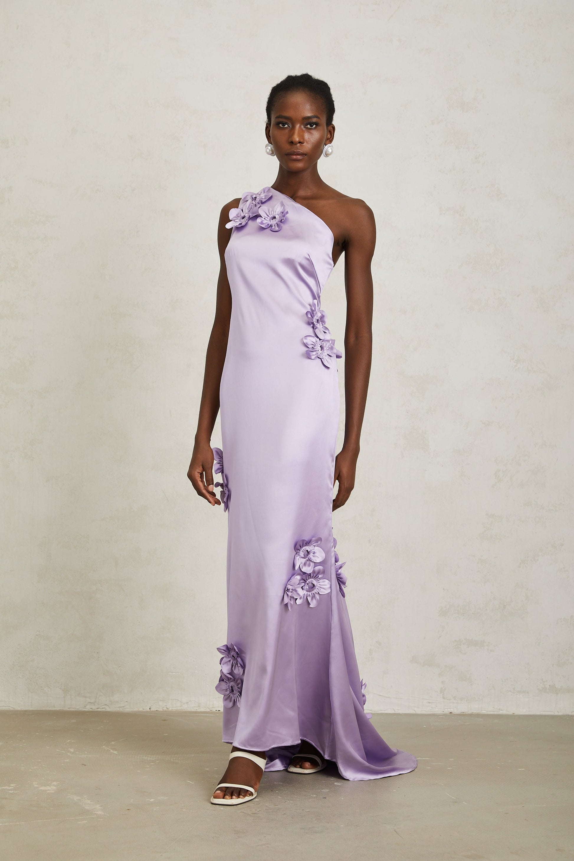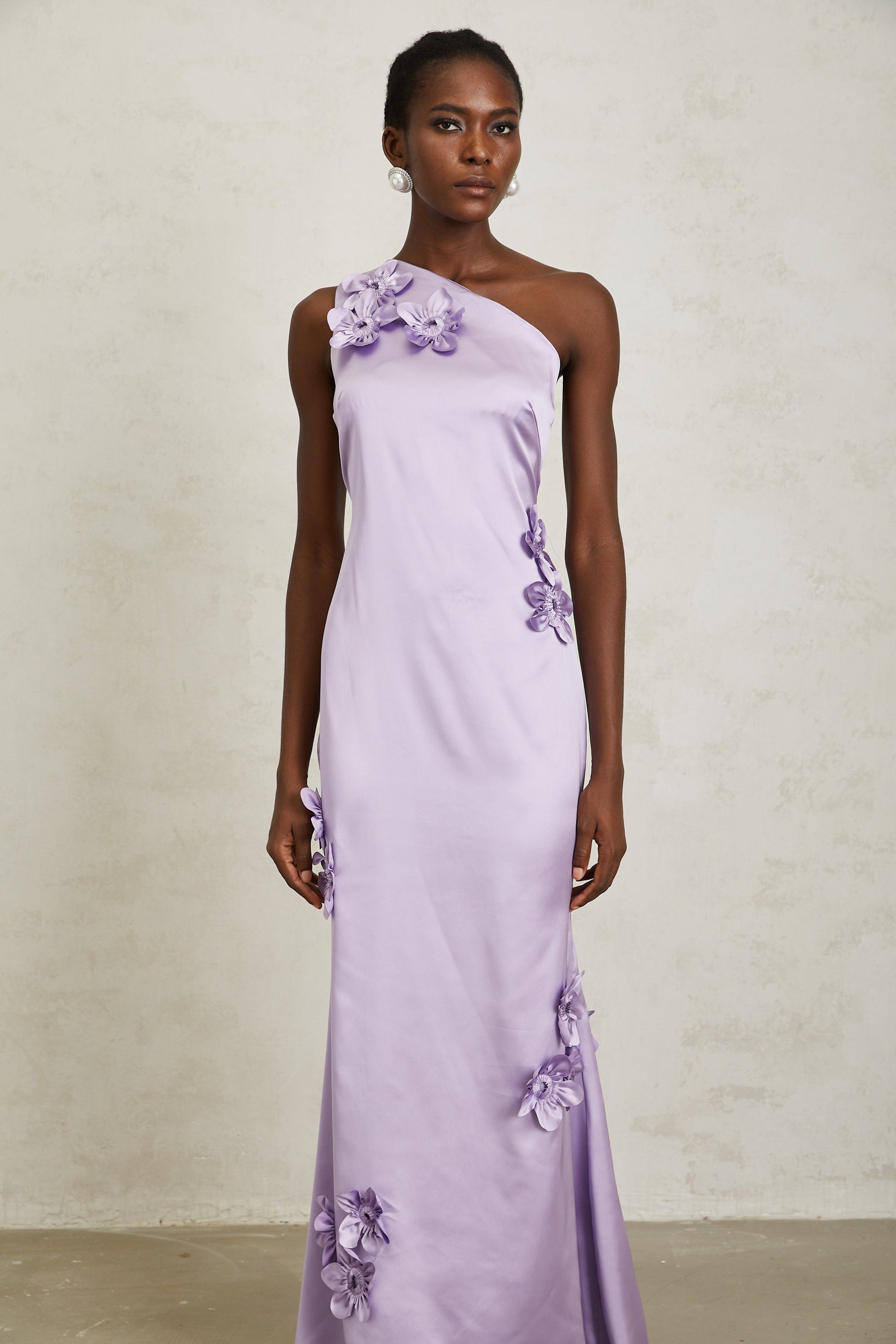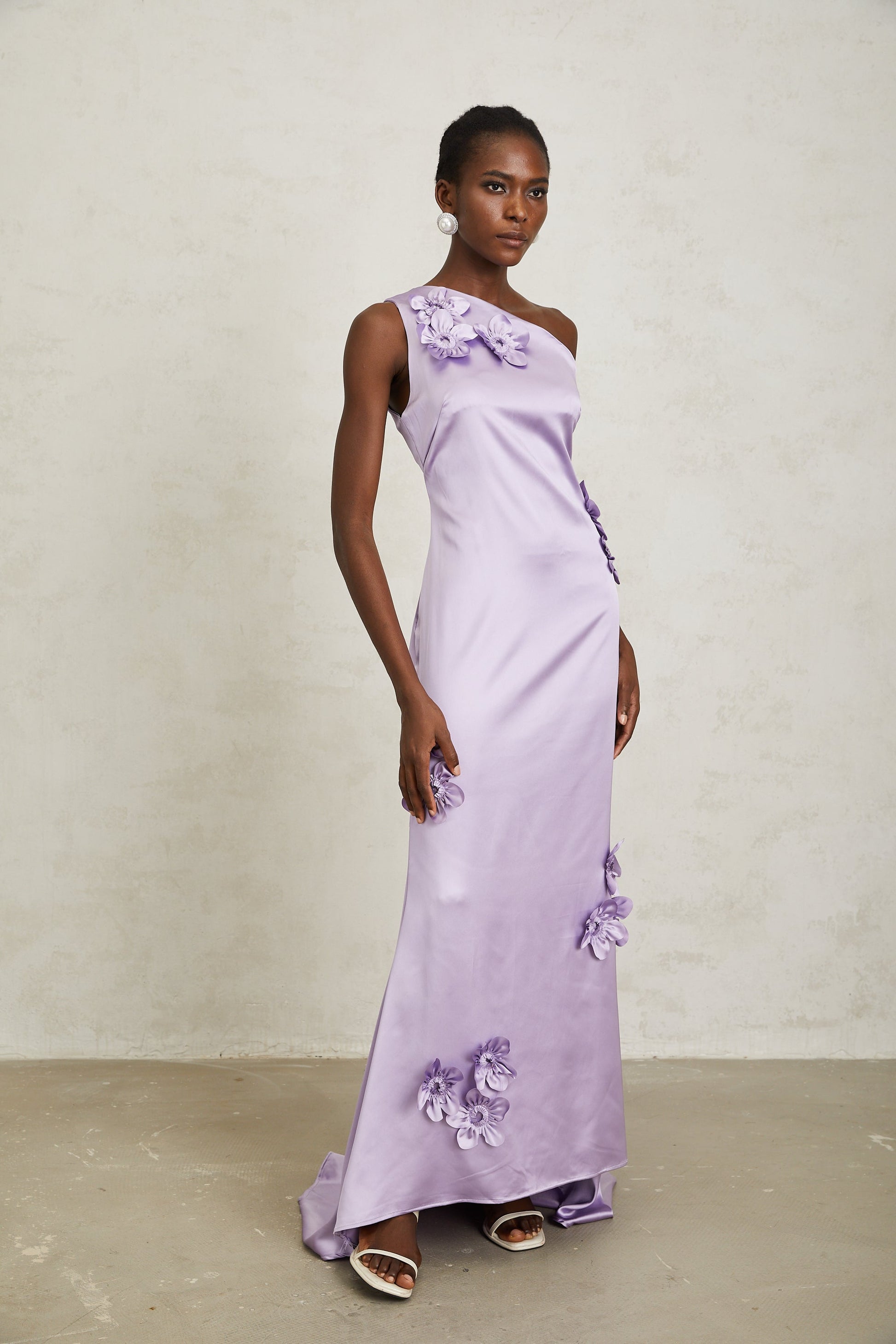 Magali Purple Mono Shoulder Floral Satin Maxi Dress