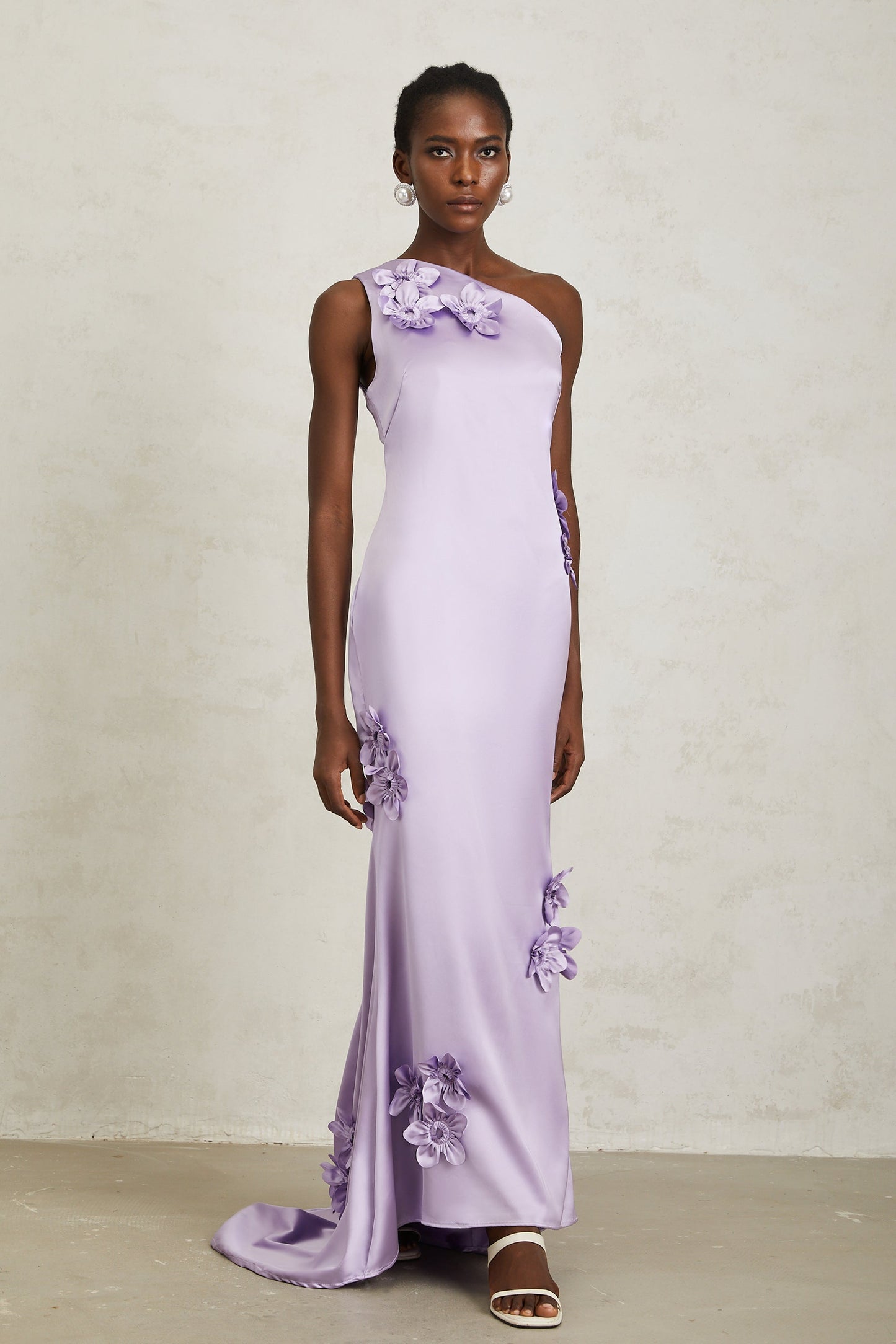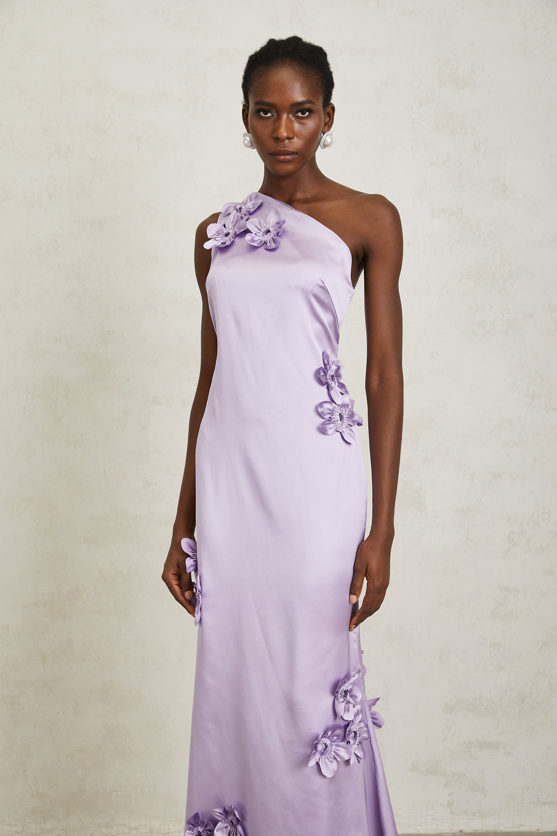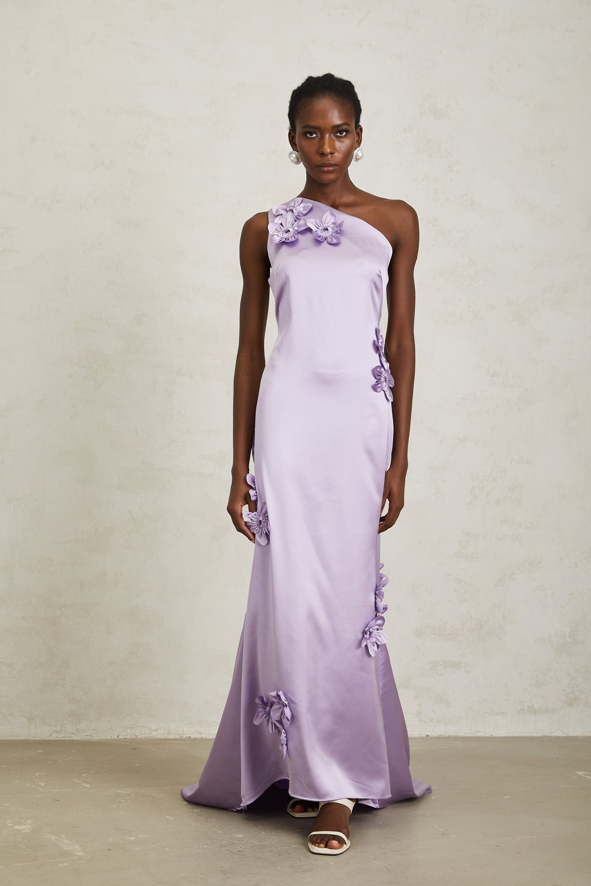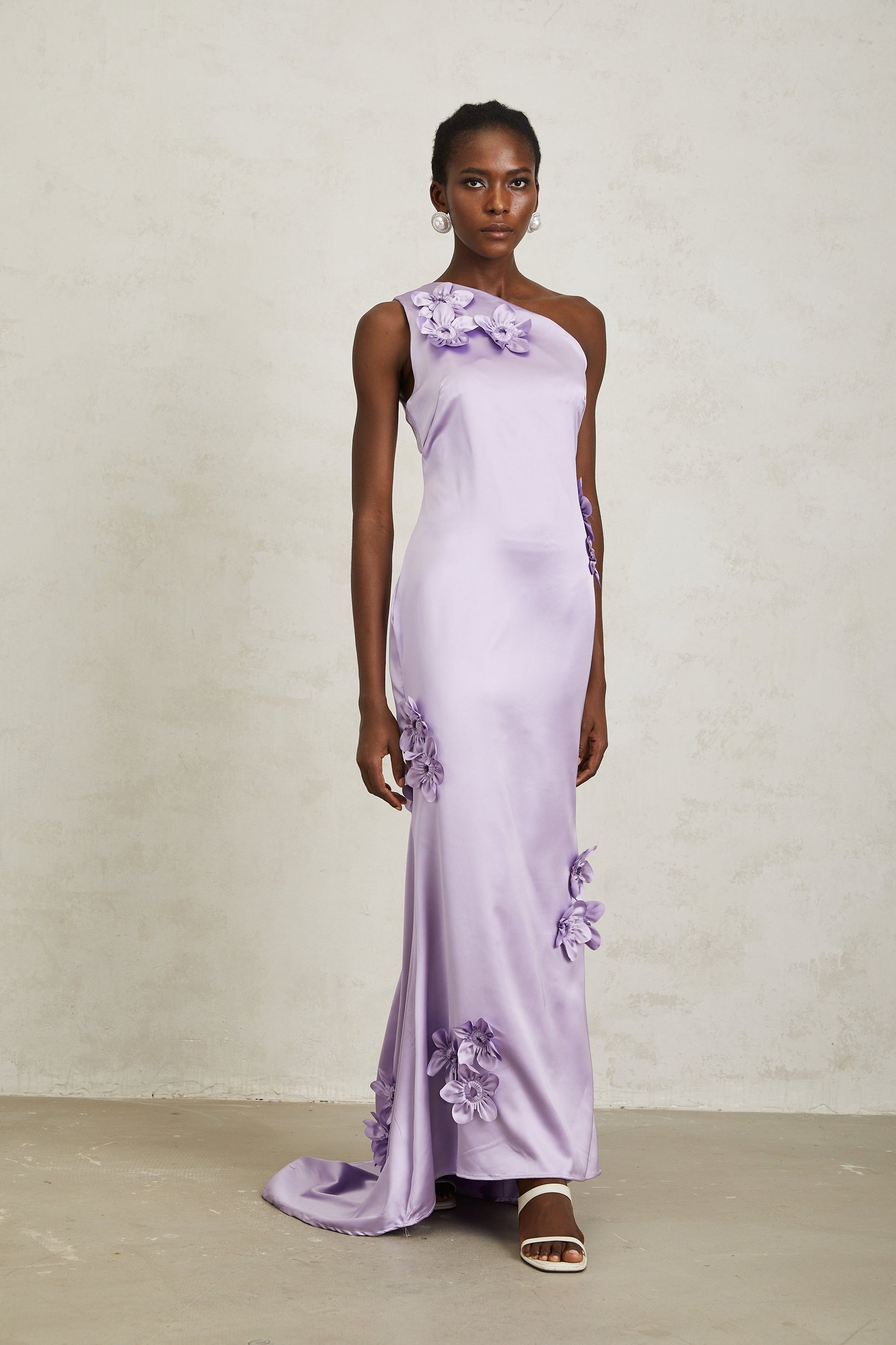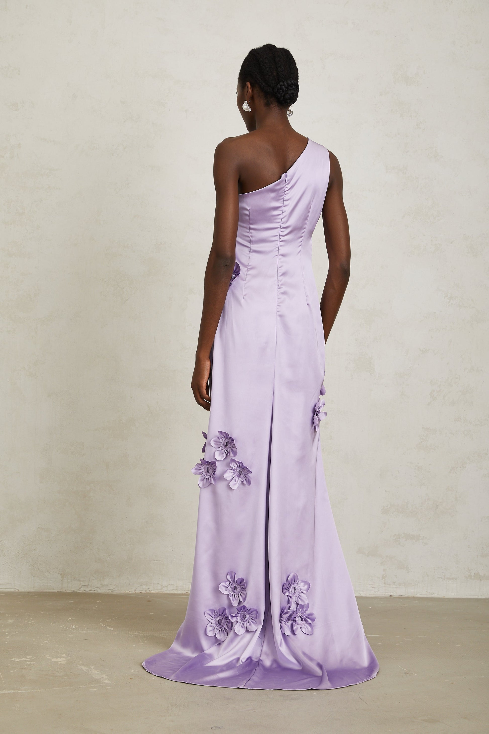 Magali Purple Mono Shoulder Floral Satin Maxi Dress