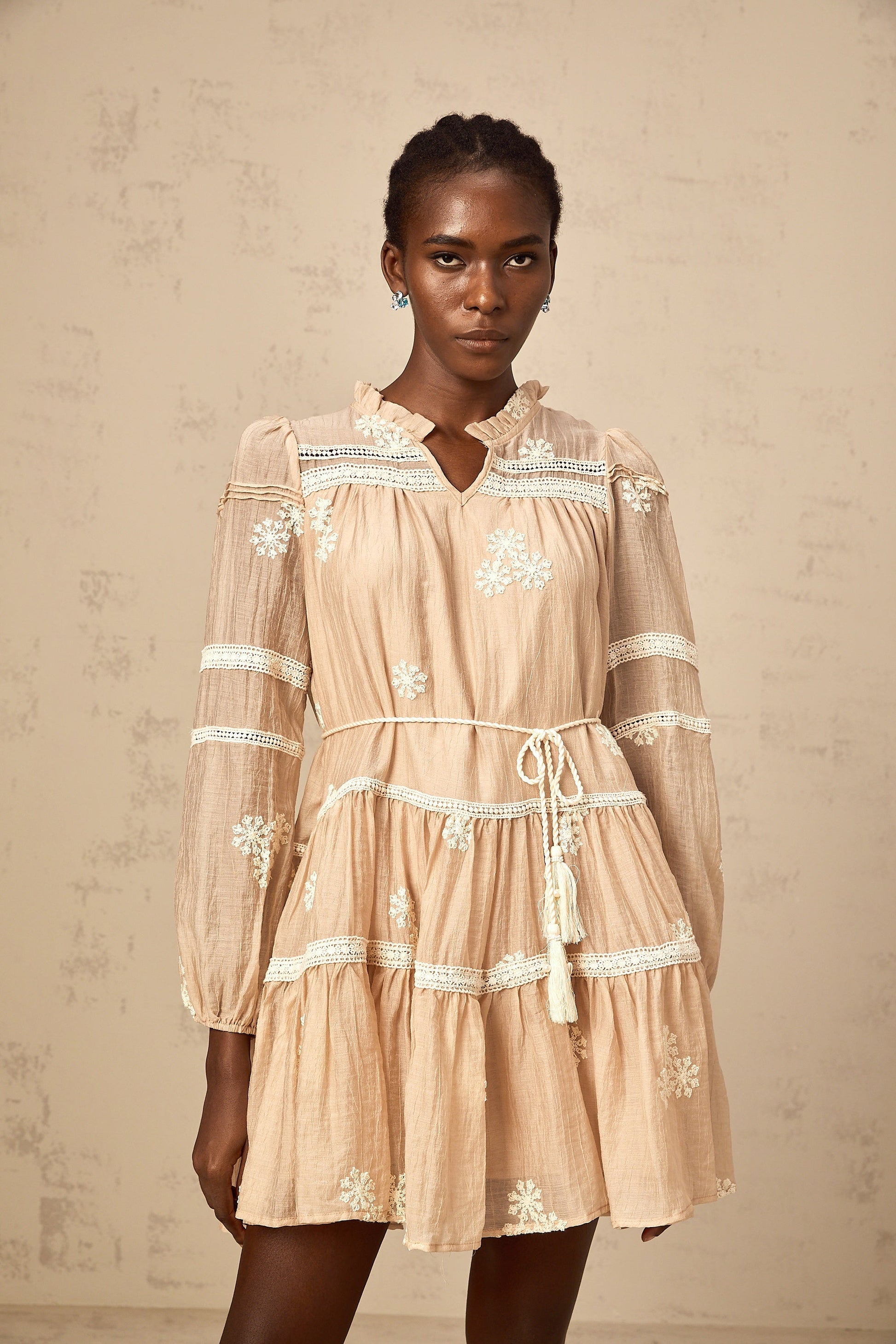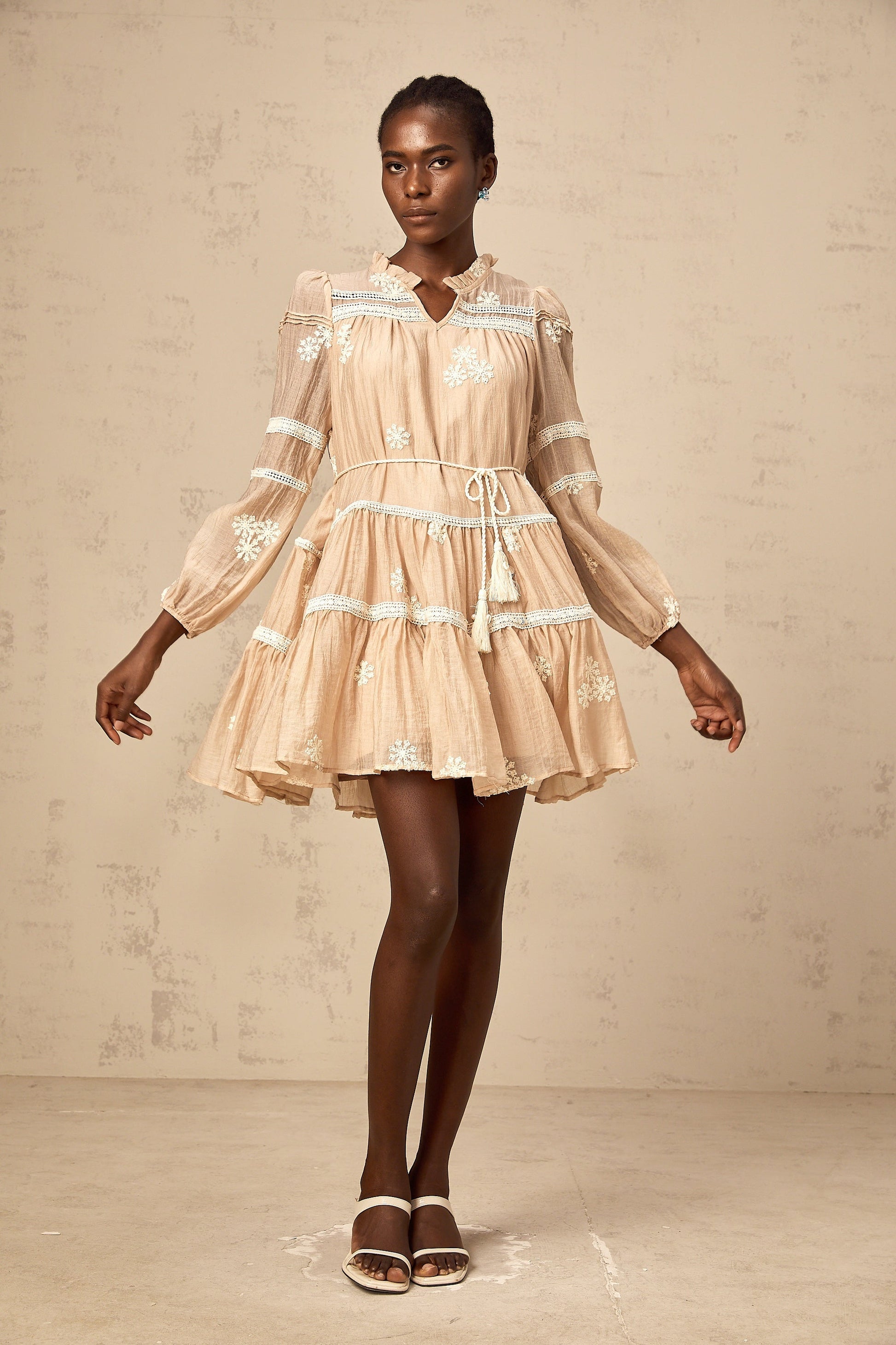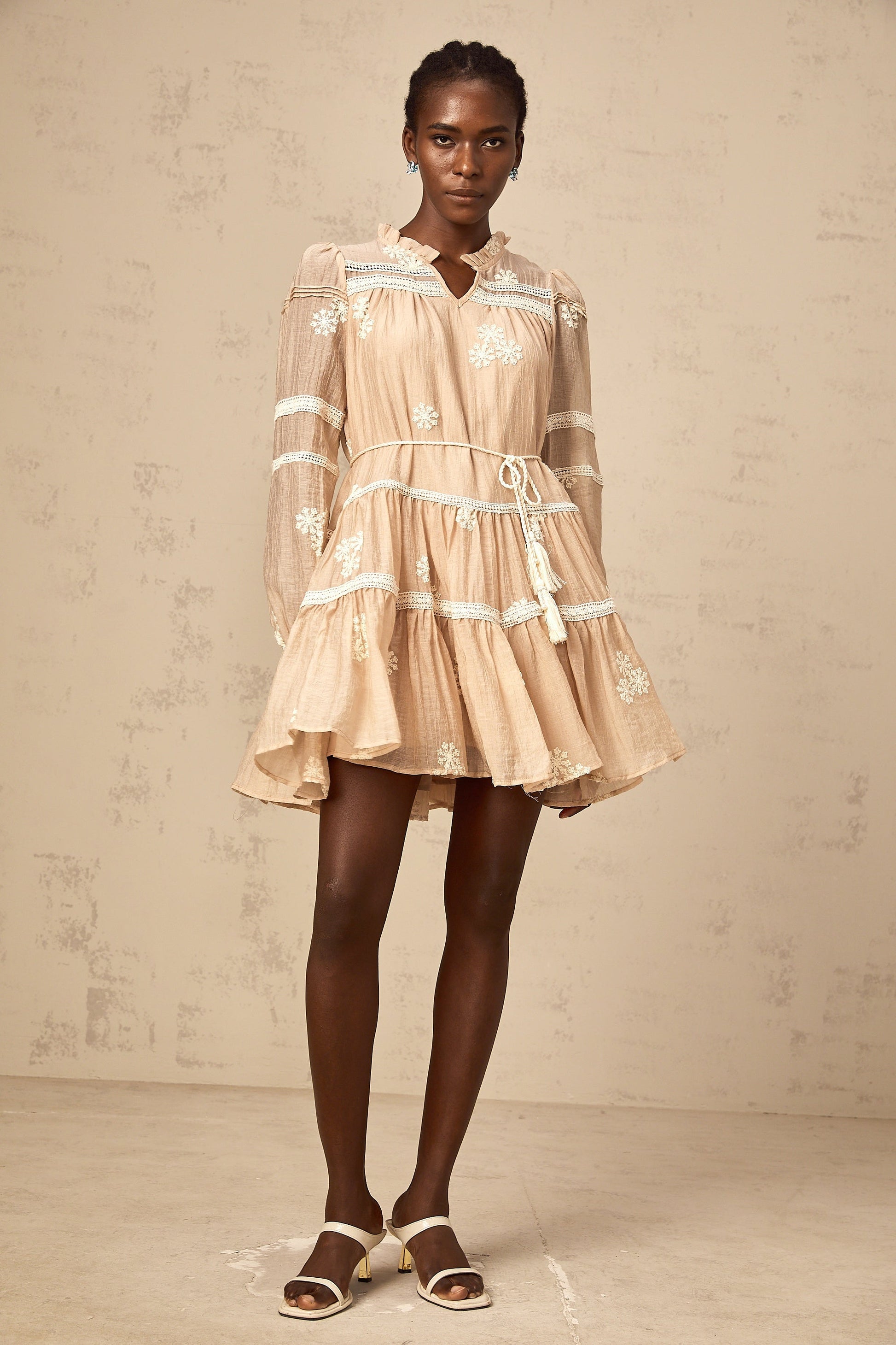 Margaux neutrals flower-embroidered tiered mini dress