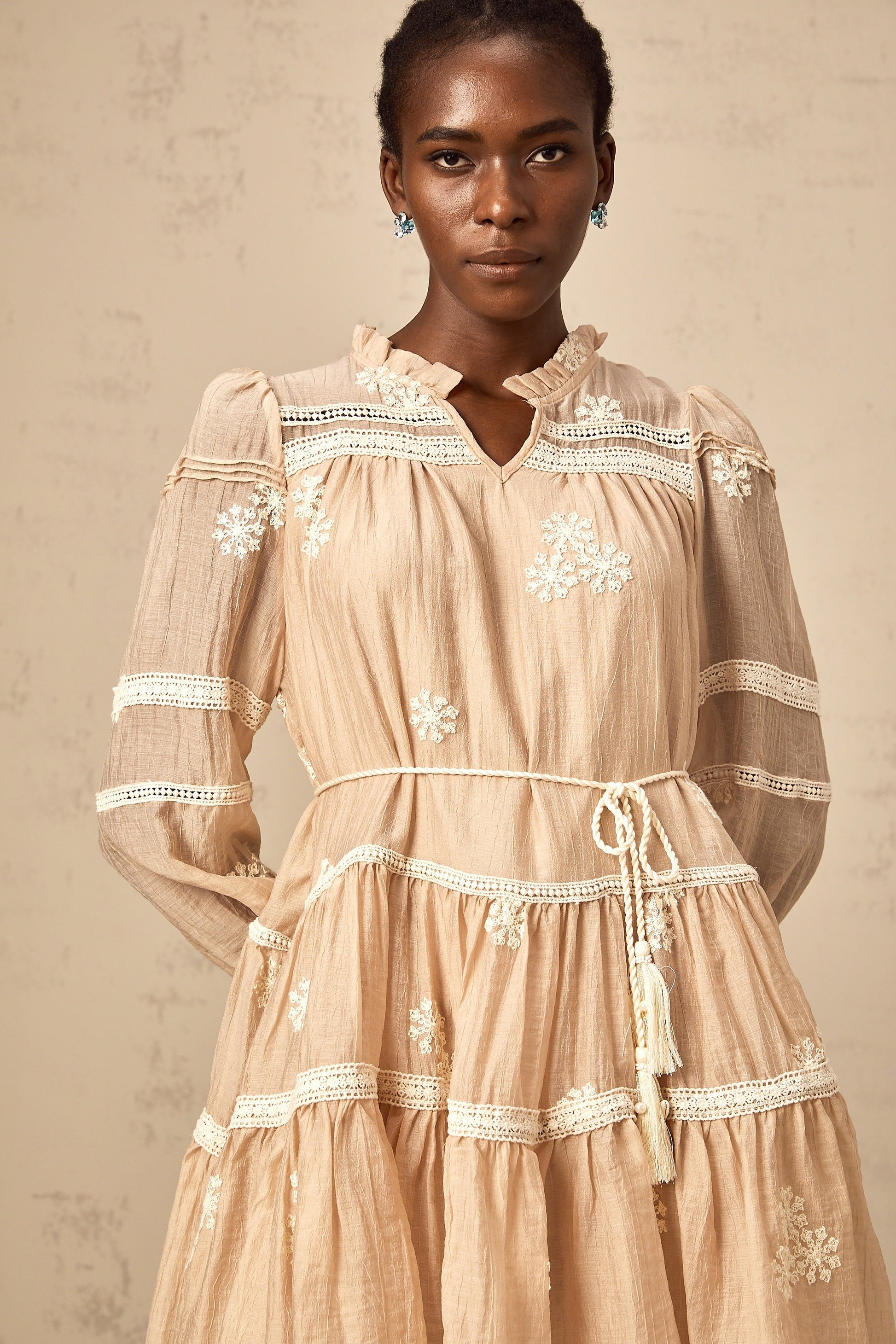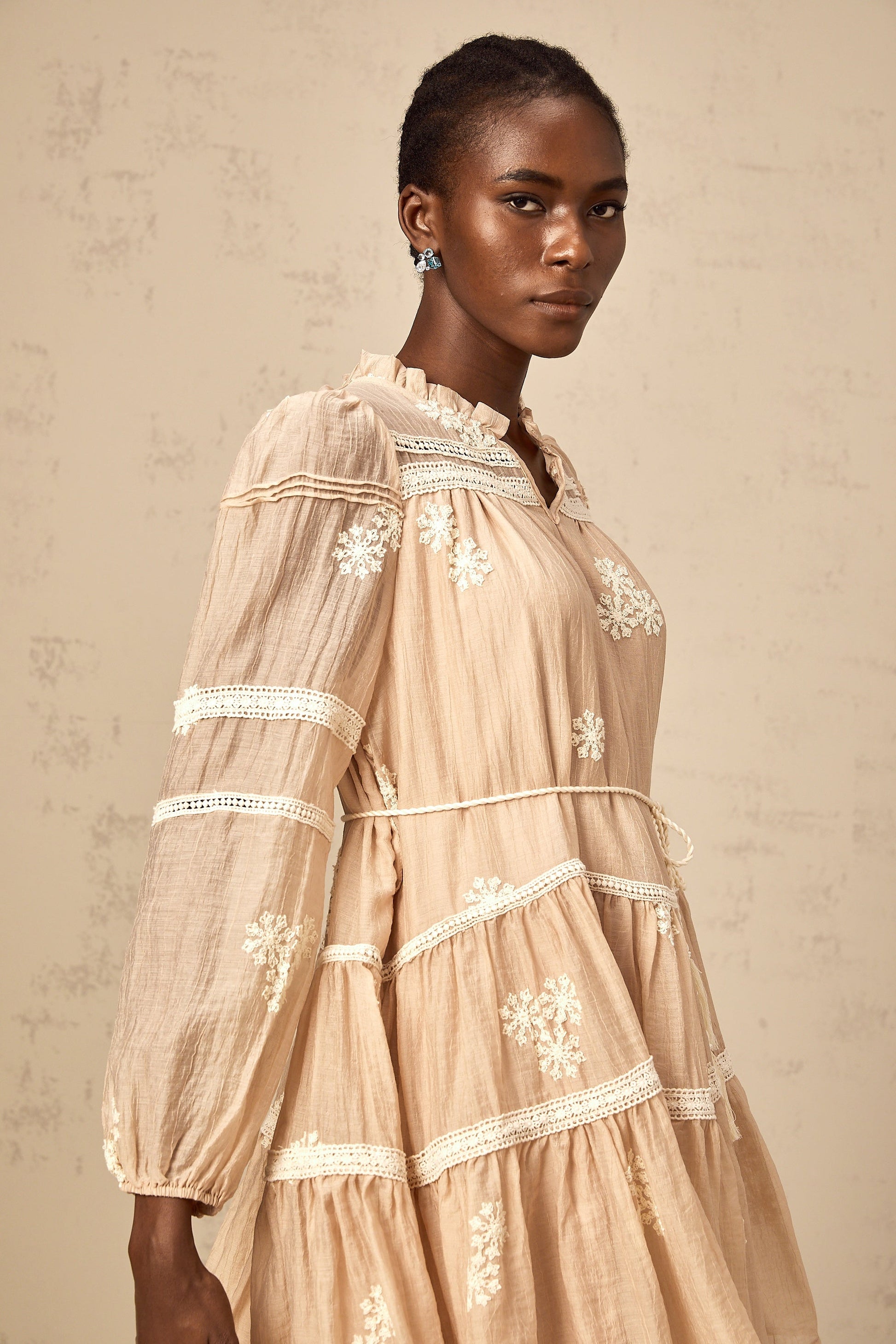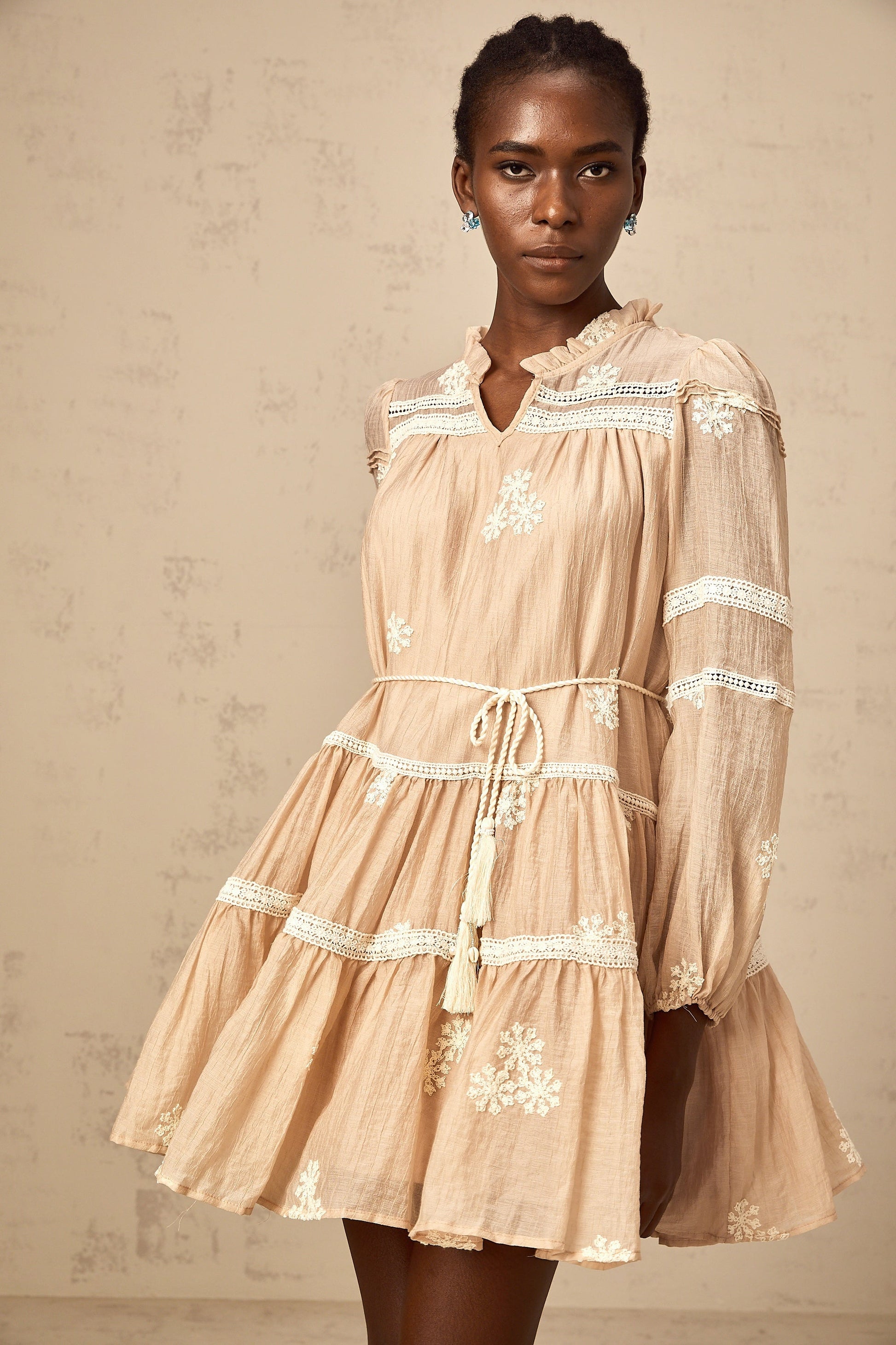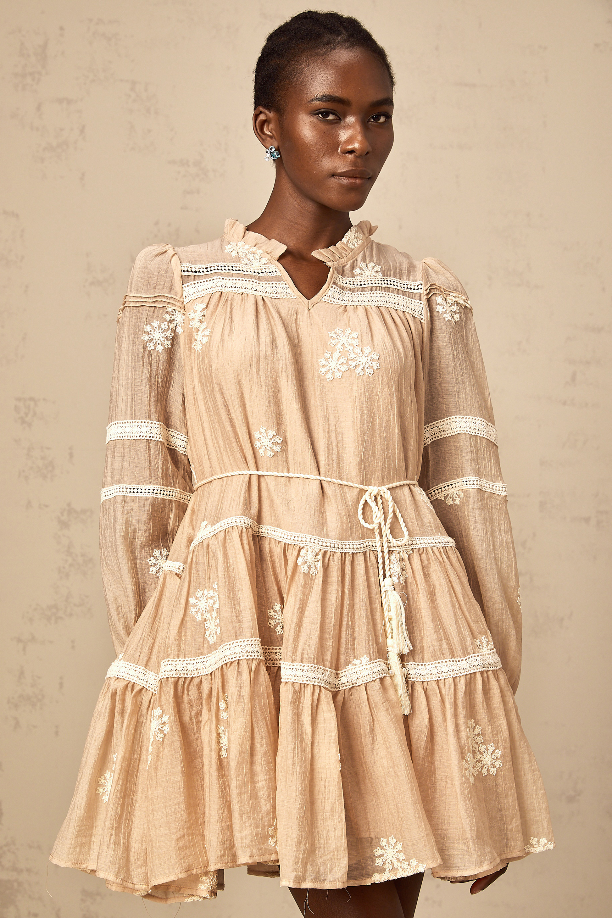 Margaux neutrals flower-embroidered tiered mini dress