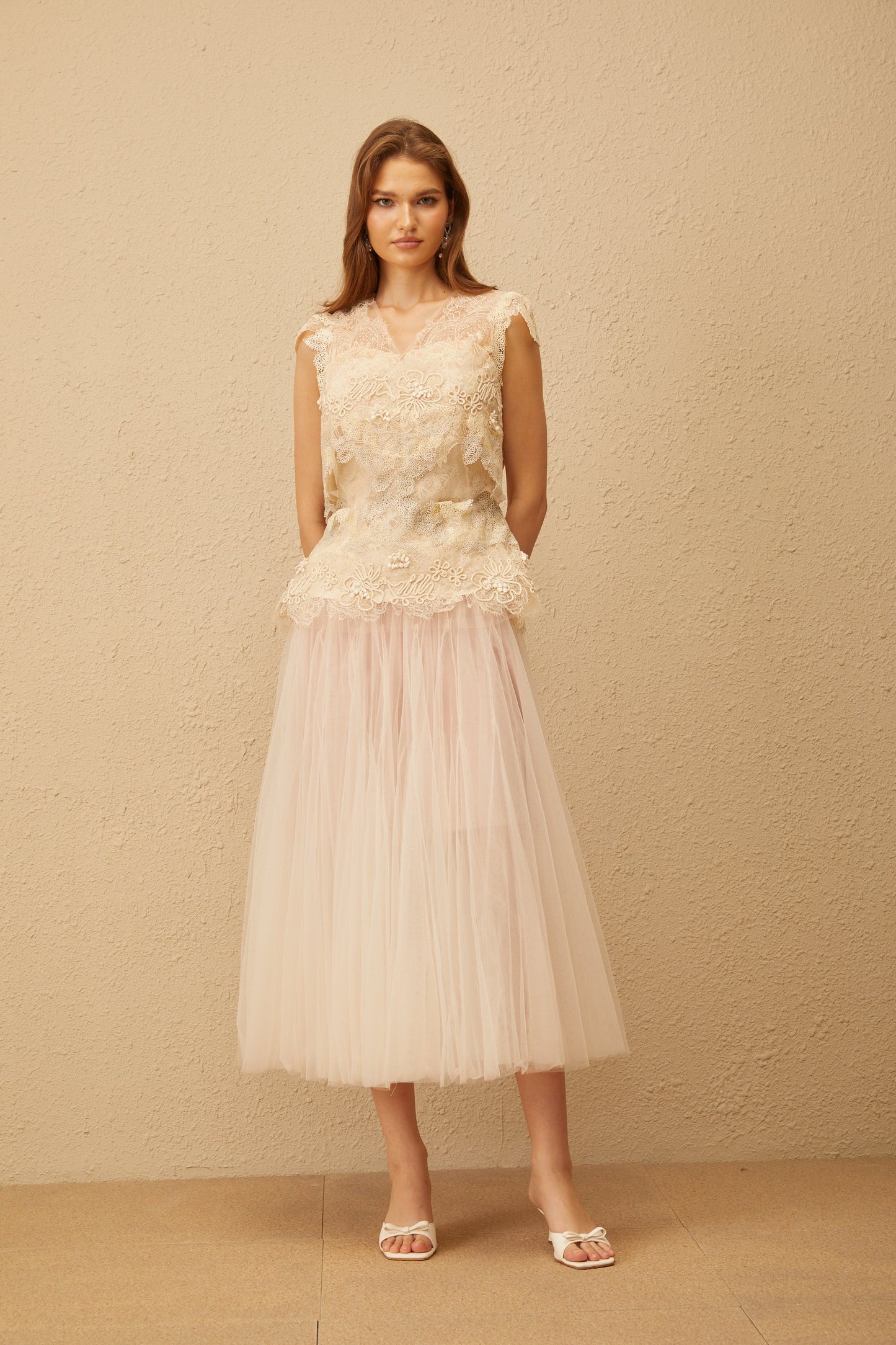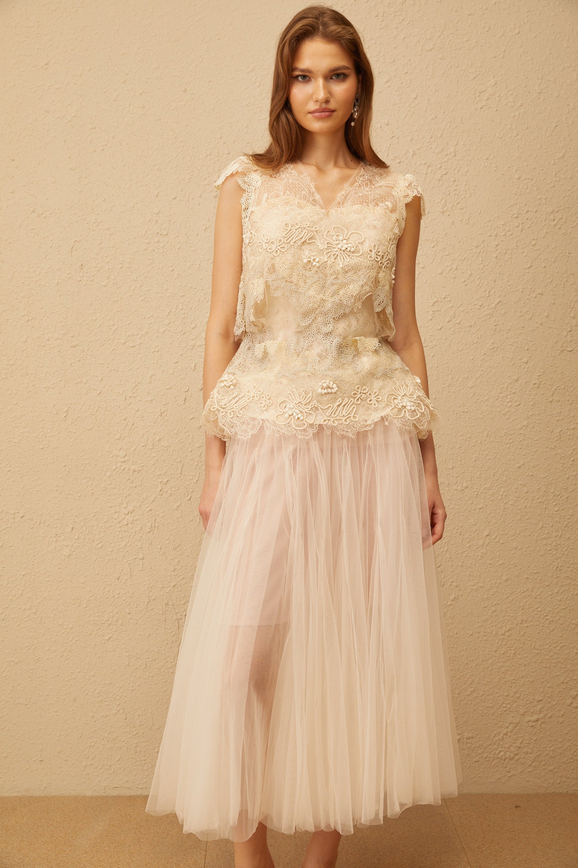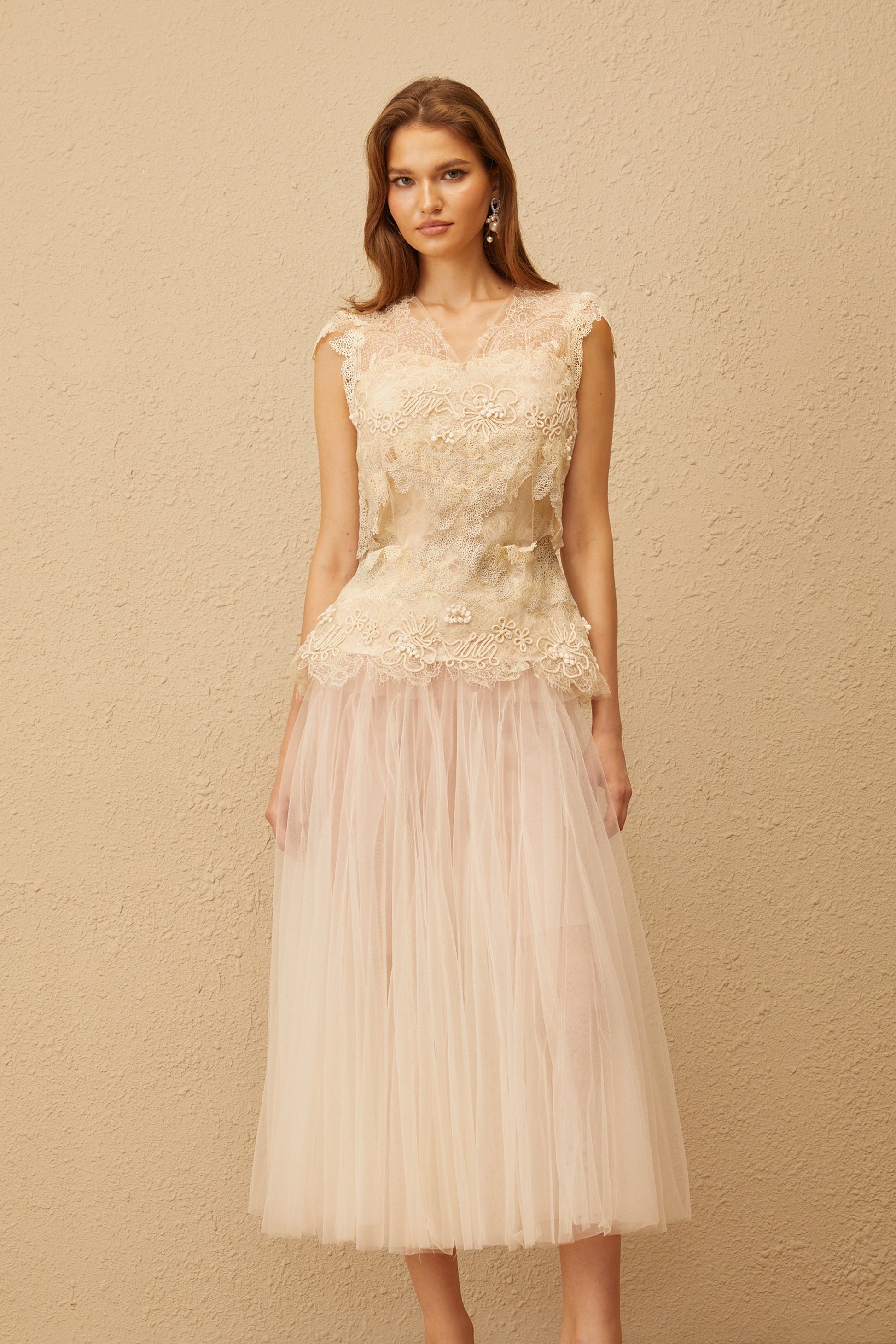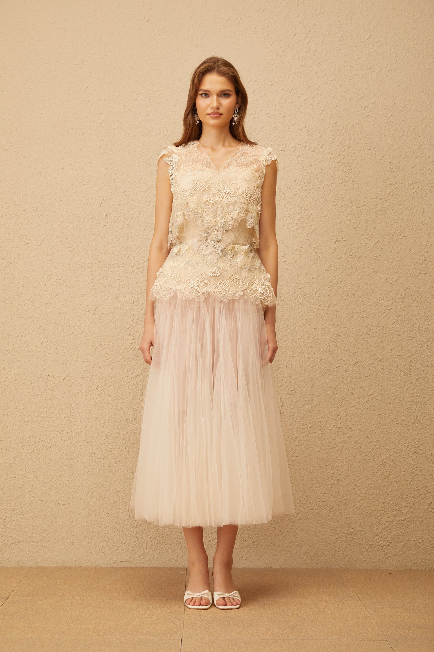Marin Neutral Crochet Floral Tulle Top & Skirt Set