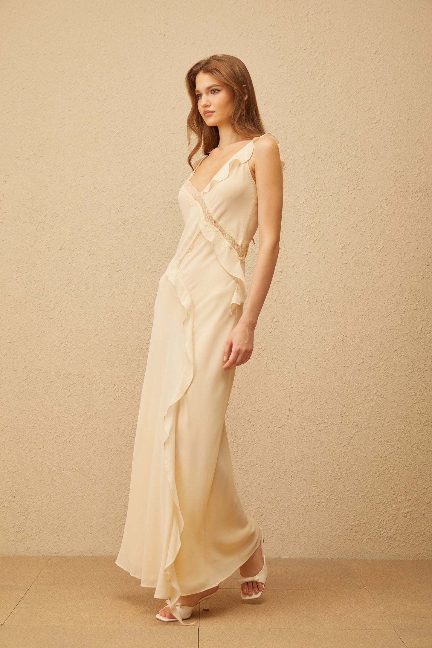 Mathilde Neutral Aysmmetrical Ruffled Trim Maxi Dress