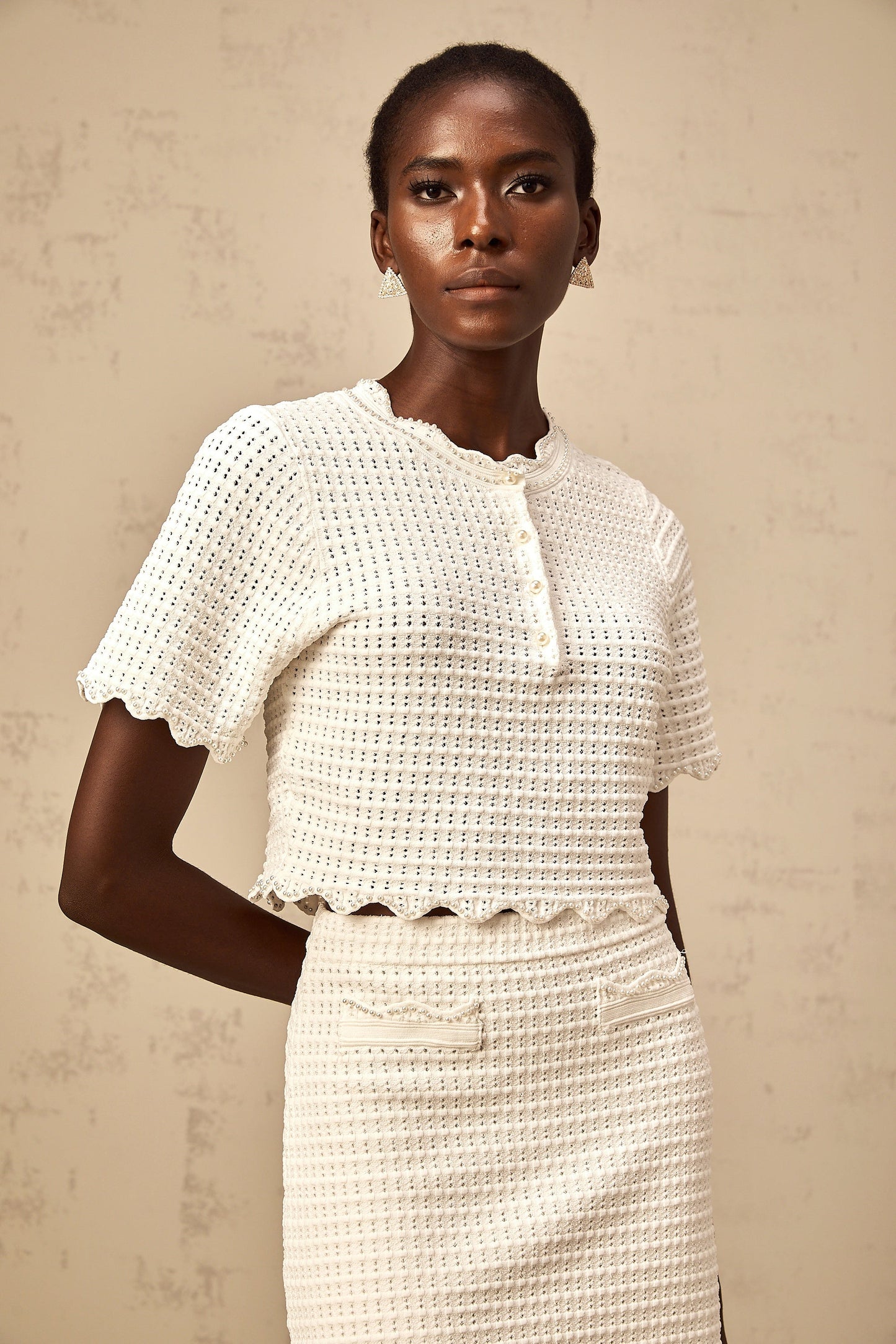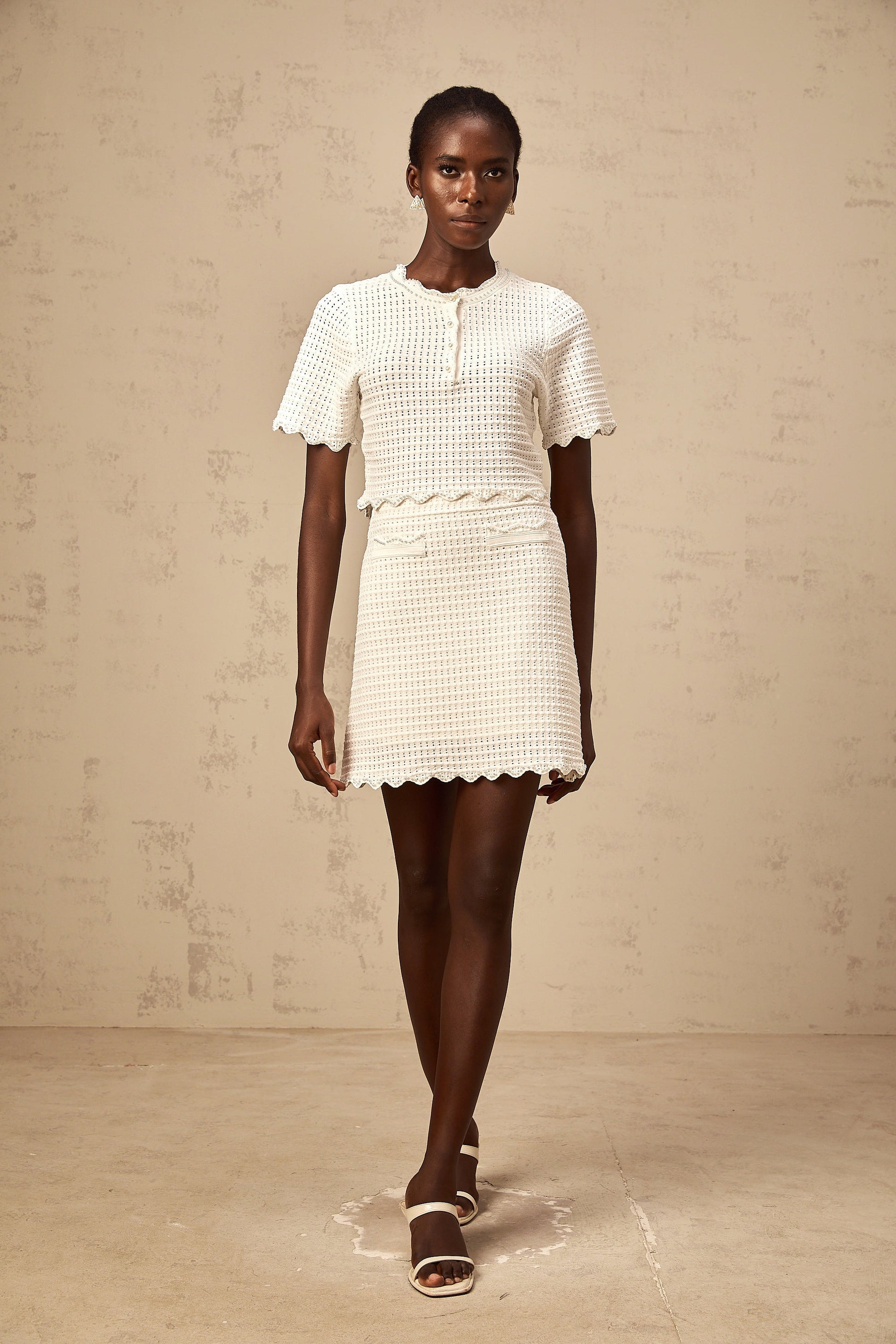 Maxanne cream-white ruffled pointelle-knit top & skirt matching set