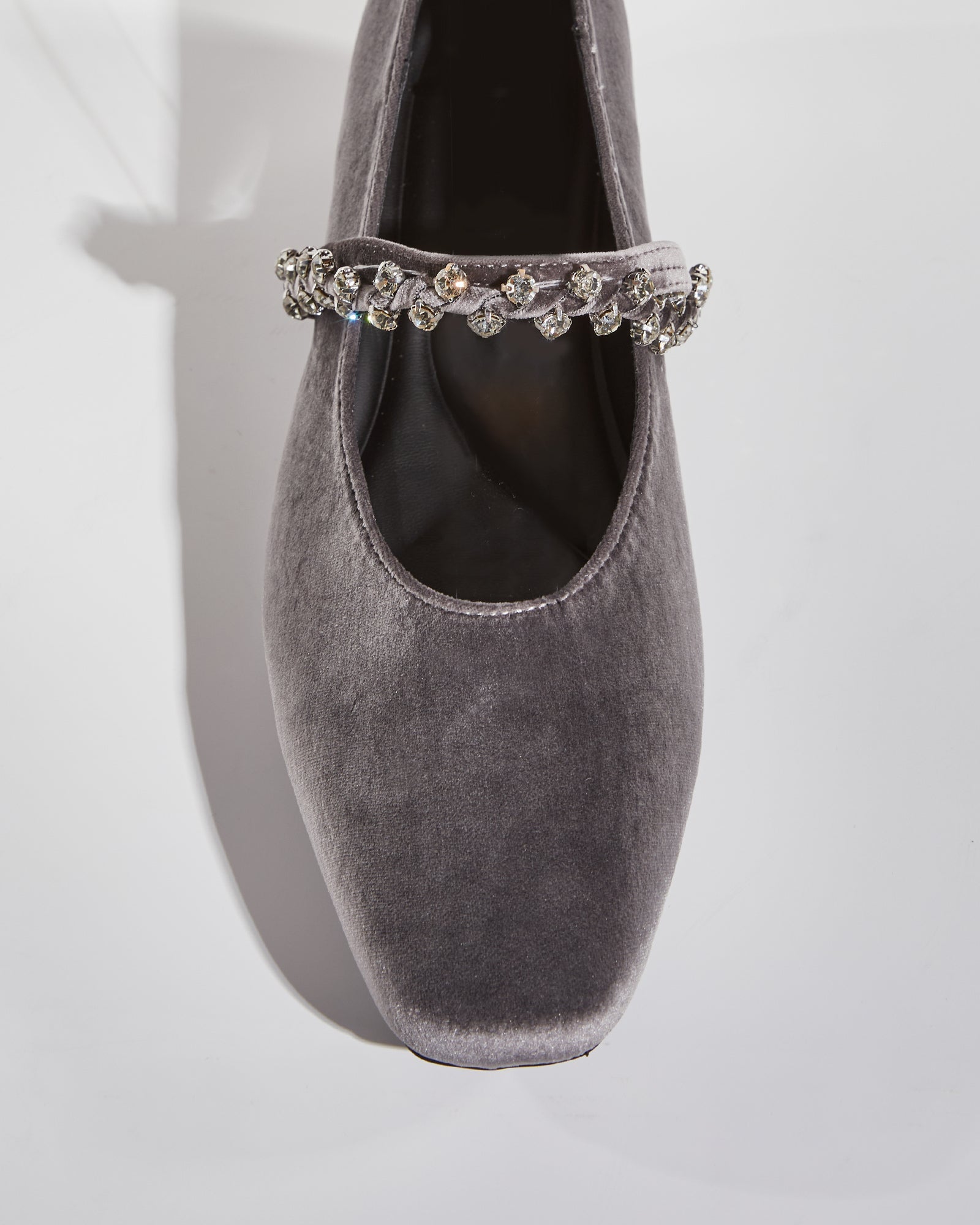 Elevate your style with the Meg Rhinestone Strap Velvet Flats In Grey! These stunning flats feature a sparkly rhinestone strap and soft velvet material, making them perfect for any special occasion. Stay comfortable and chic all day long with these must-have shoes.