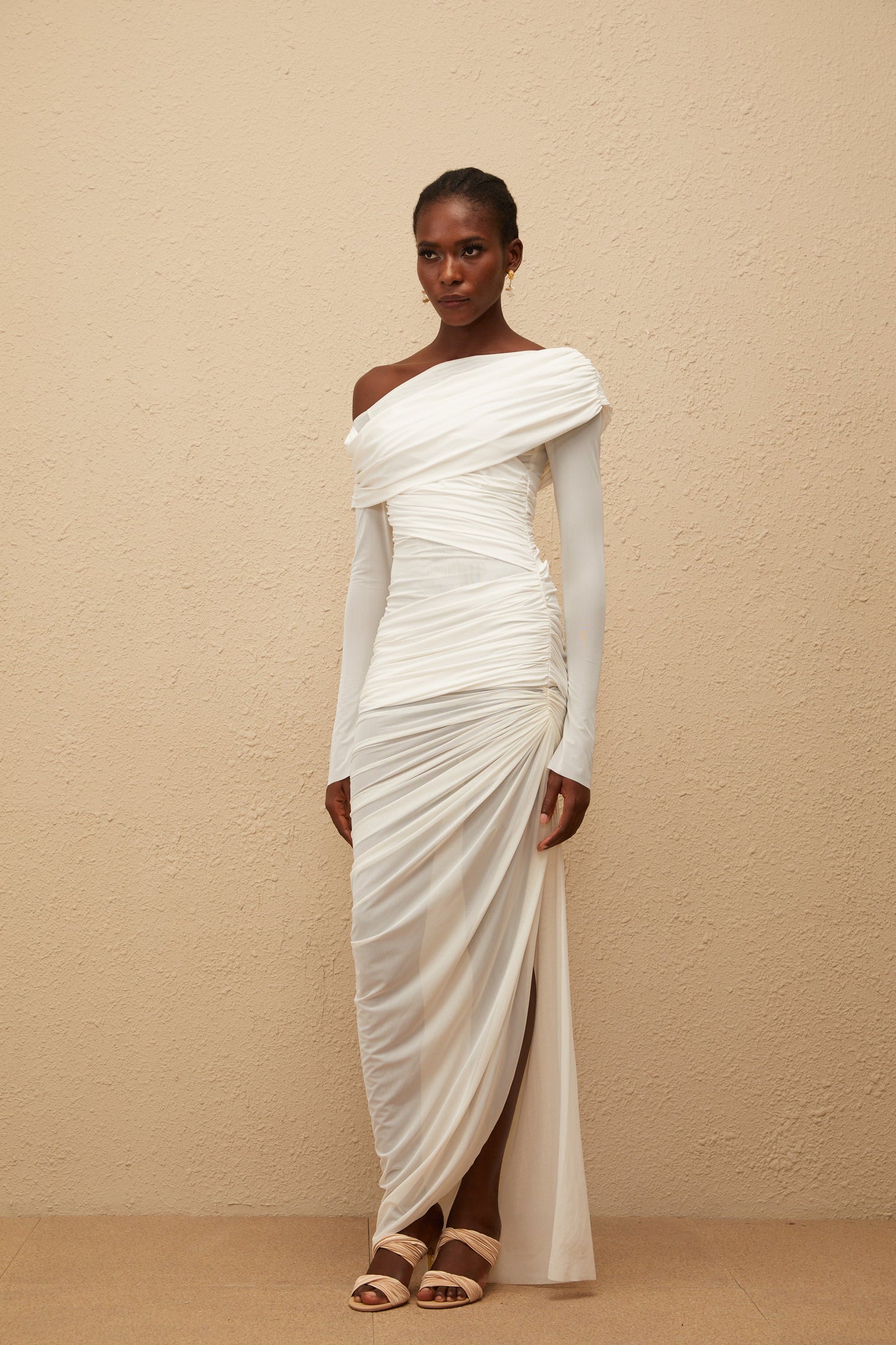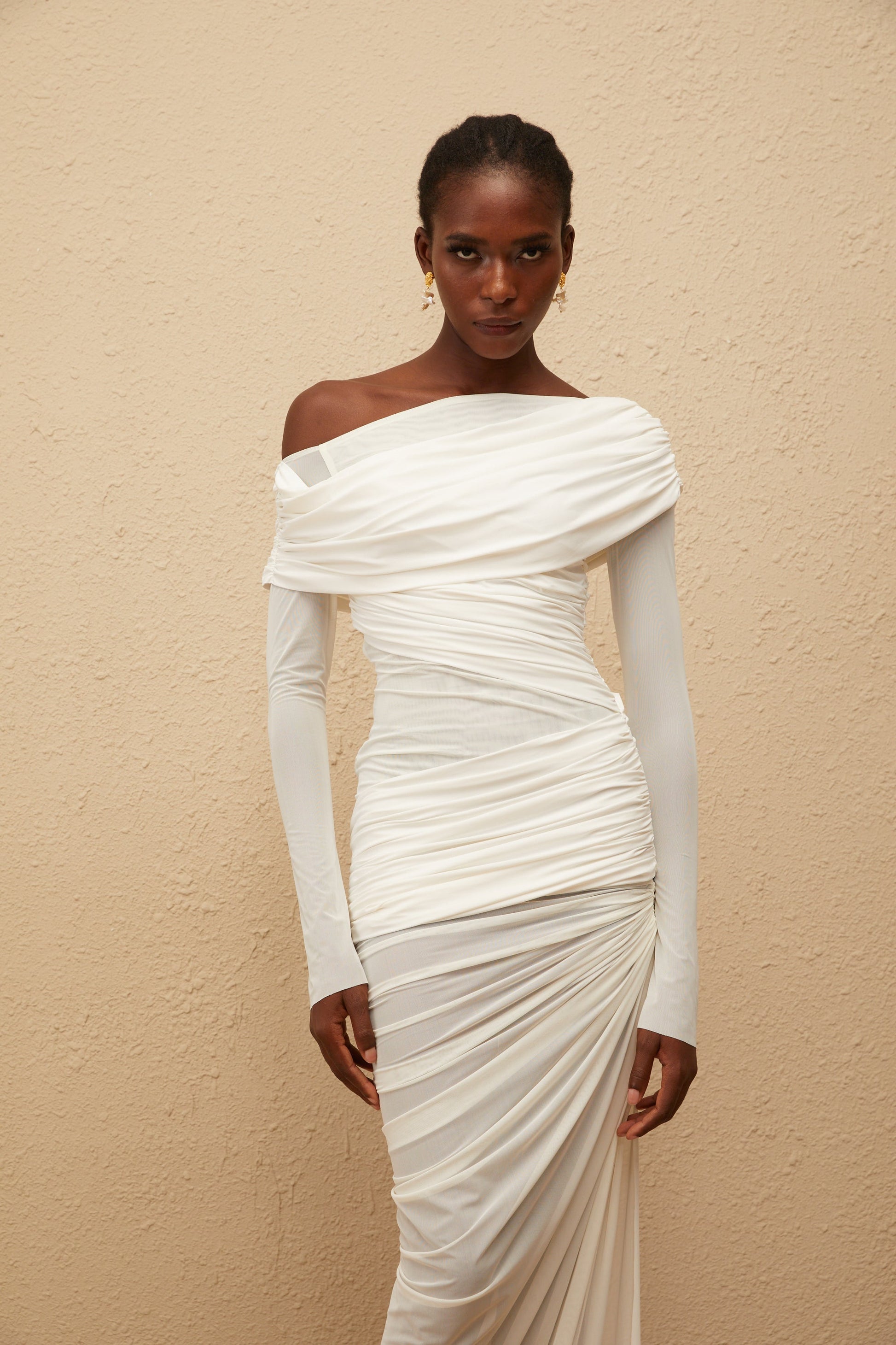 Melanie White Asymmetrical Ruched Mesh Maxi Dress
