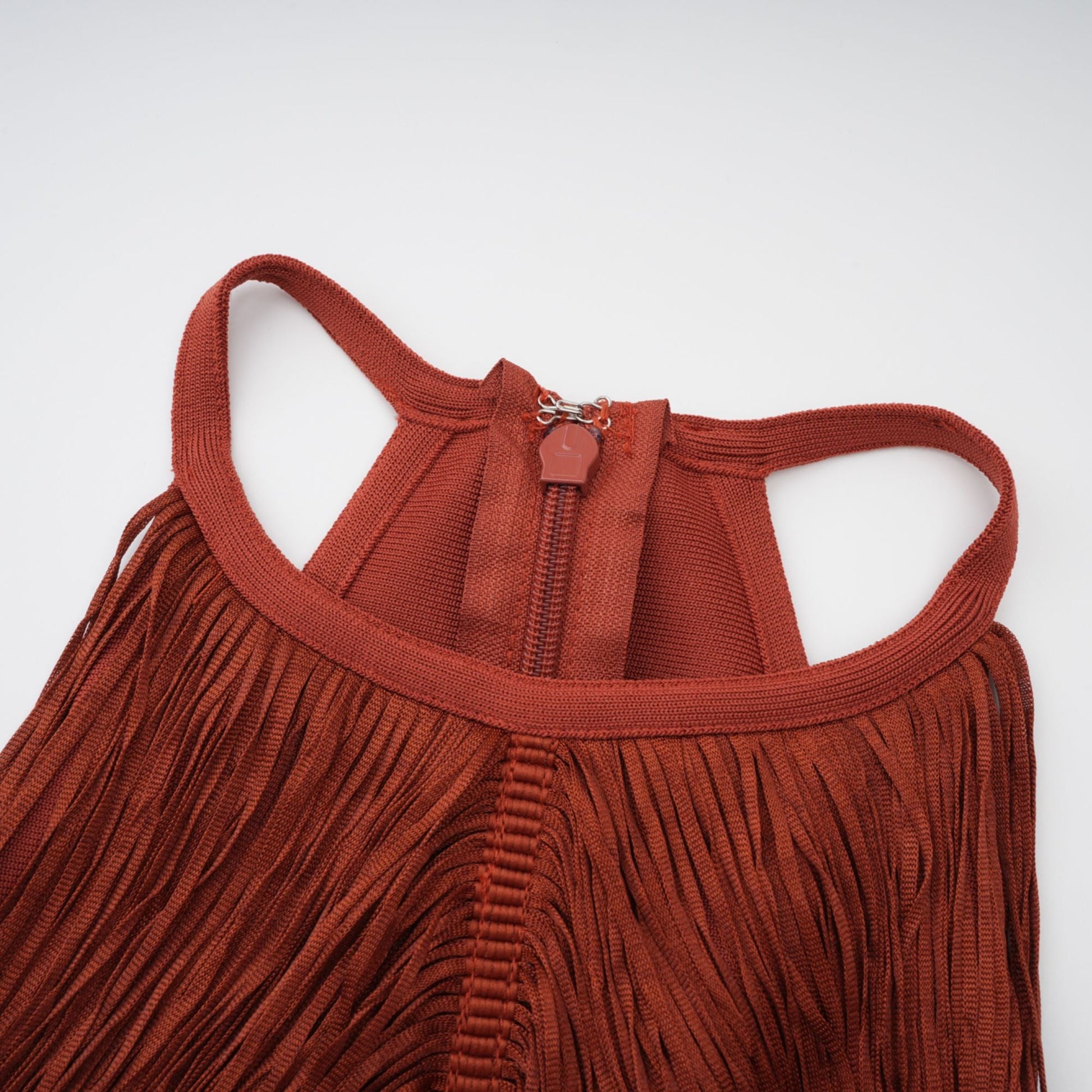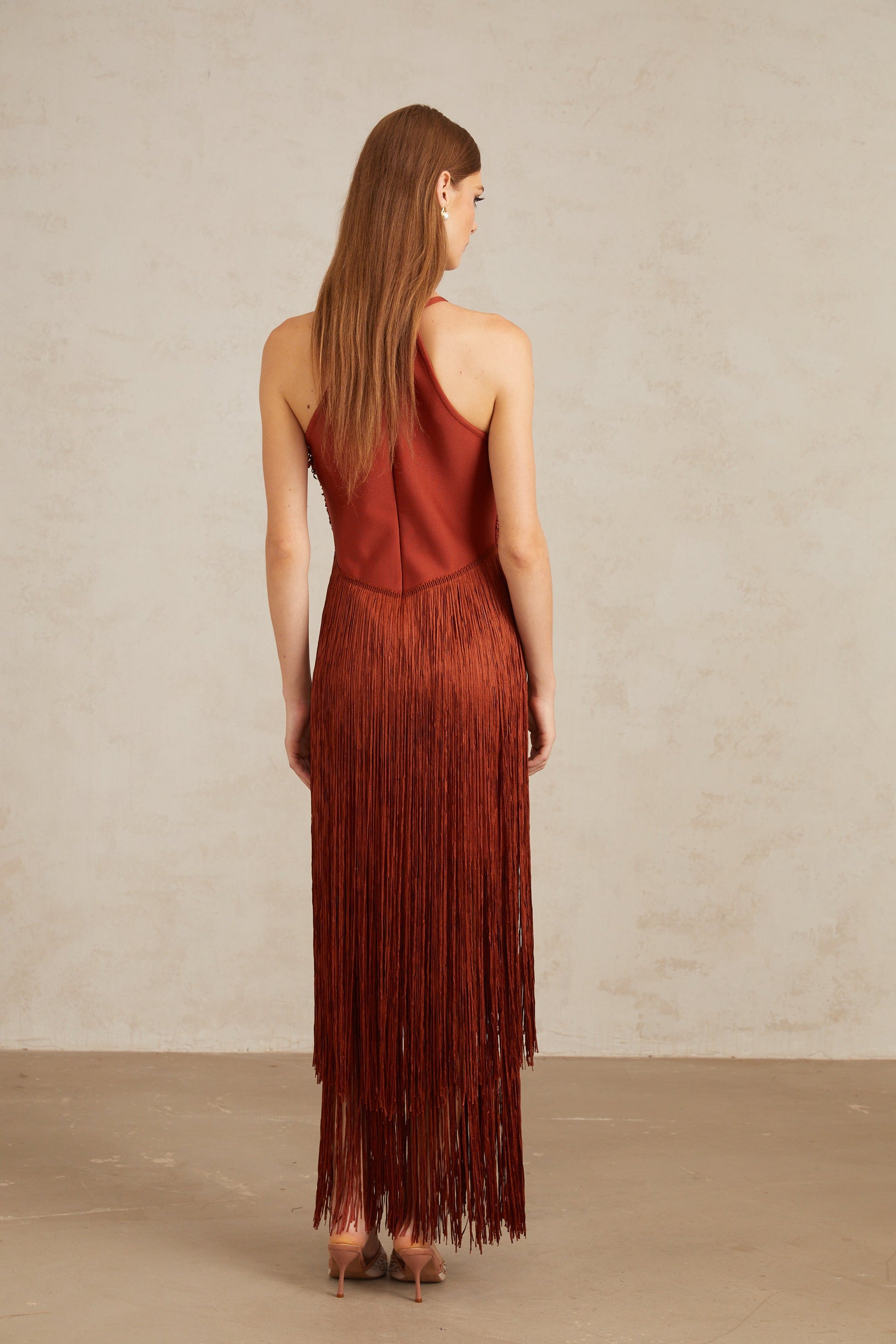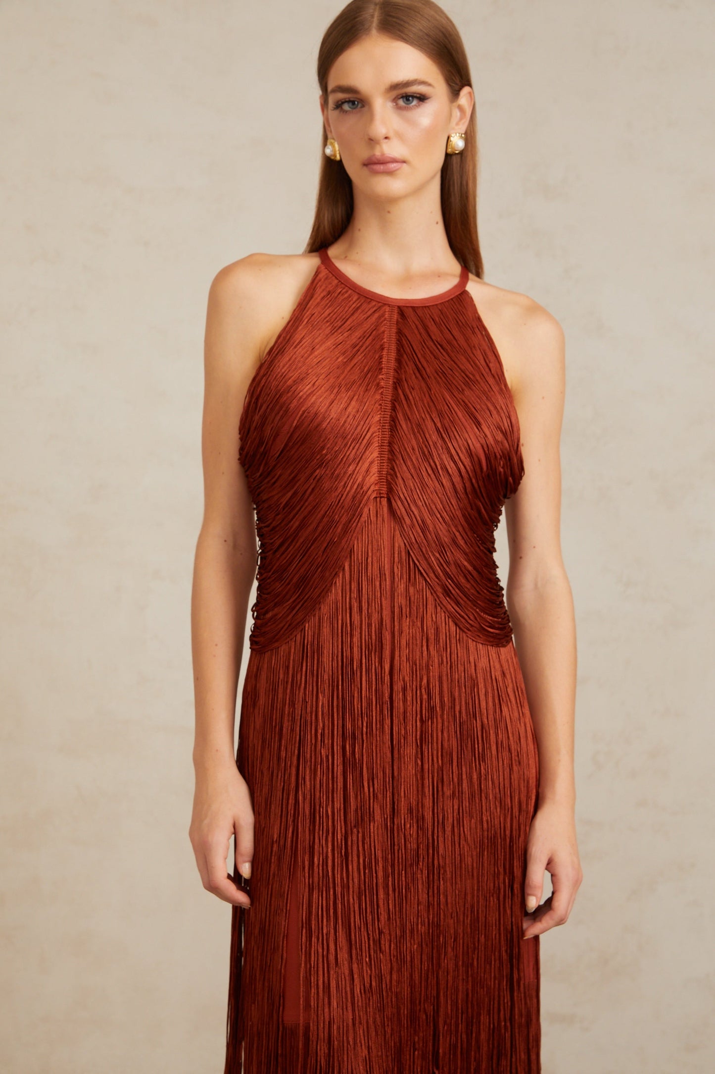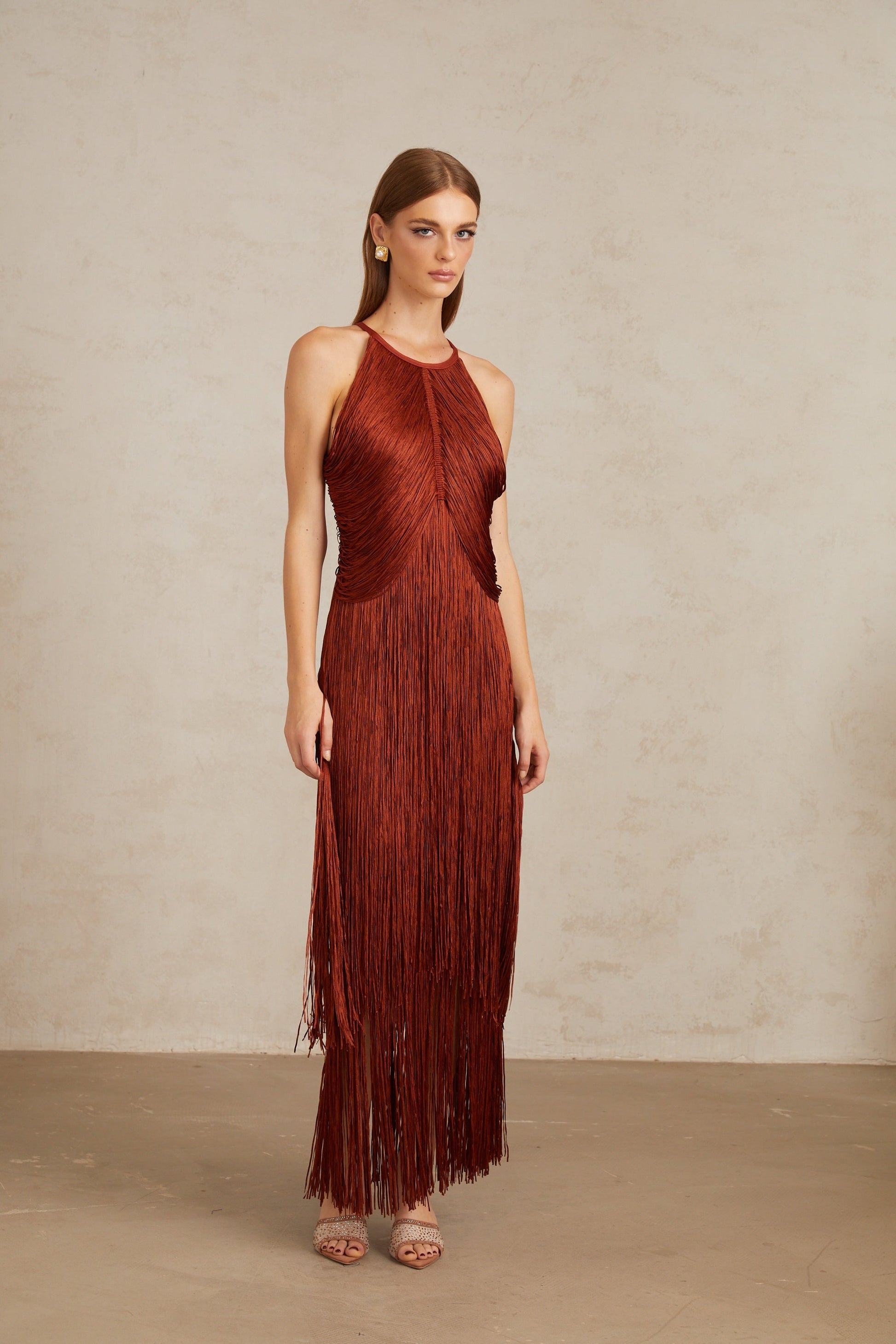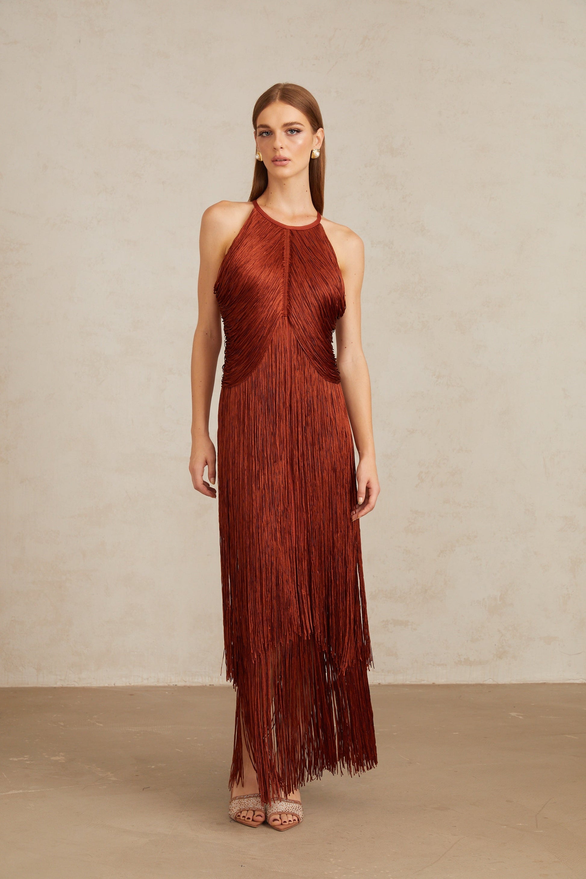 Mélisande Rusty Red Halterneck Fringed Maxi Gown