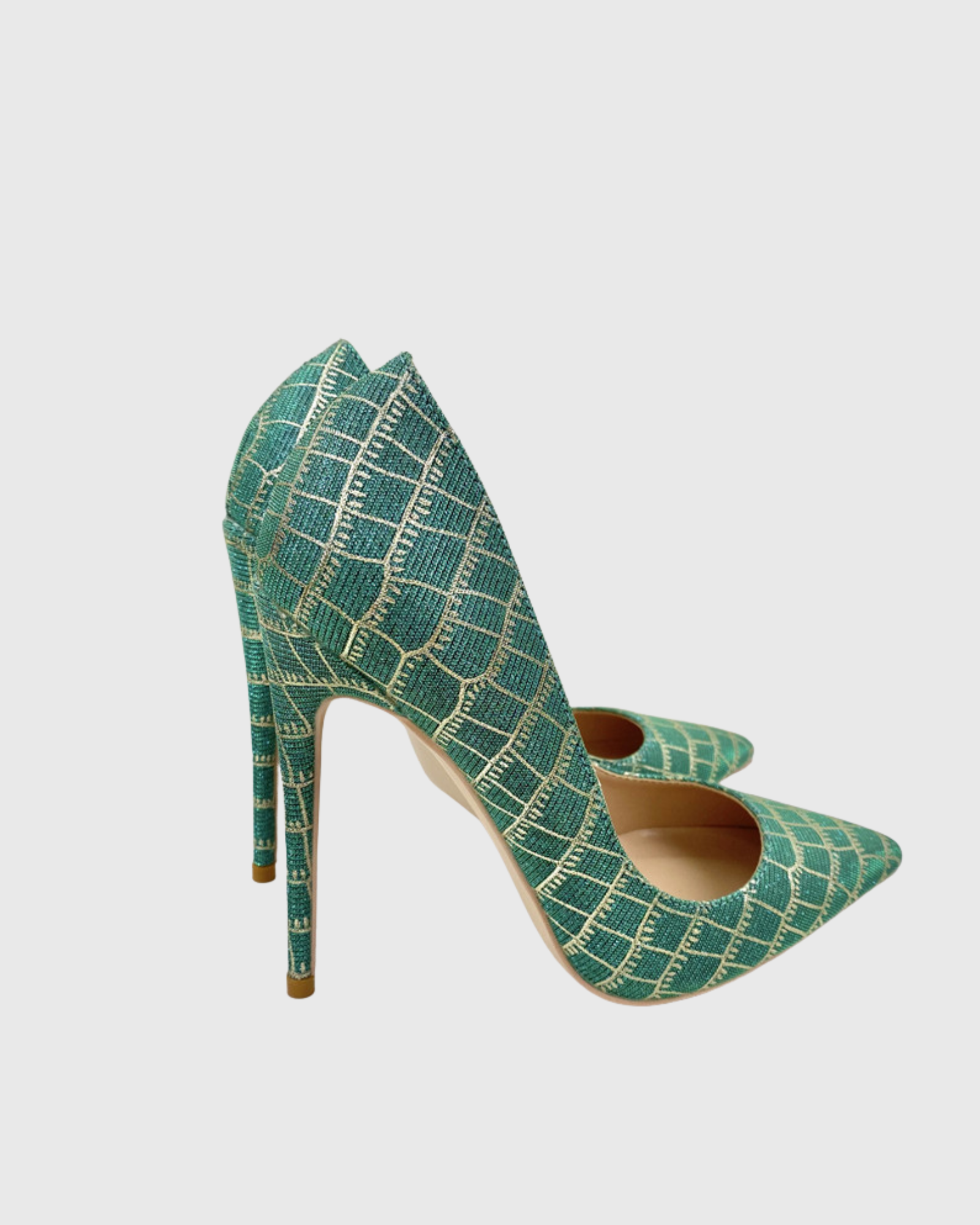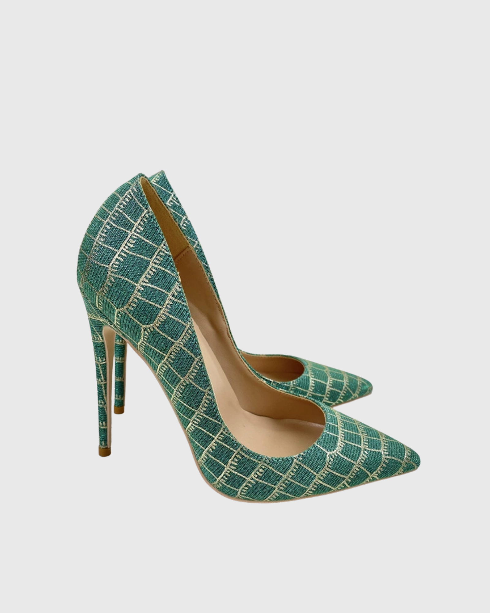 Elevate your style with our Min Lattice Embroidery Pumps in Green. These elegant pumps feature beautiful lattice embroidery, adding a touch of sophistication to any outfit. Perfect for any occasion, these shoes will keep you comfortable and stylish all day long. Get them now and step out in confidence!