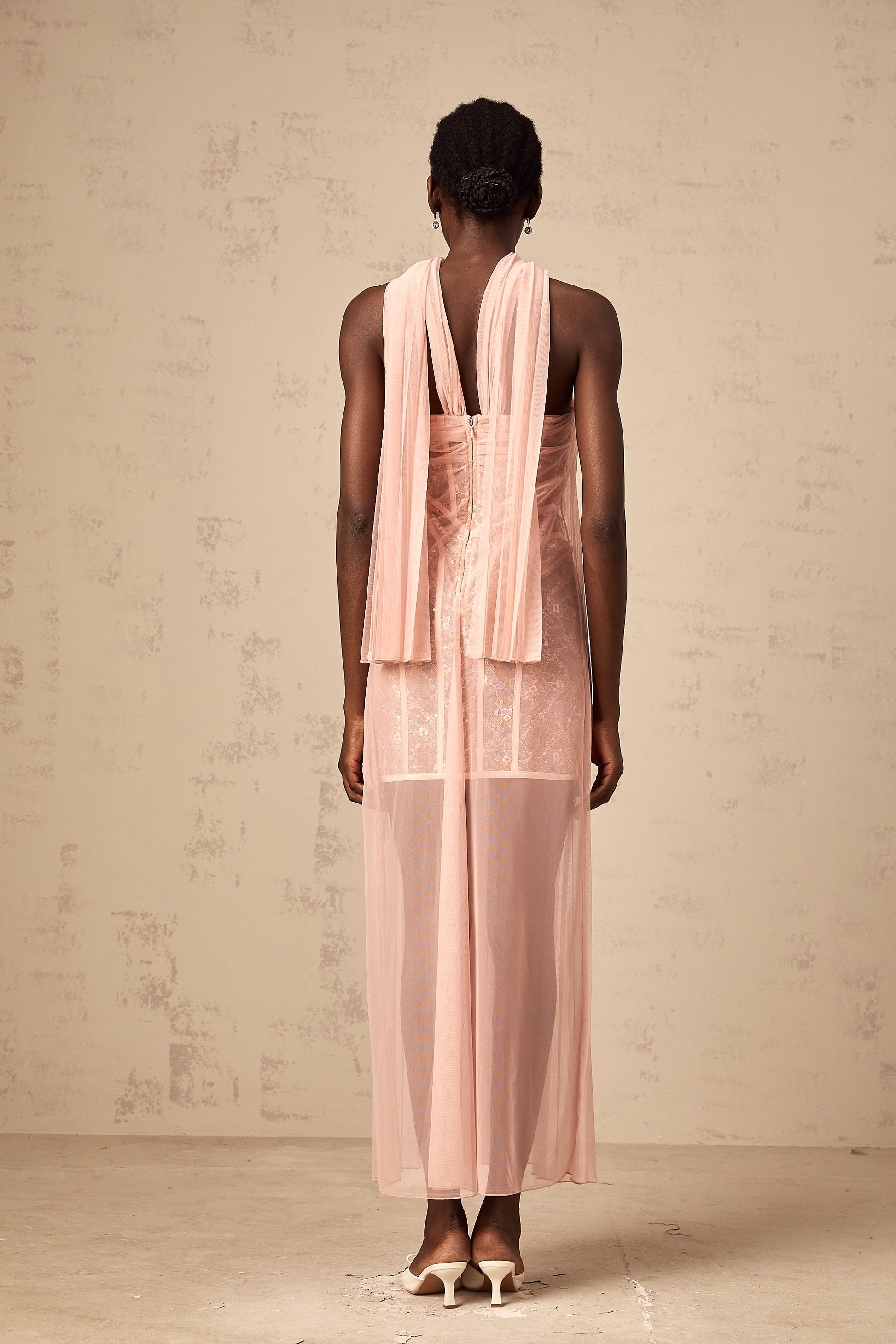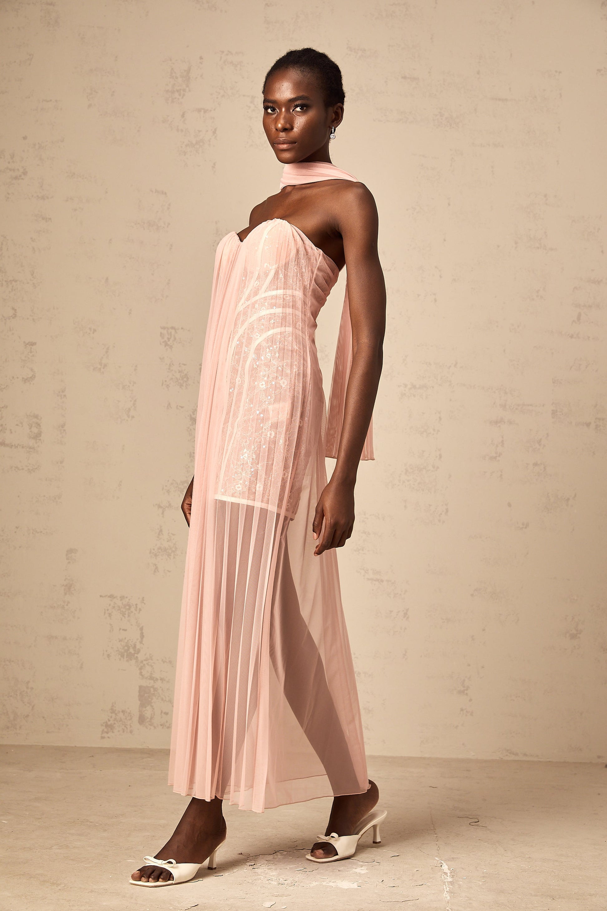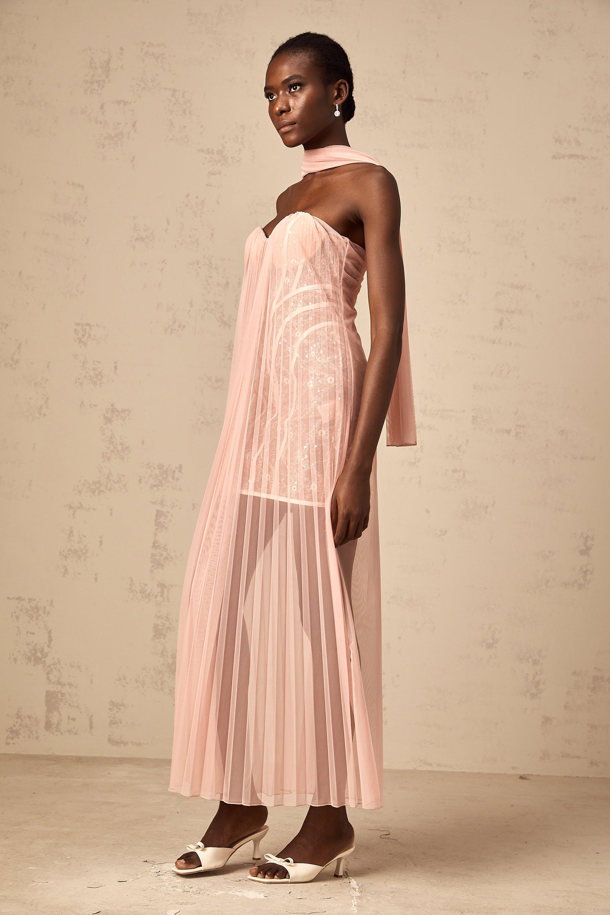 Monique ribbon-design pleated tulle maxi dress in Pink