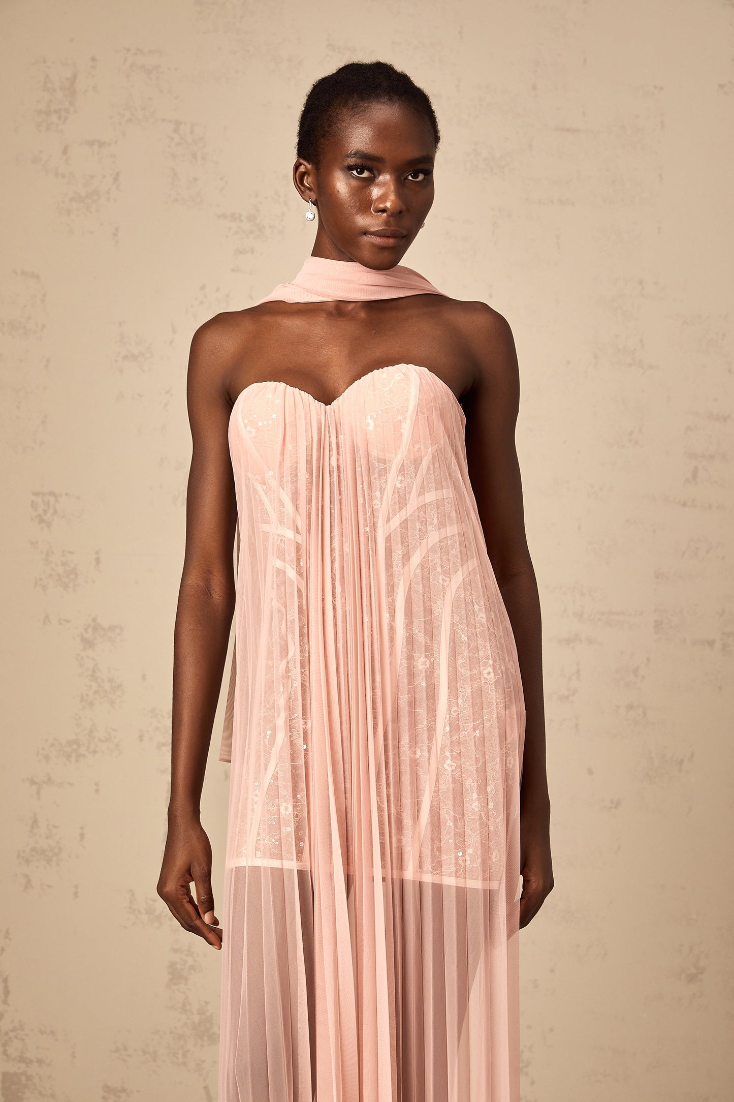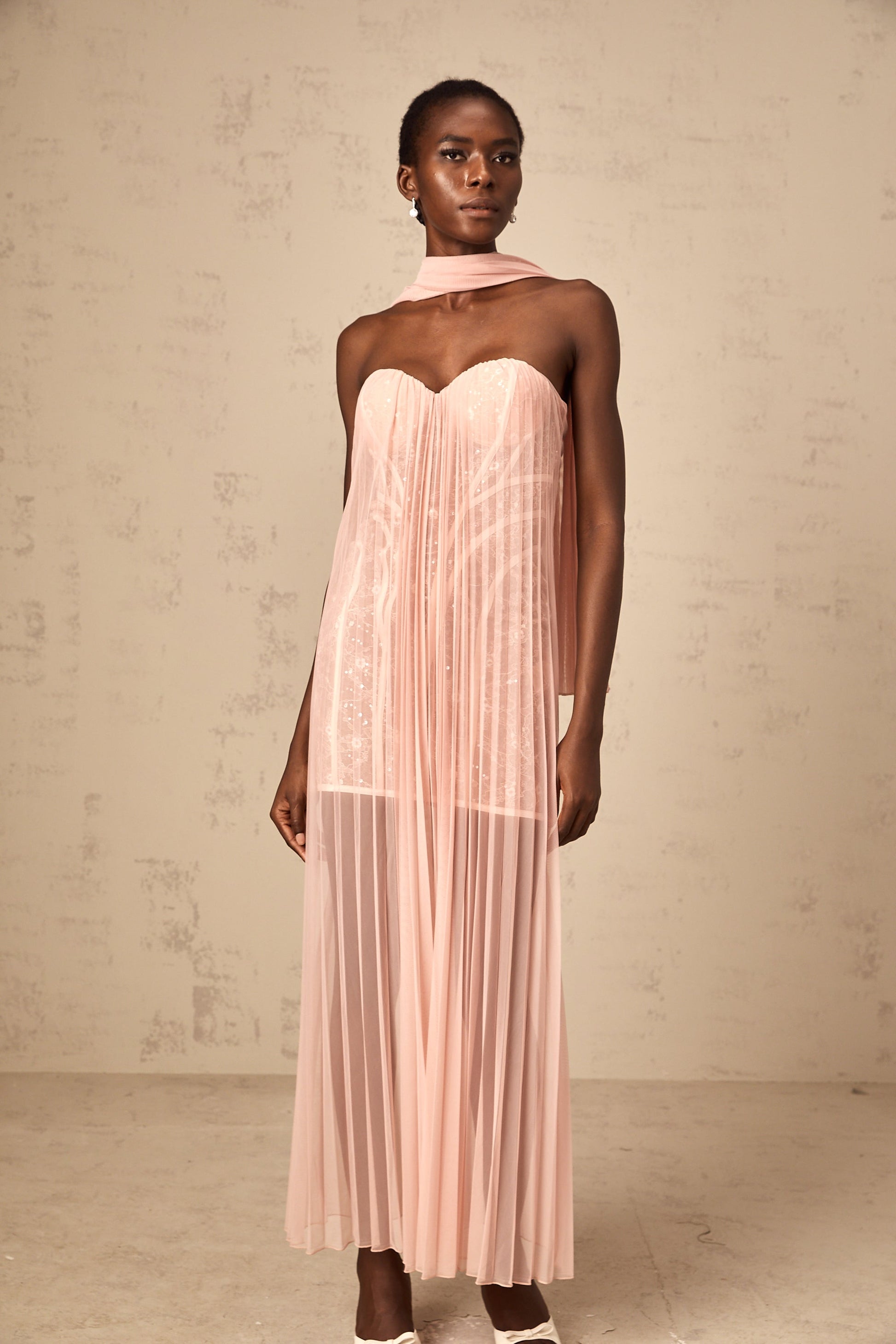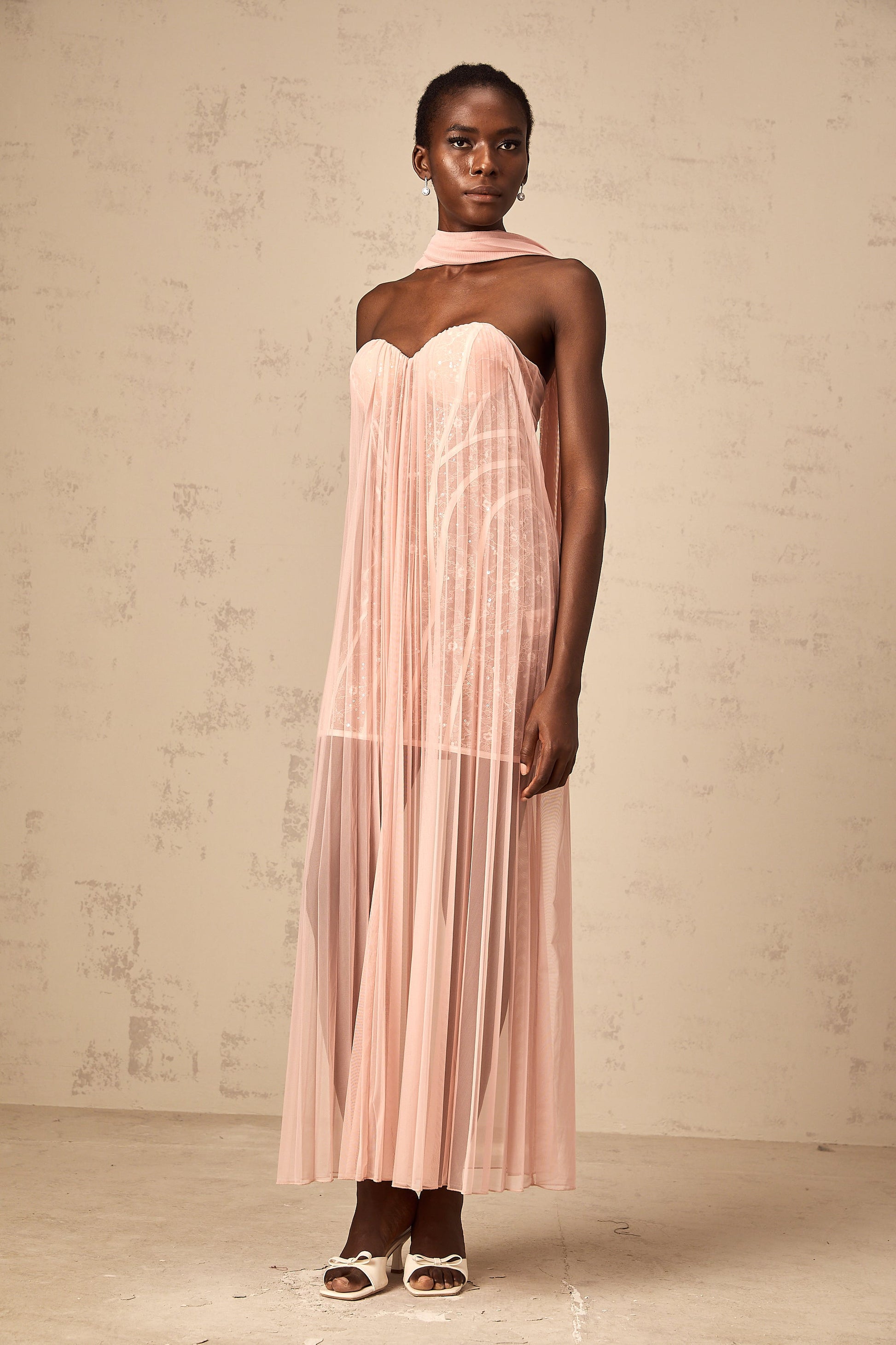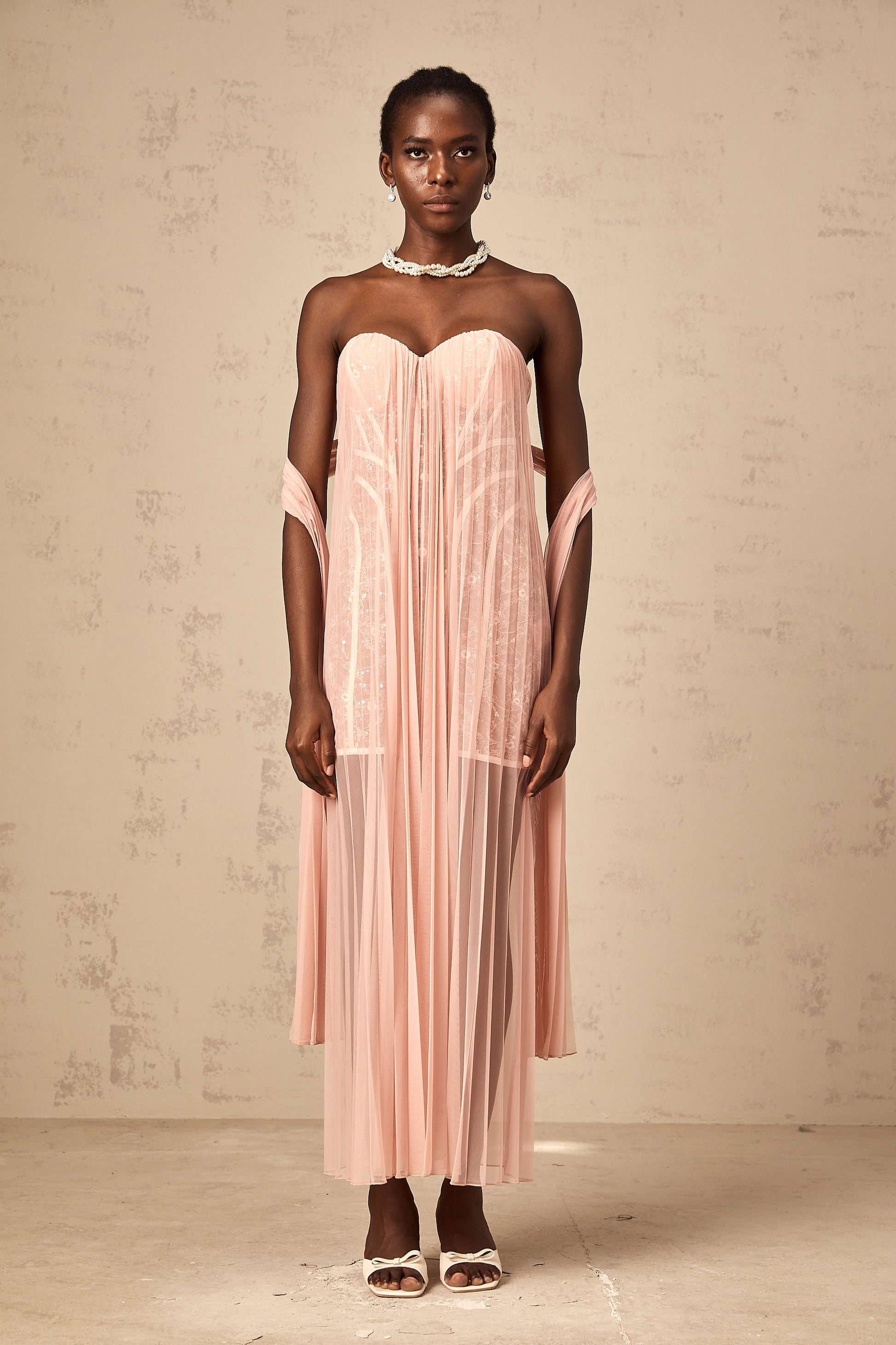 Monique ribbon-design pleated tulle maxi dress in Pink