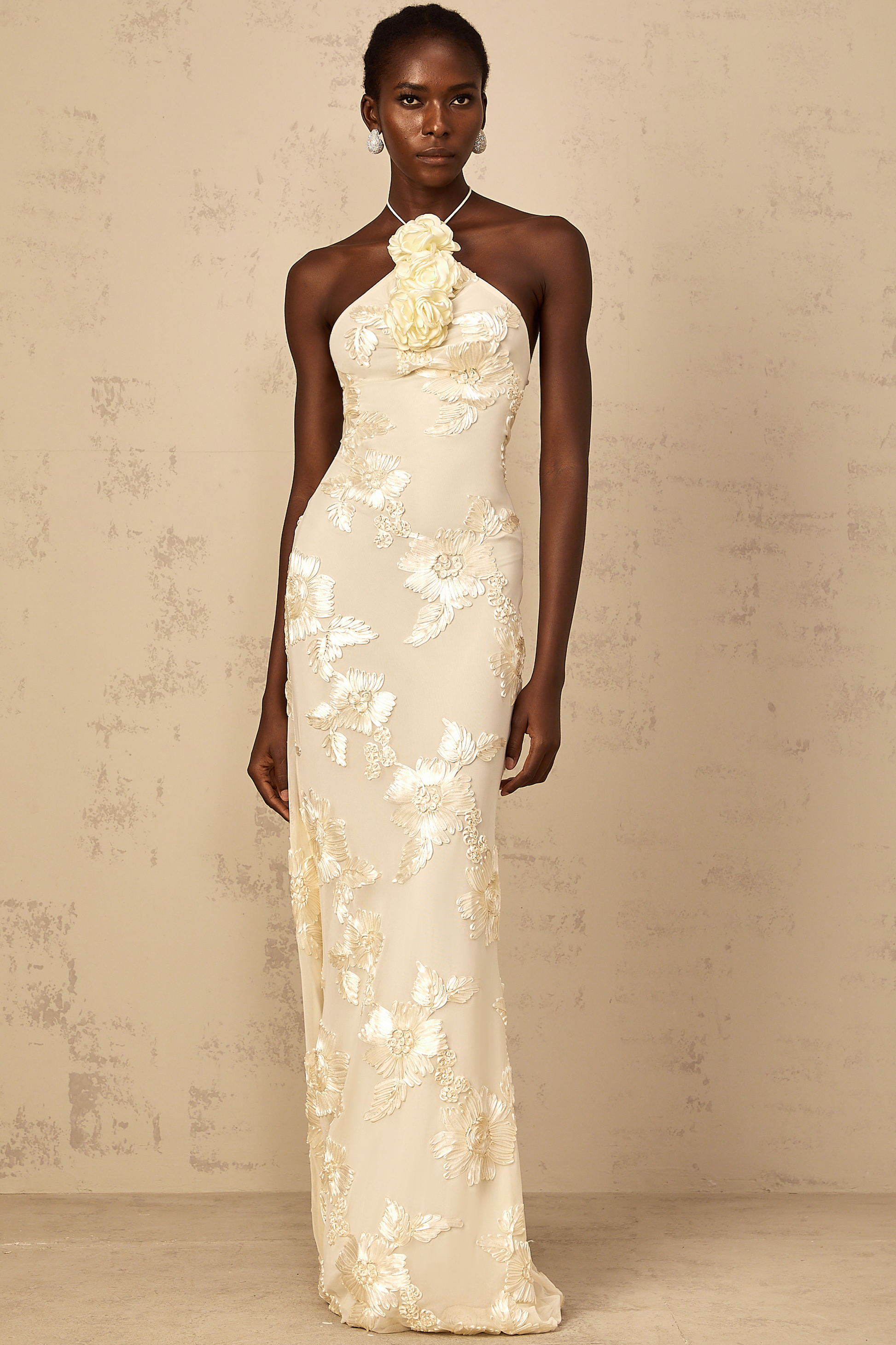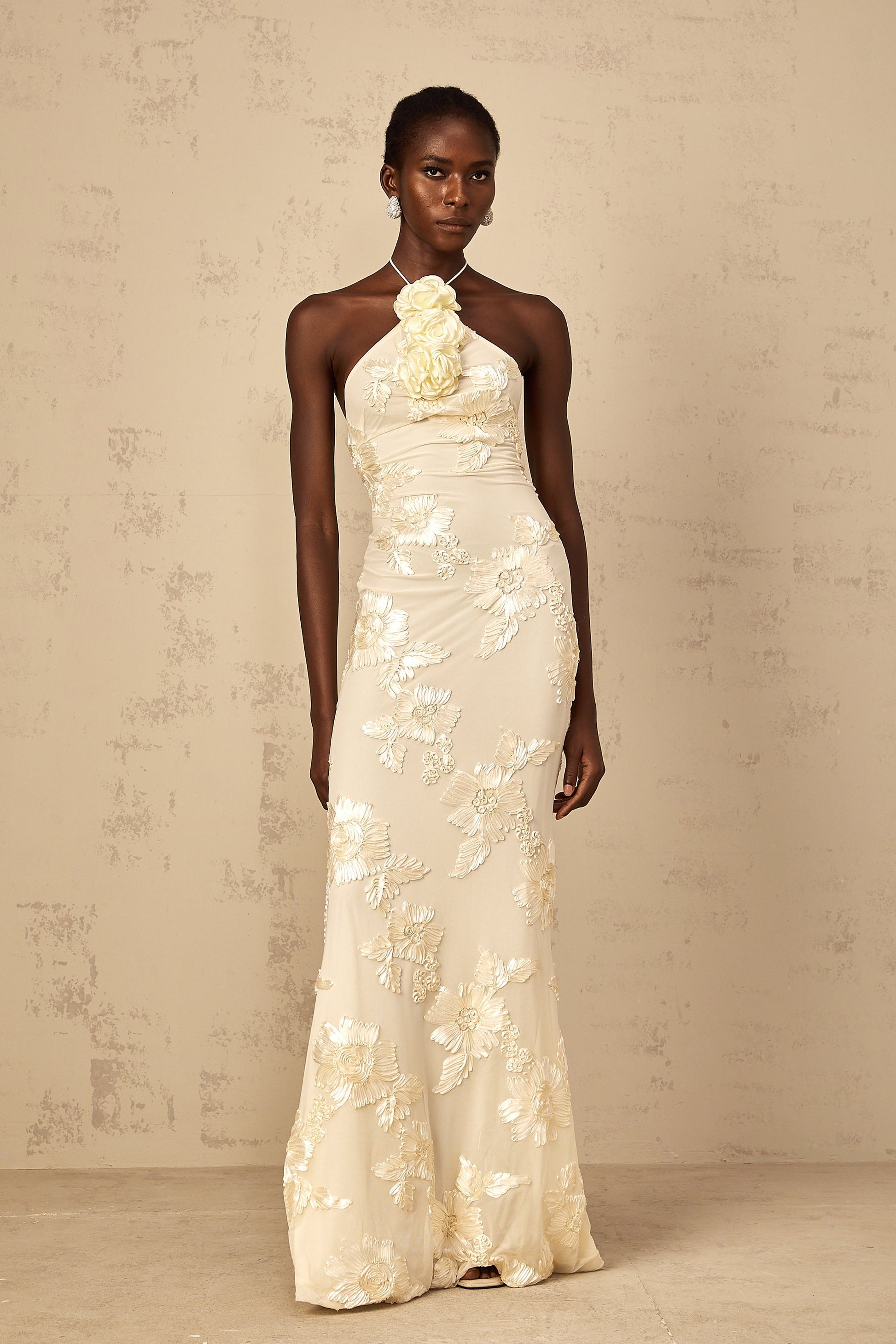 Melanie Neutrals Embroidered Halterneck Maxi Dress