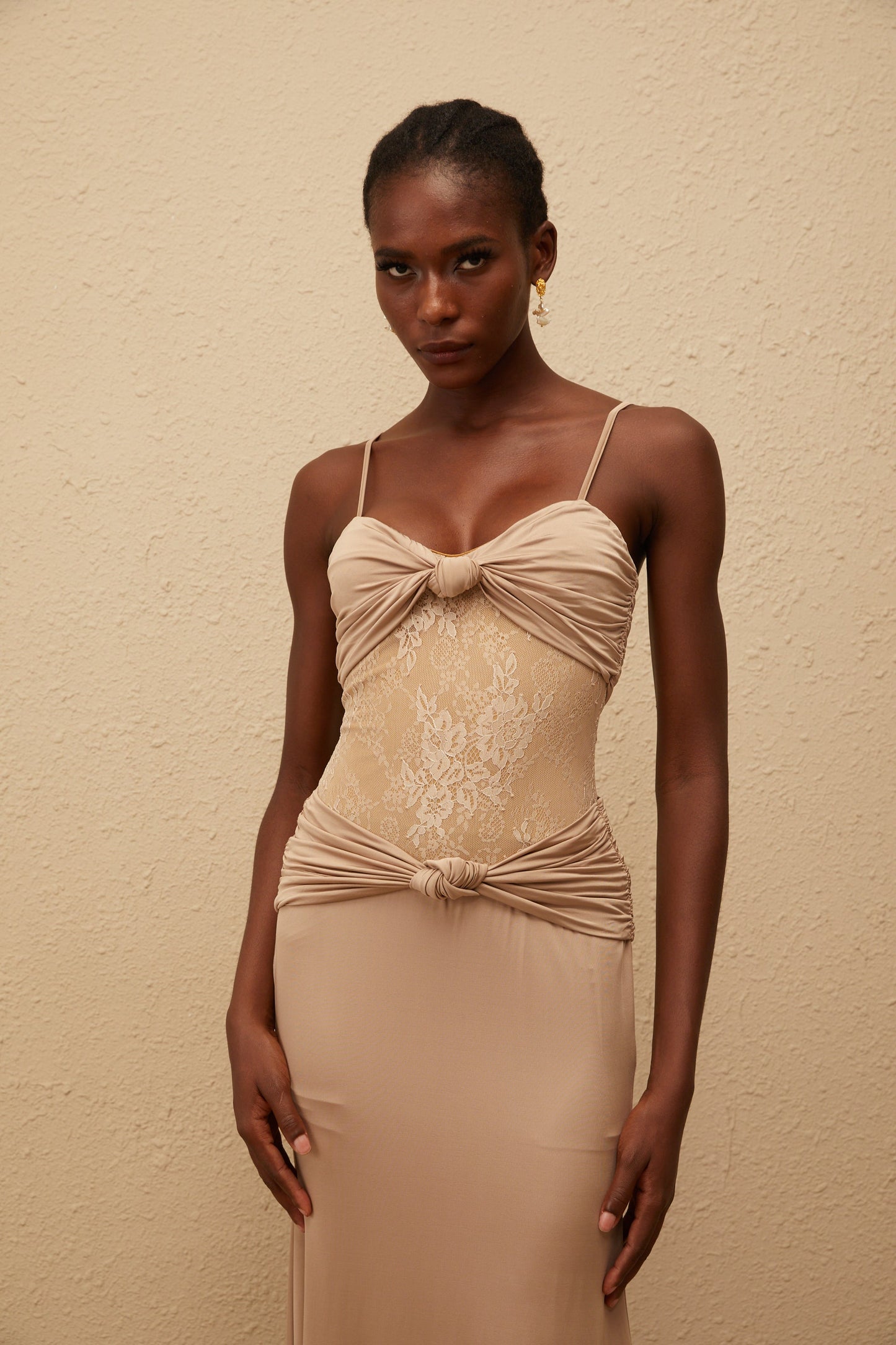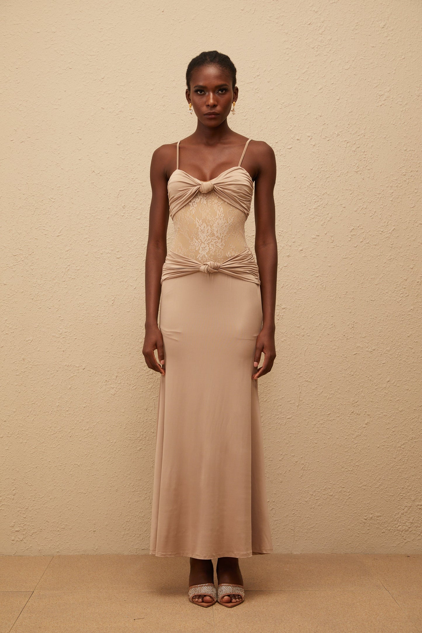 Nevaeh Khaki Twisted Lace Panel Maxi Dress