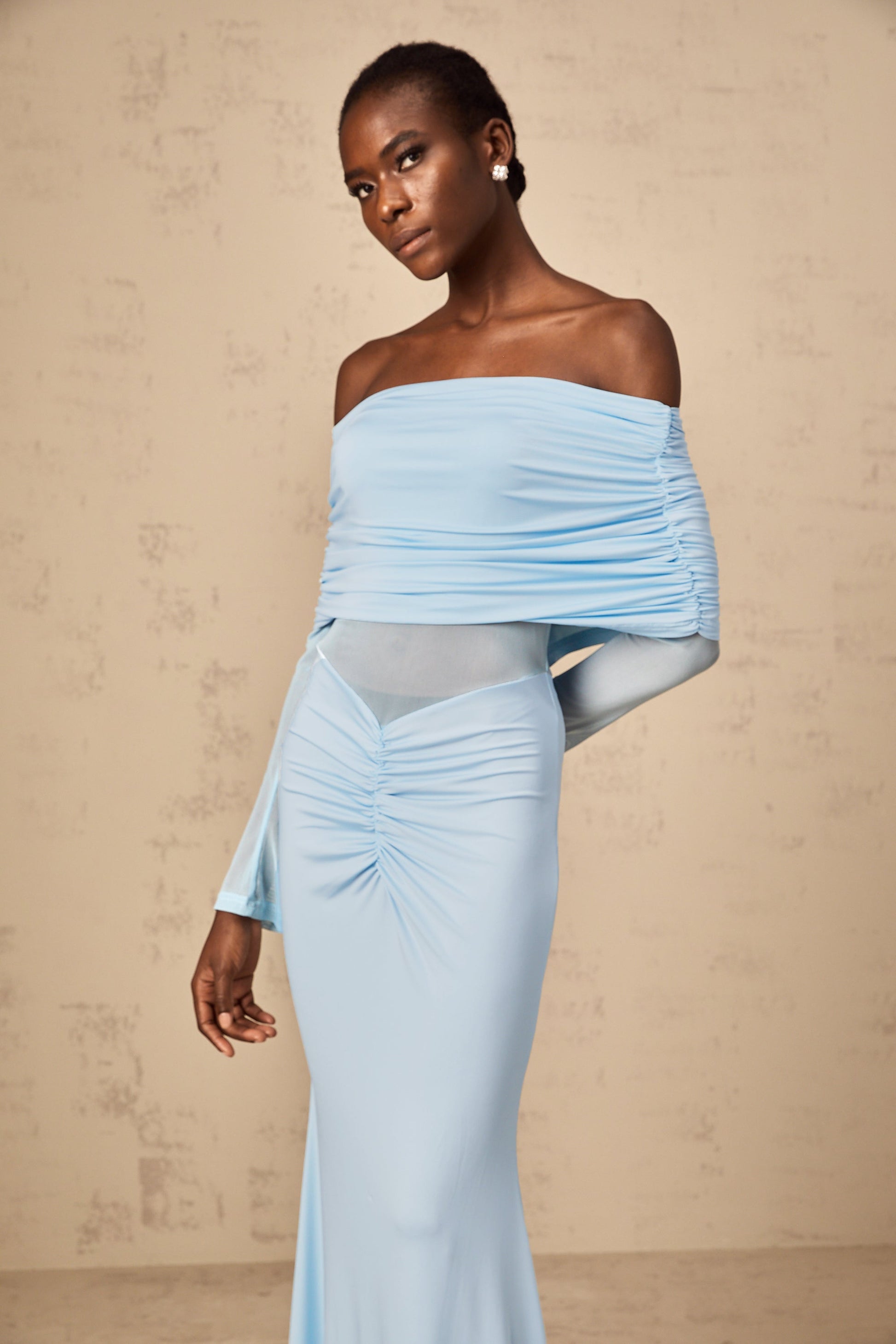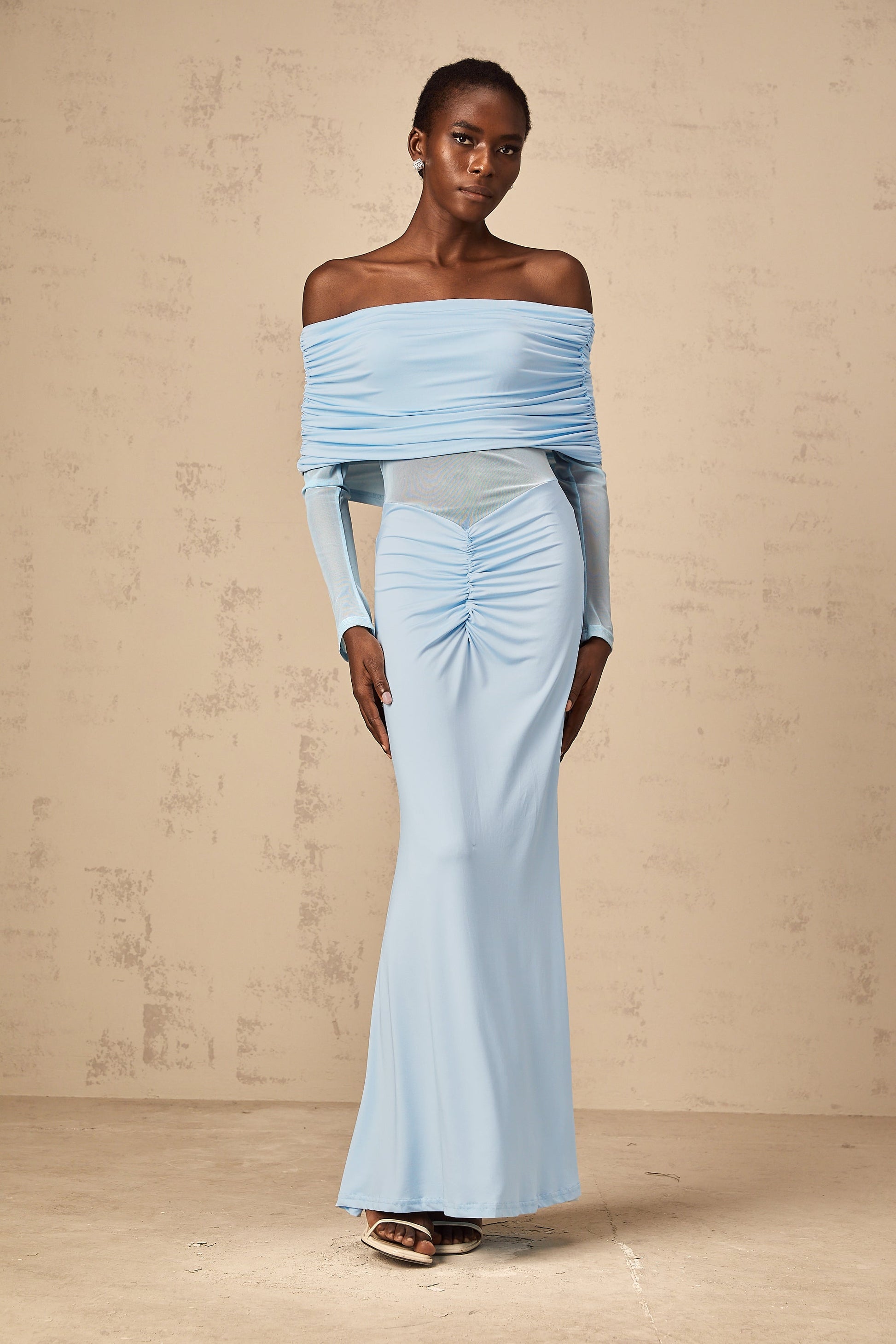 Ninon blue off-shoulder ruched maxi dress