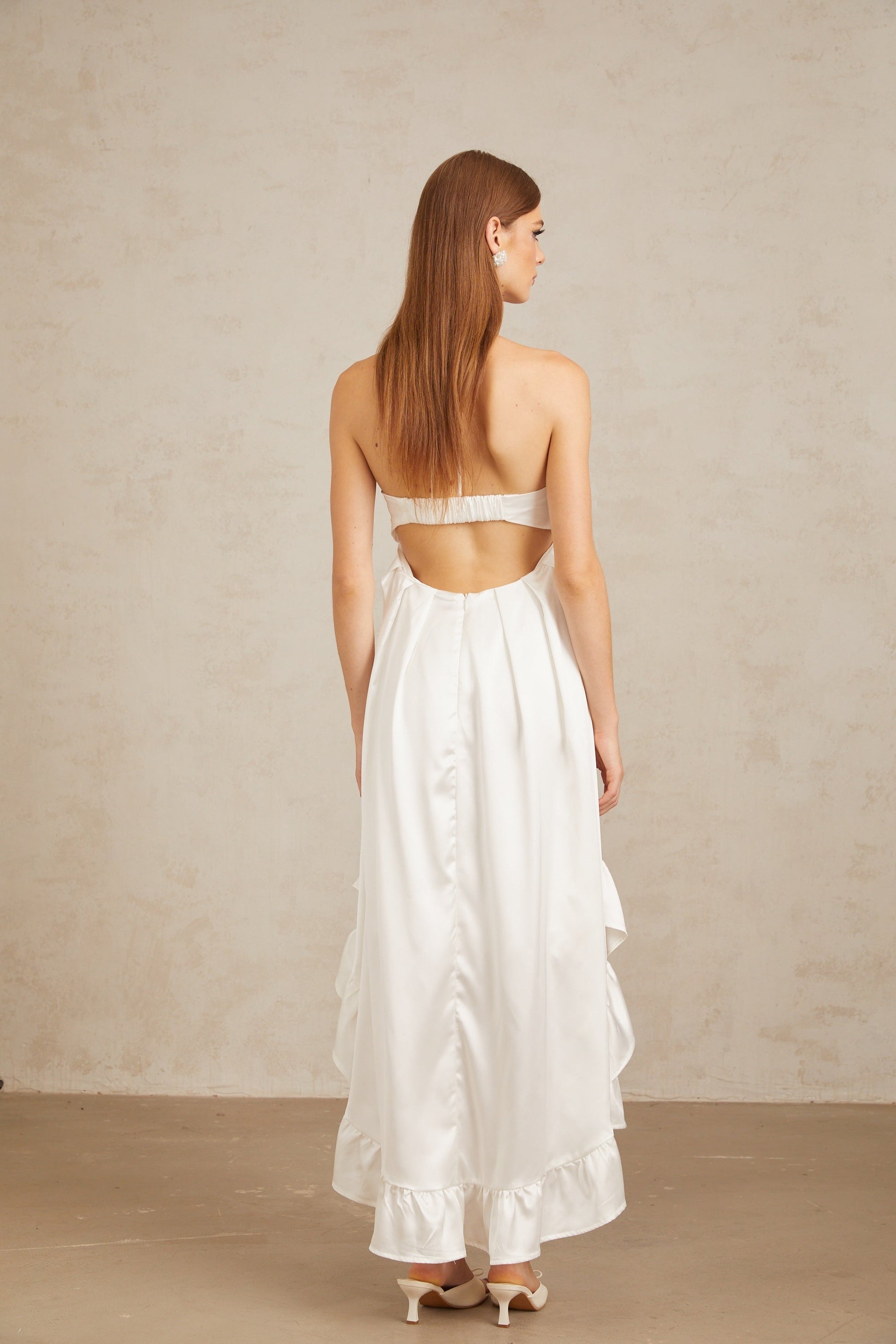 Nocturne White Ruffled Satin Midi Dress