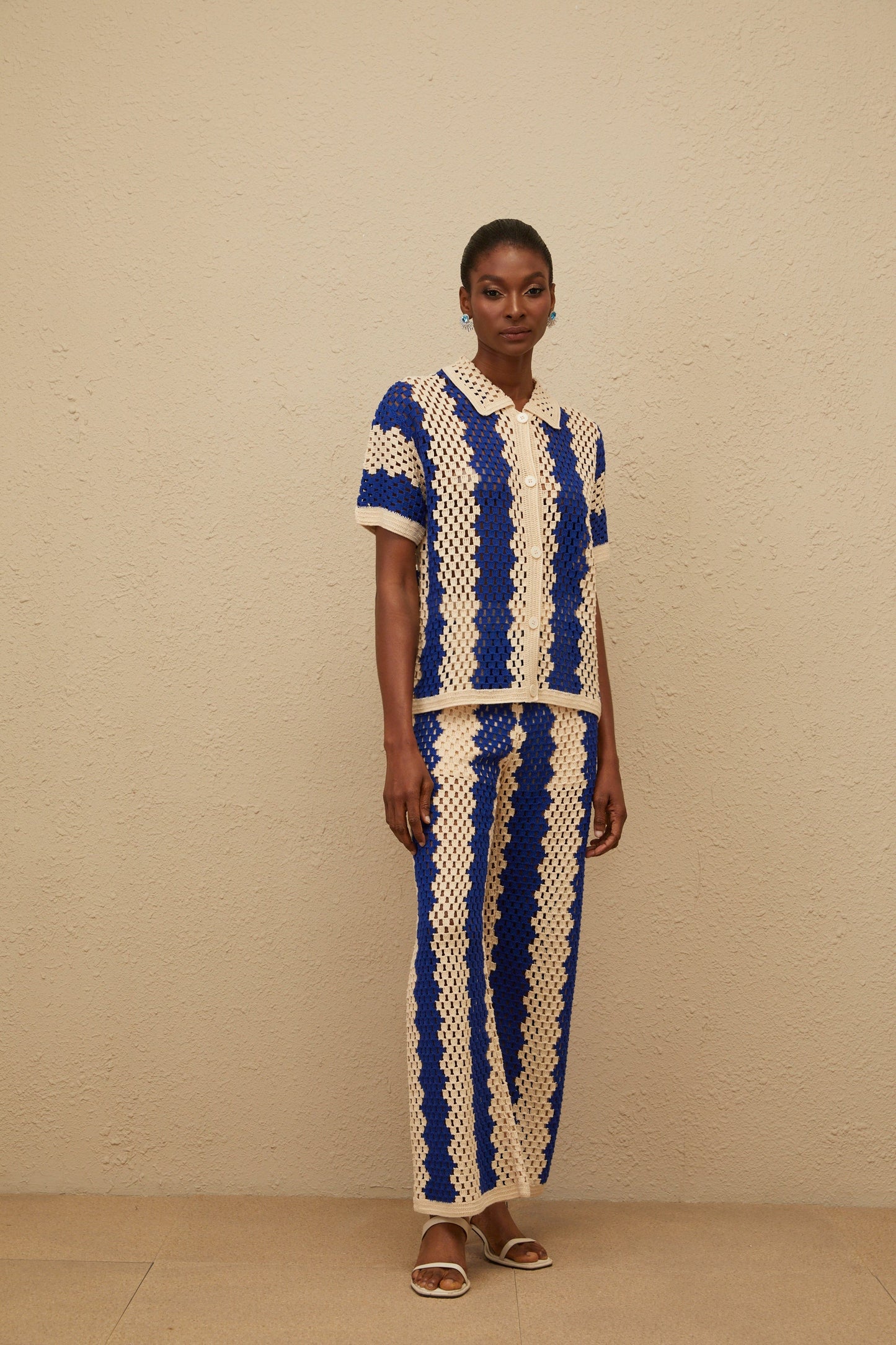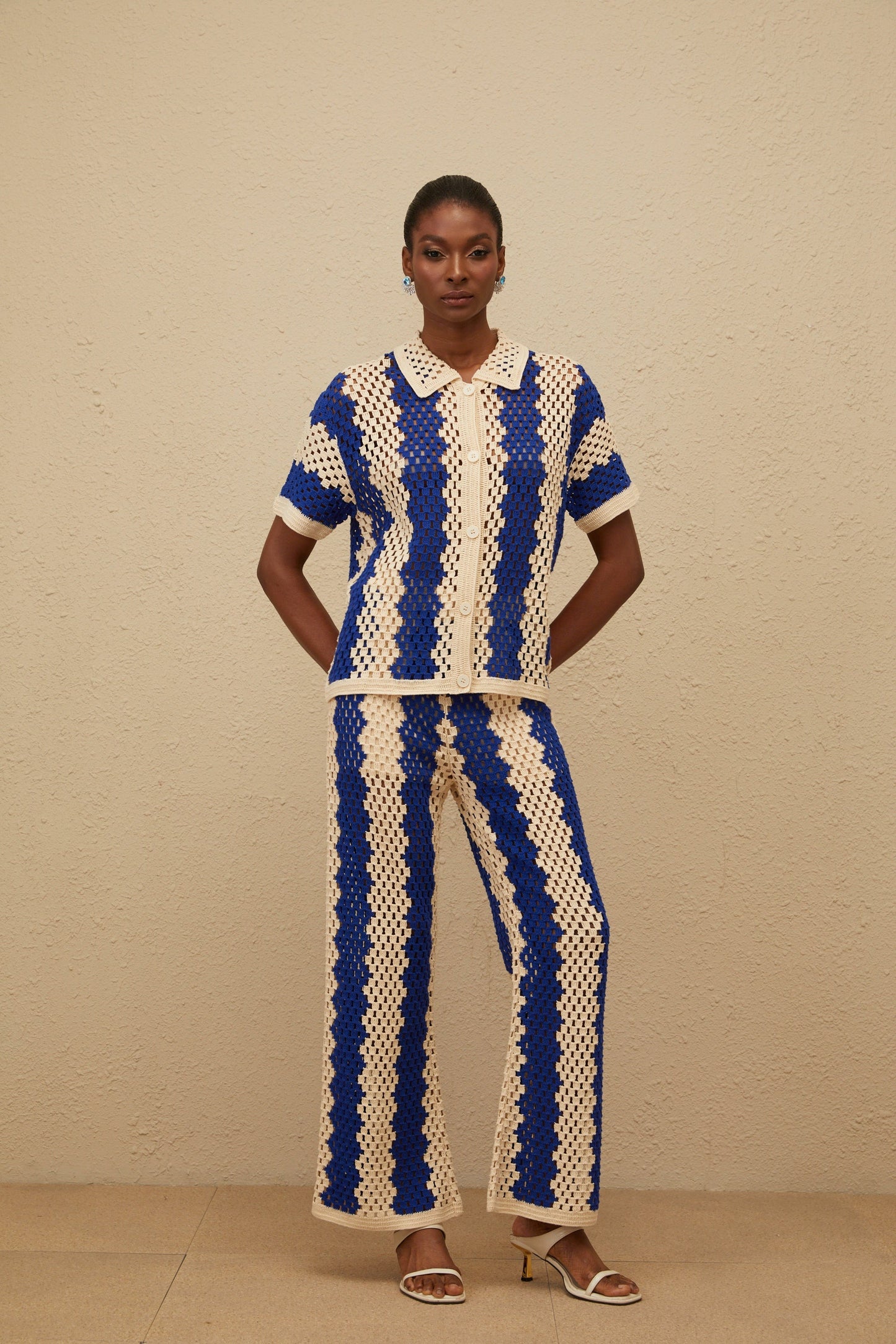 Océane Blue Cutout Crochet Knit Shirt & Trousers Set