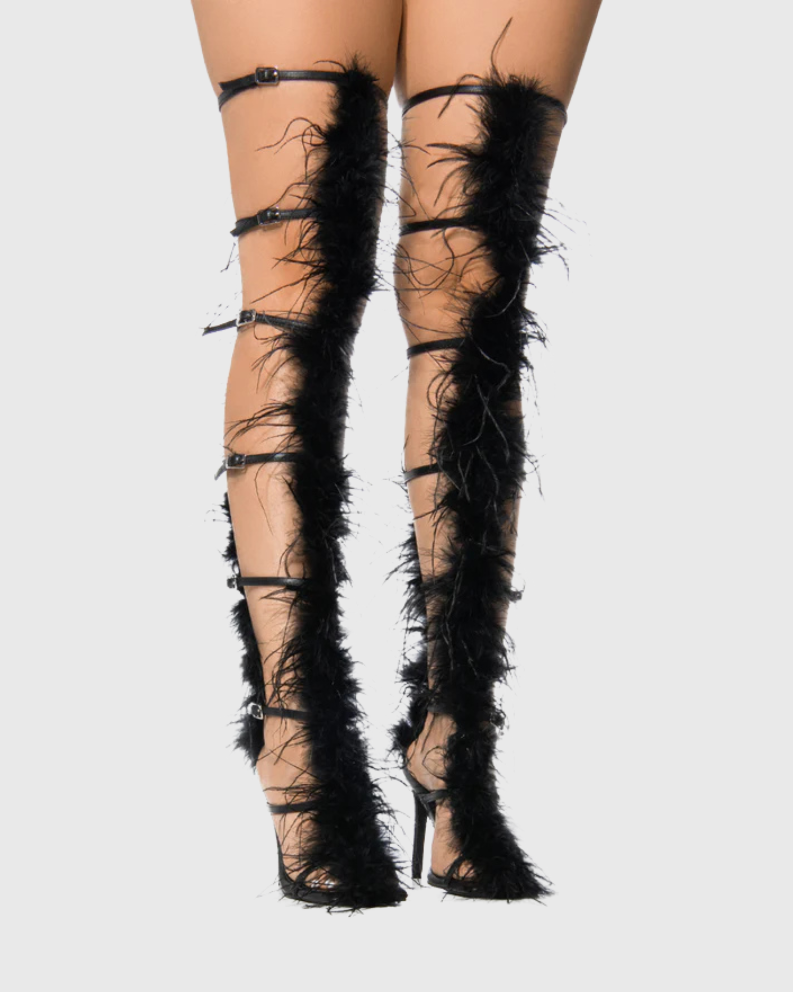 Step into elegance with the Oliva Feather Strappy Heels in Black. These heels combine delicate feather accents with sleek straps, creating a striking silhouette that elevates any outfit. Perfect for special occasions or a night out, they offer both style and confidence. Make a bold statement with every step in these uniquely designed heels.