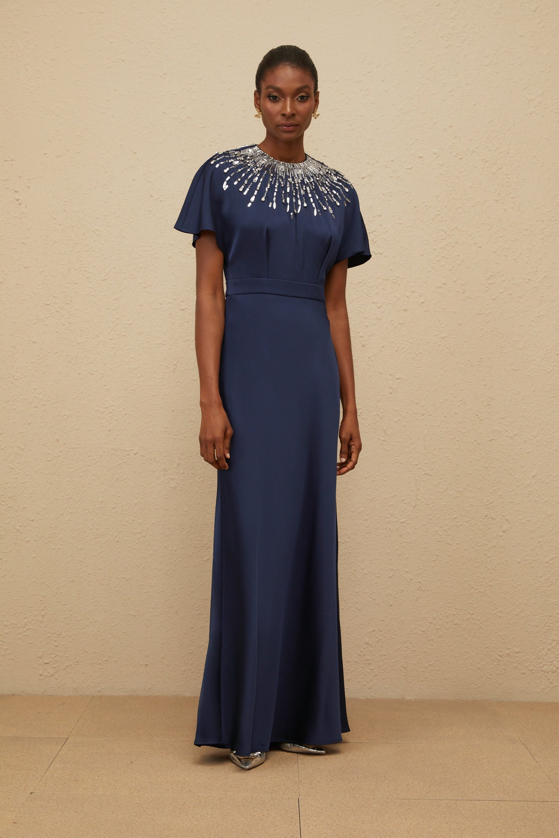 Ombrage Blue Embellished Satin Maxi Dress
