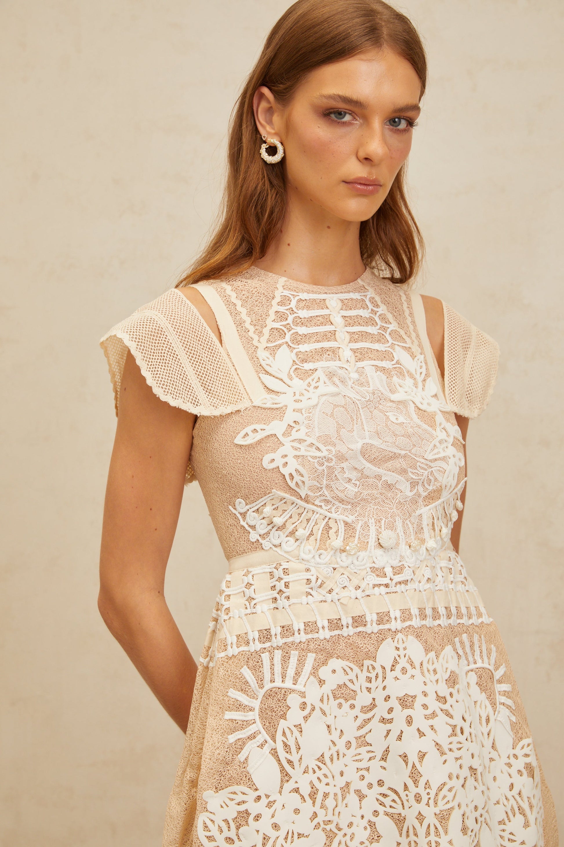 Ophélie Neutral Beaded Floral Crochet Mini Dress