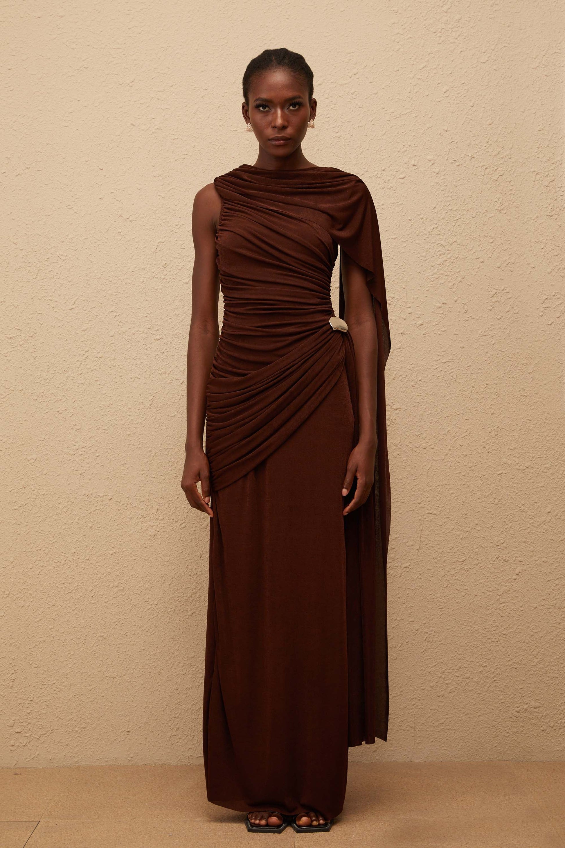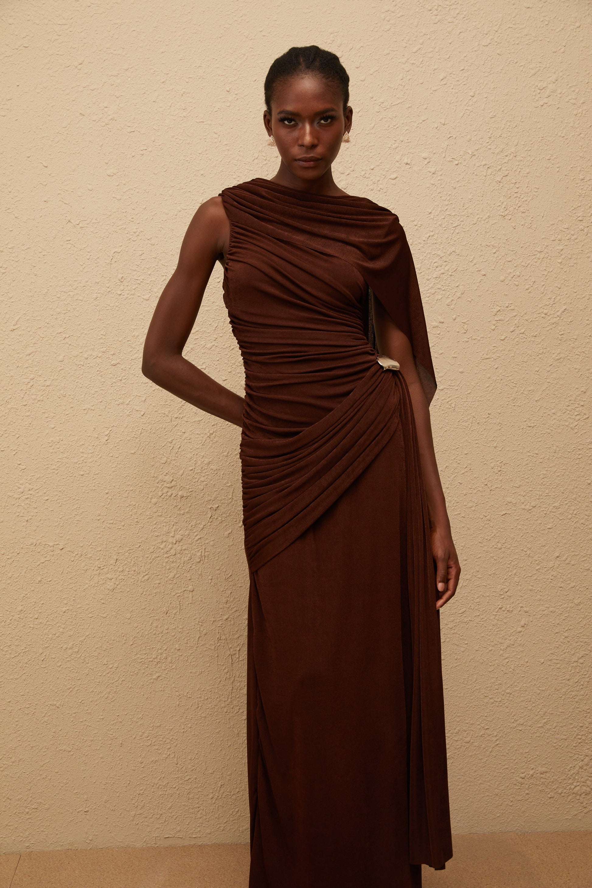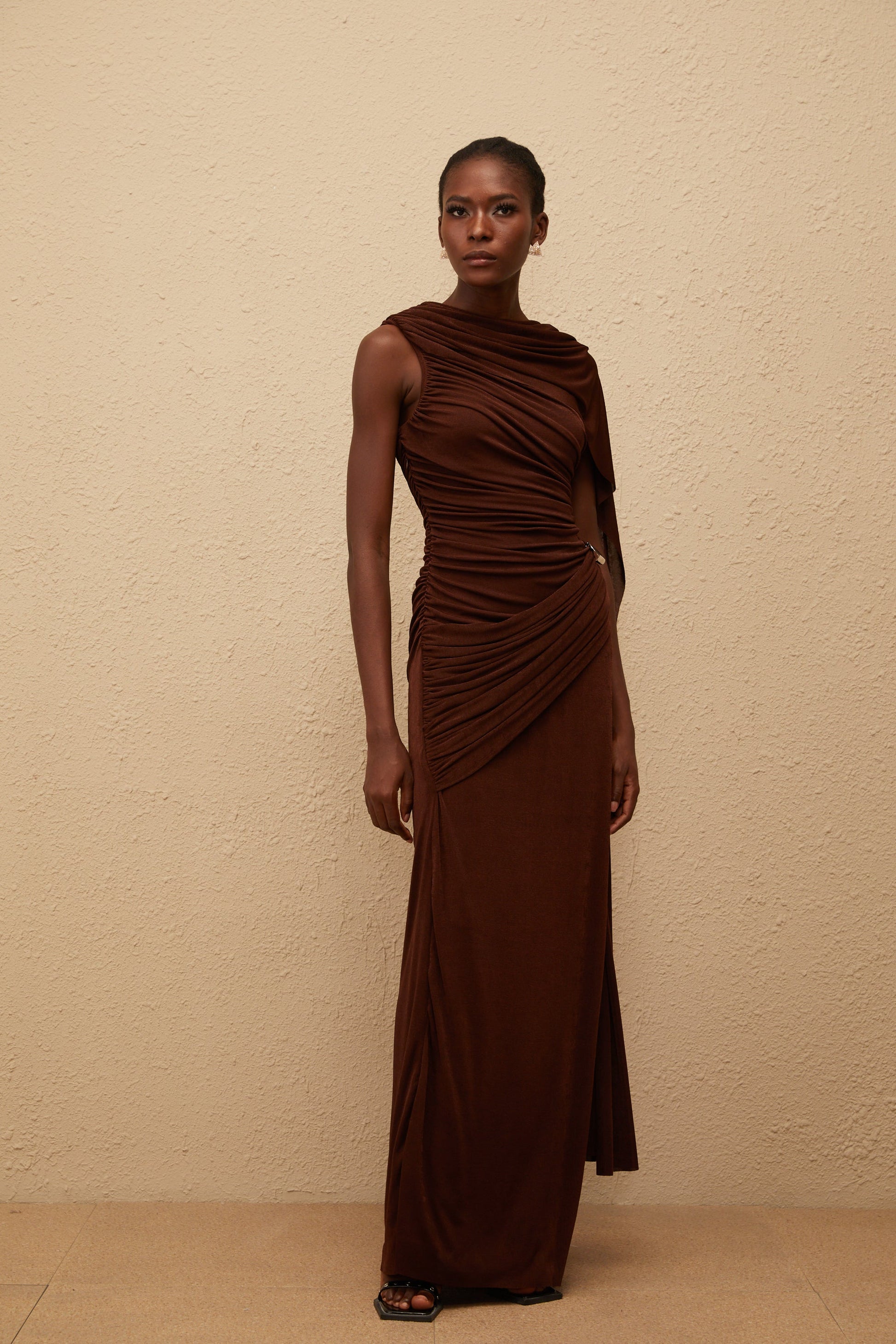 Paloma Brown Sleeveless Asymmetrical Ruched Knit Maxi Dress