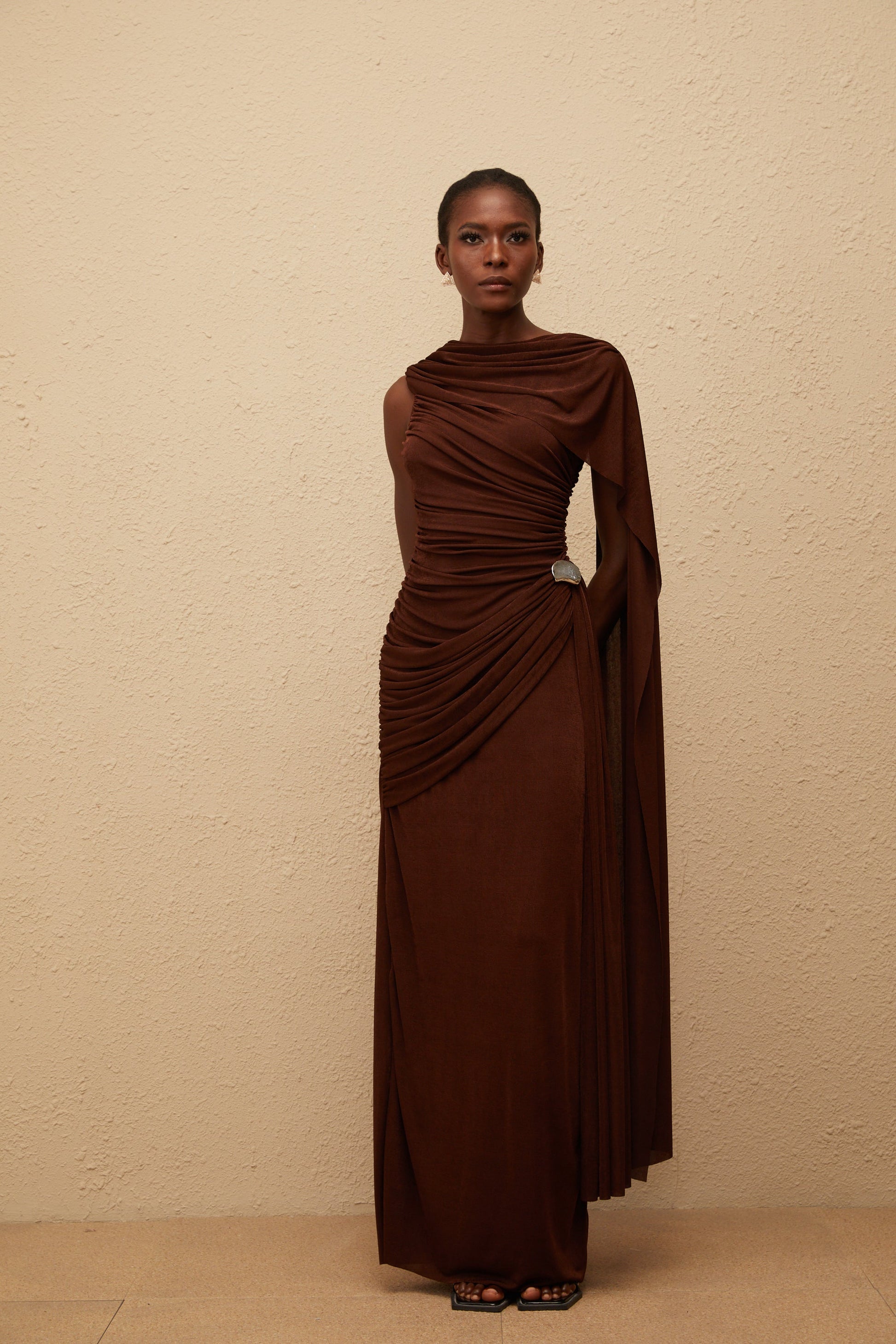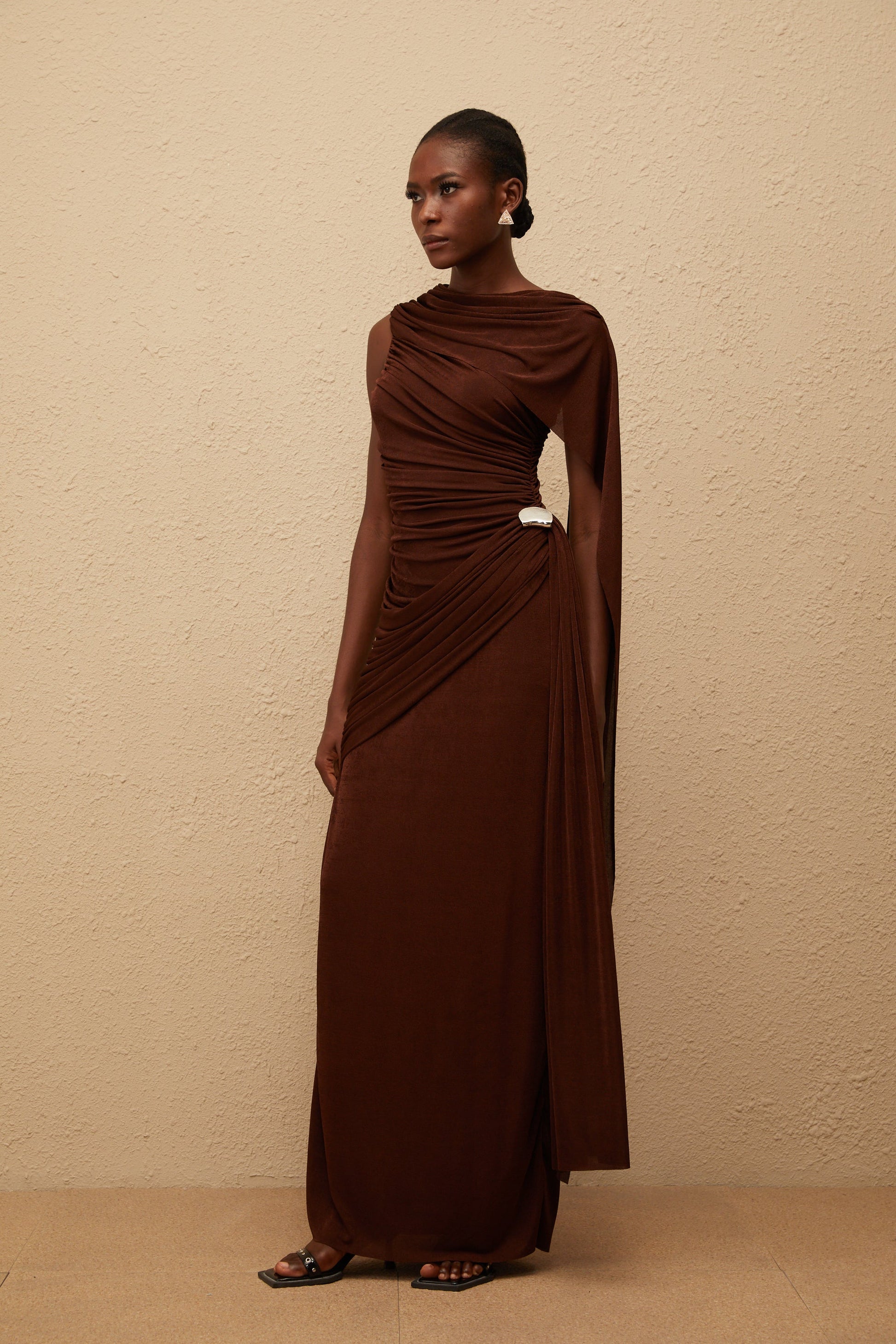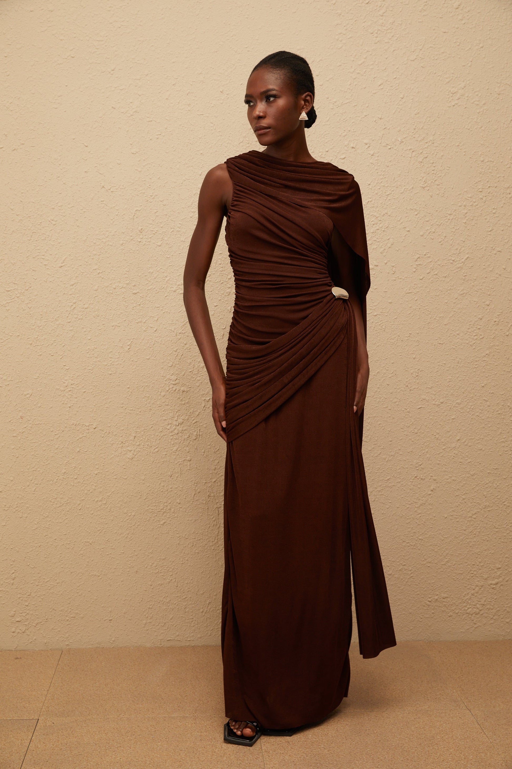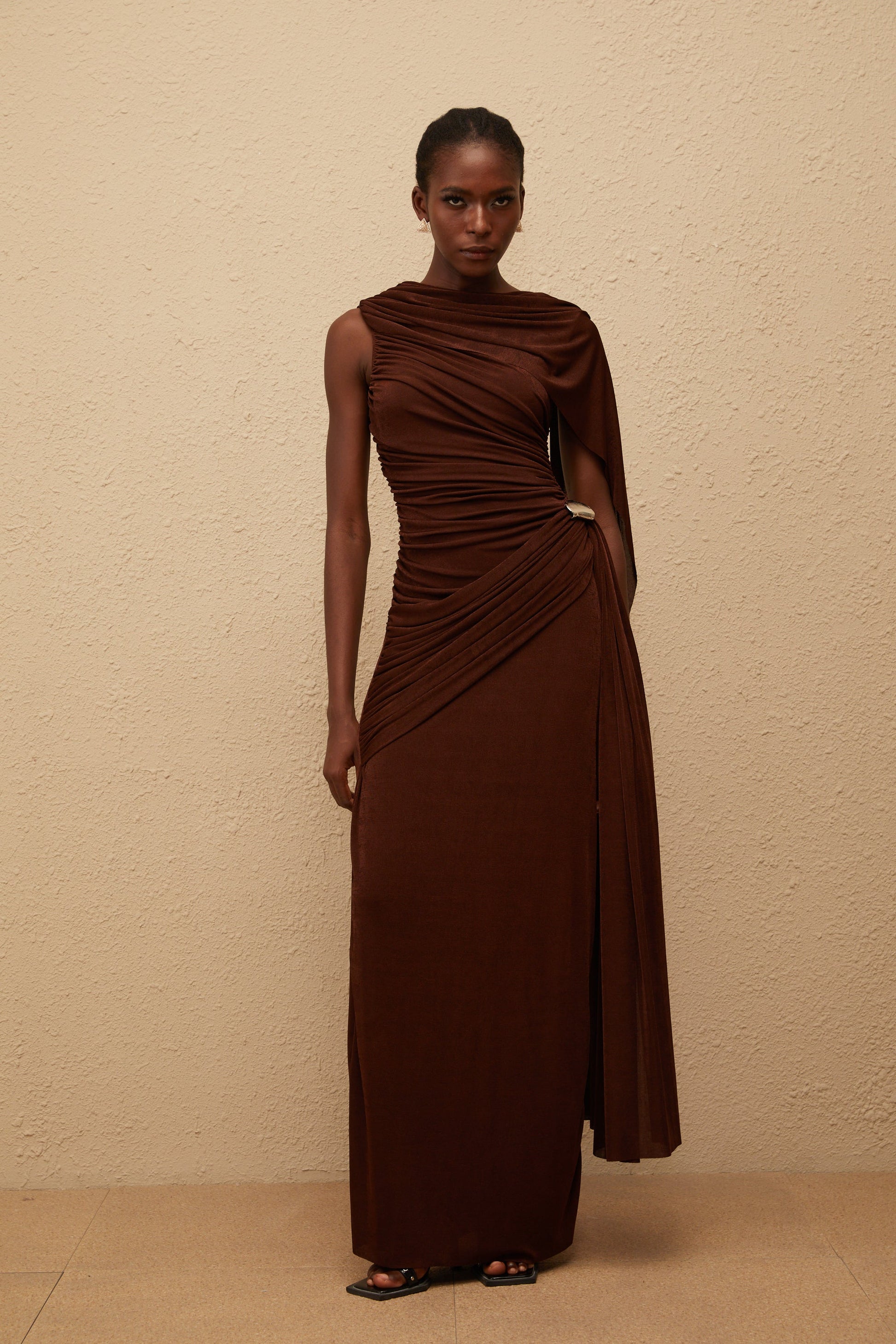 Paloma Brown Sleeveless Asymmetrical Ruched Knit Maxi Dress