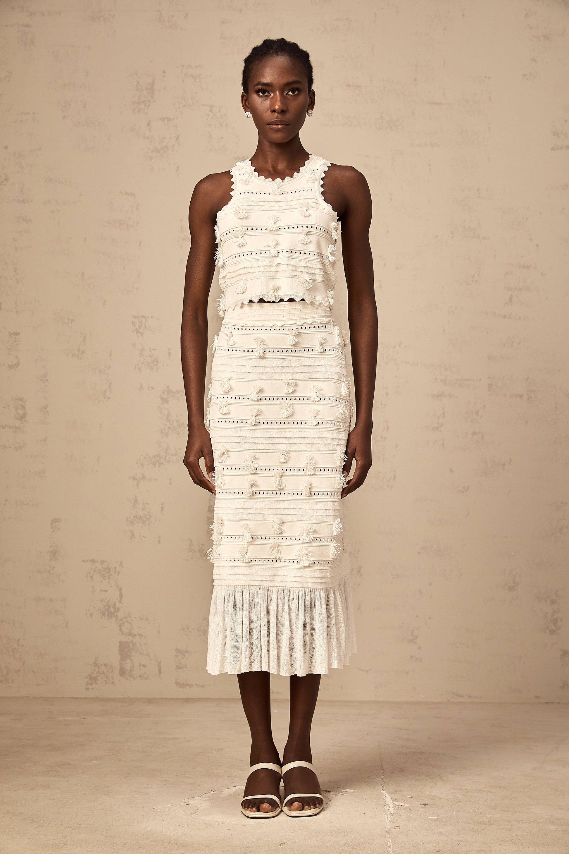 Paola white pointelle-trim knit top & skirt matching set