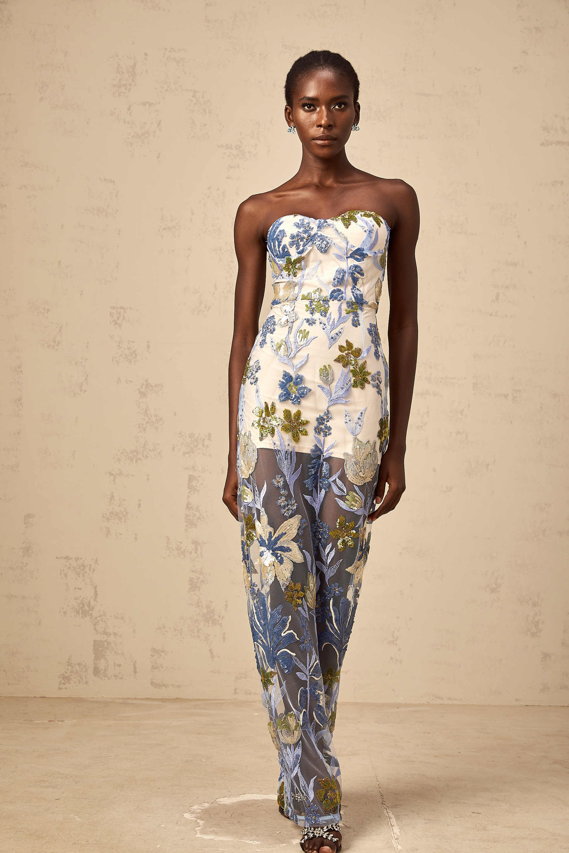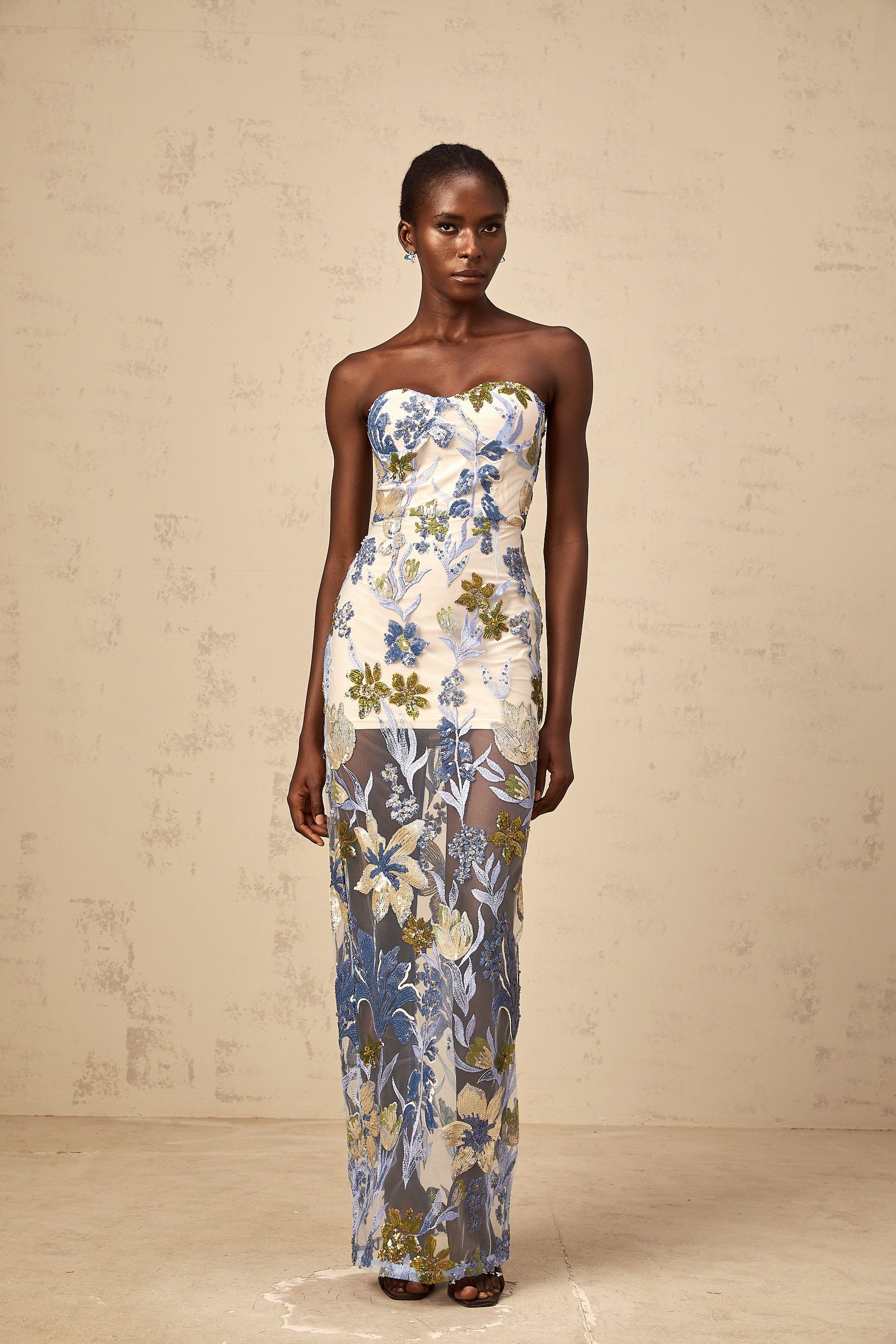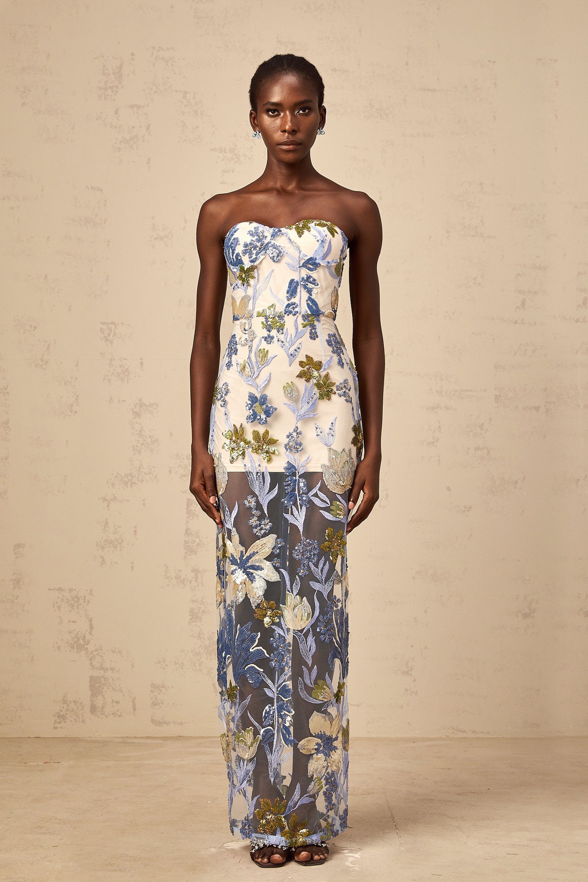 Patricia blue sequined flower-embroidered corset tulle maxi dress